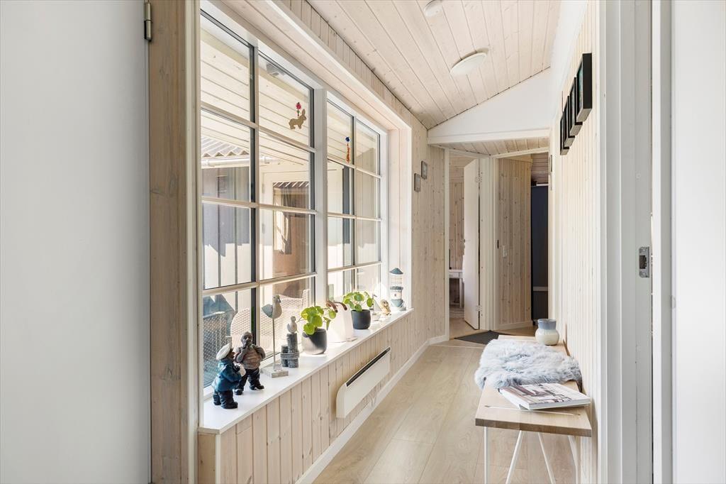 Flot indrettet sommerhus med en god fordeling af husets soverum. Via terrassen træder man ind i husets entre, som er en gang, der kombinerer husets største soverum med resten af huset. Det veludstyrede køkken og den hyggelige stue er kombineret. Der er god spiseplads, et skønt sofahjørne og fra alle husets vinduer kan den skønne udsigt over grunden nydes. Der er i alt tre soverum, tre rum med dobbeltsenge og en hems med et par madrasser. Der er to badeværelser med bruser og det ene har vaskemaskine.