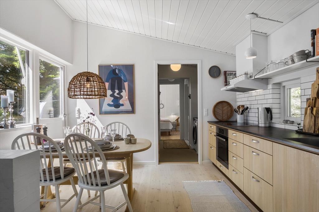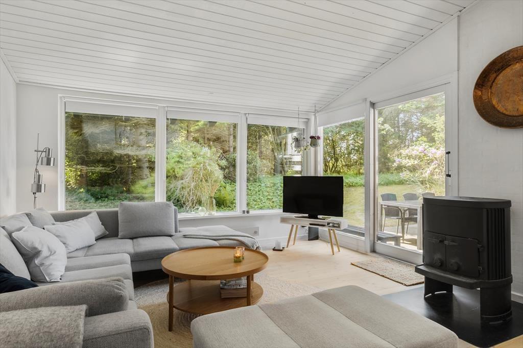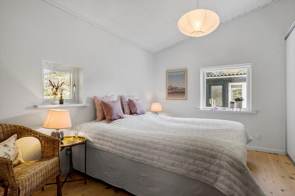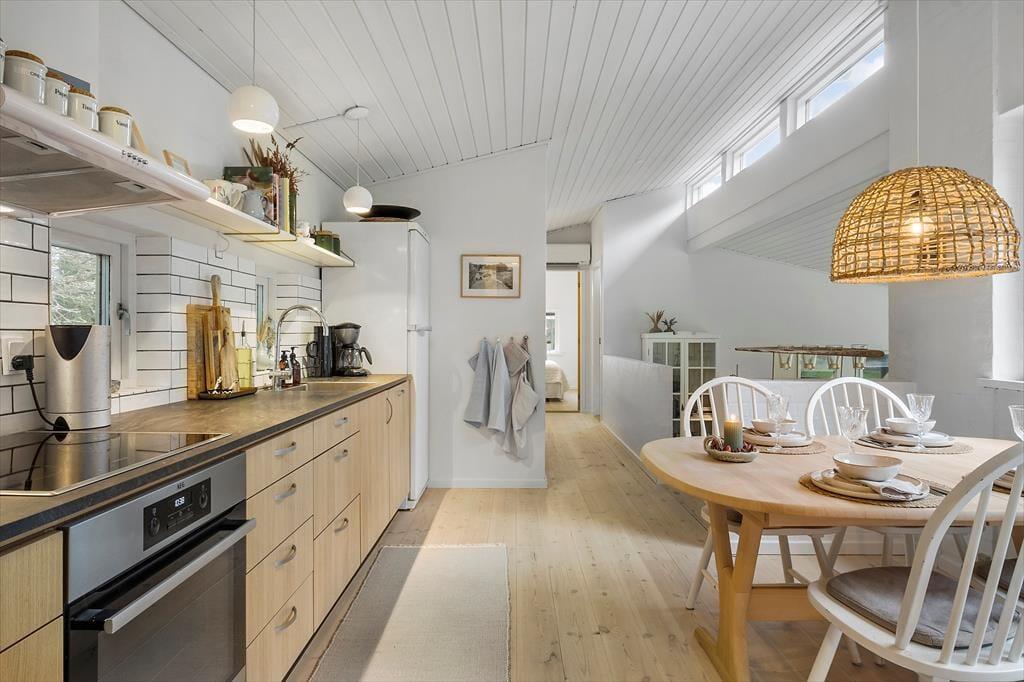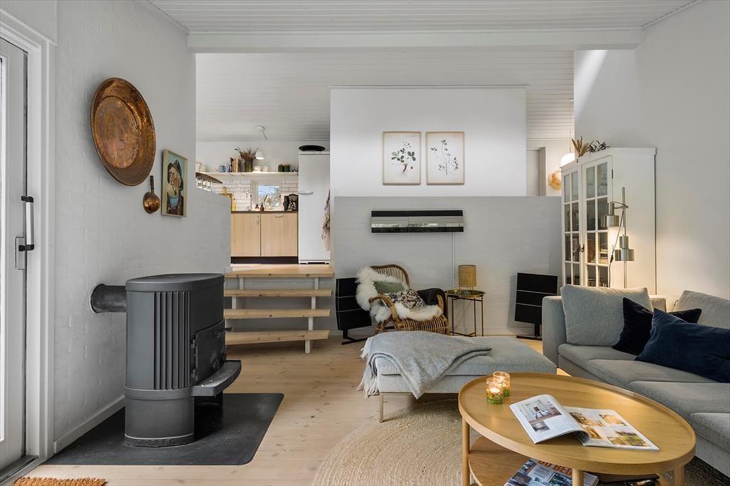 Huset er omsorgsfuldt renoveret i 2019, og inden døre er der fundet en rigtig god balance mellem originale detaljer og moderne opdateringer. Resultatet er et gennemført indbydende sommerhus med lyse og stemningsfulde rum, man har lyst til at opholde sig i. Et af husets charmetræk er, at det er opført i flere niveauer, så fra husets spisekøkken er der åben forbindelse med trappe ned til en dejlig stue, der har brændeovn og udsigt til den grønne have. Der er for øvrigt også trappe ned til et af husets tre soveværelser, som alle er indrettet med komfortable dobbeltsenge. Endelig byder planløsningen på et badeværelse og et bryggers med vaskemaskine.