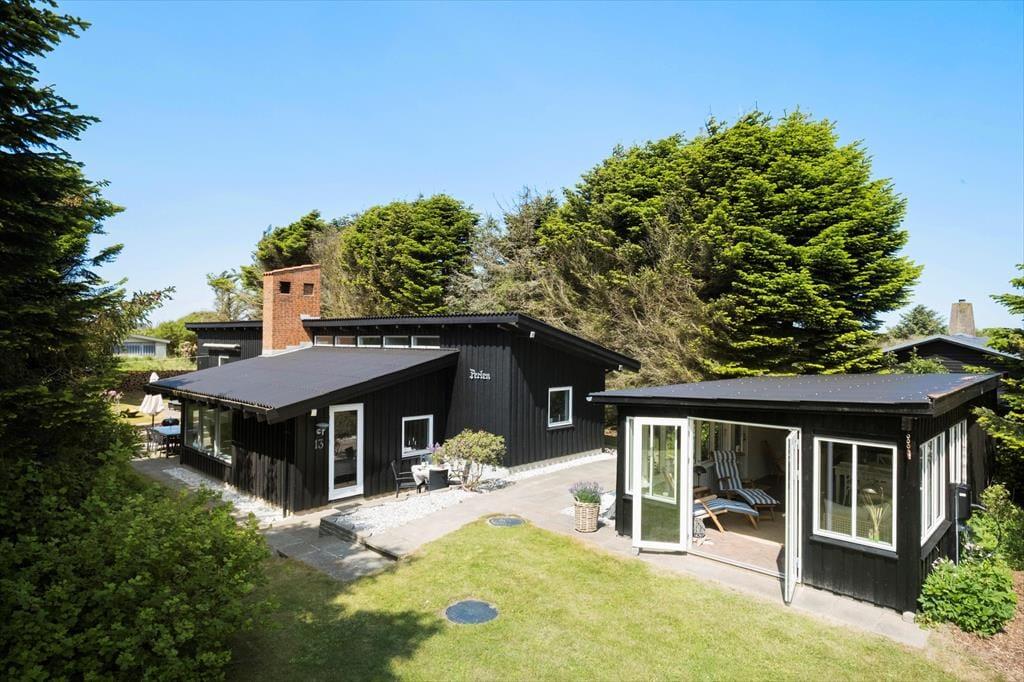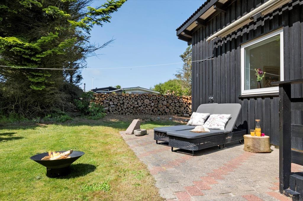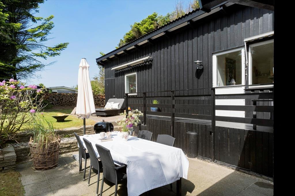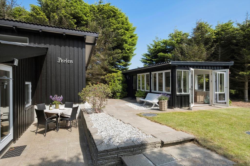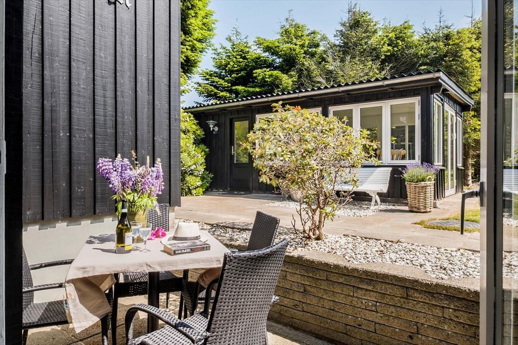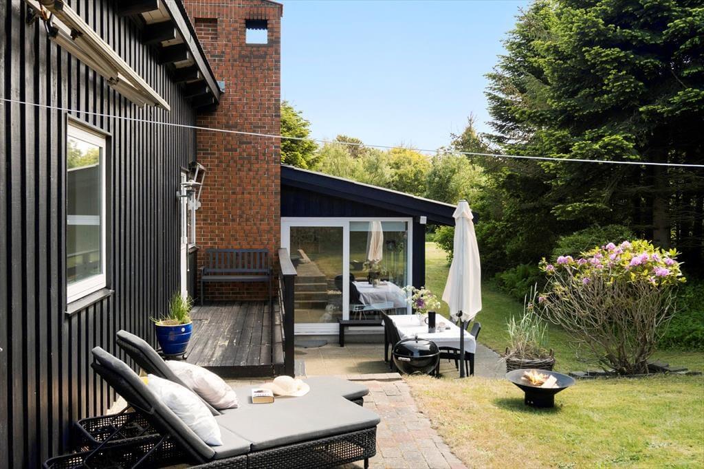 Haven, som omkranser huset, er ugeneret takket være den tætte randbeplantning. Nåletræer, rododendron og andre grønne vækster sørger for, at I har noget kønt at kigge på, når I nyder det tilbagelænede ferieliv på terrassen. I den store have er der flere terrasser at vælge imellem, så I kan slå jer ned lige der, hvor solforholdene er perfekte.