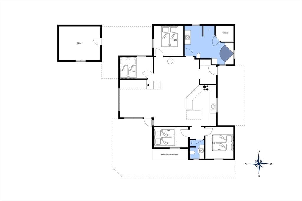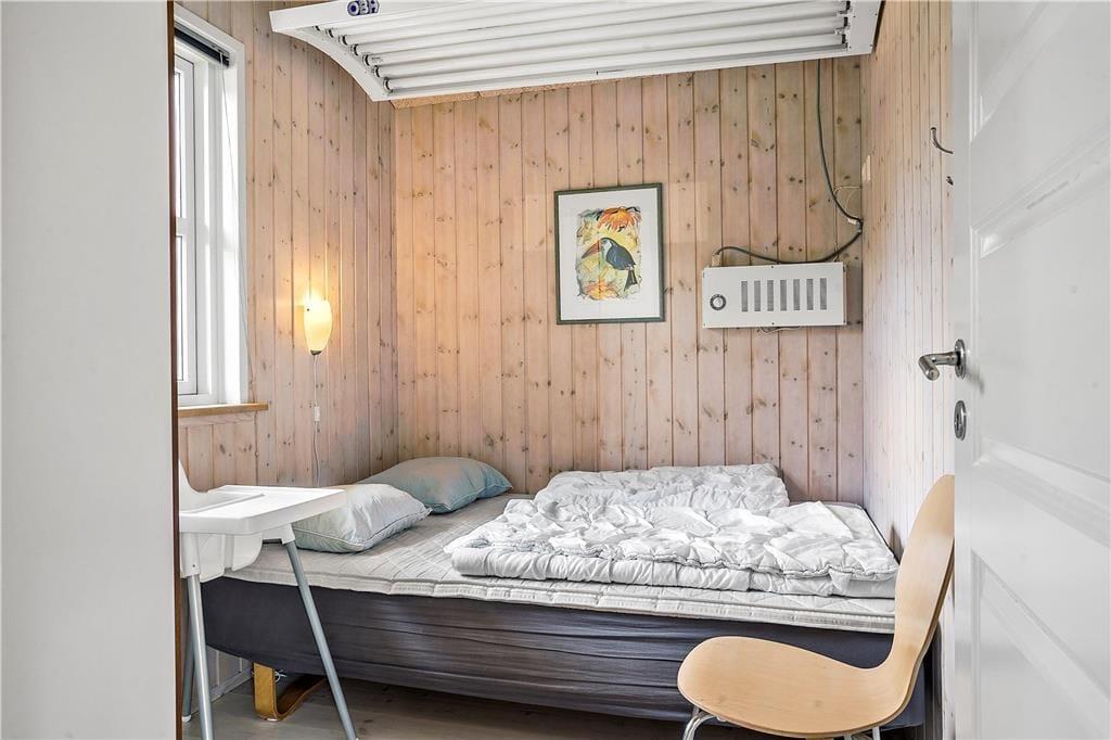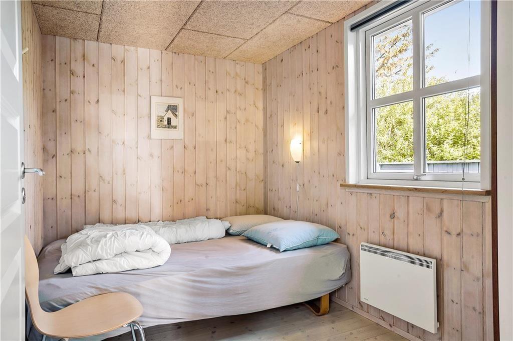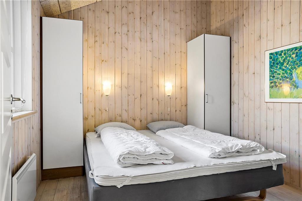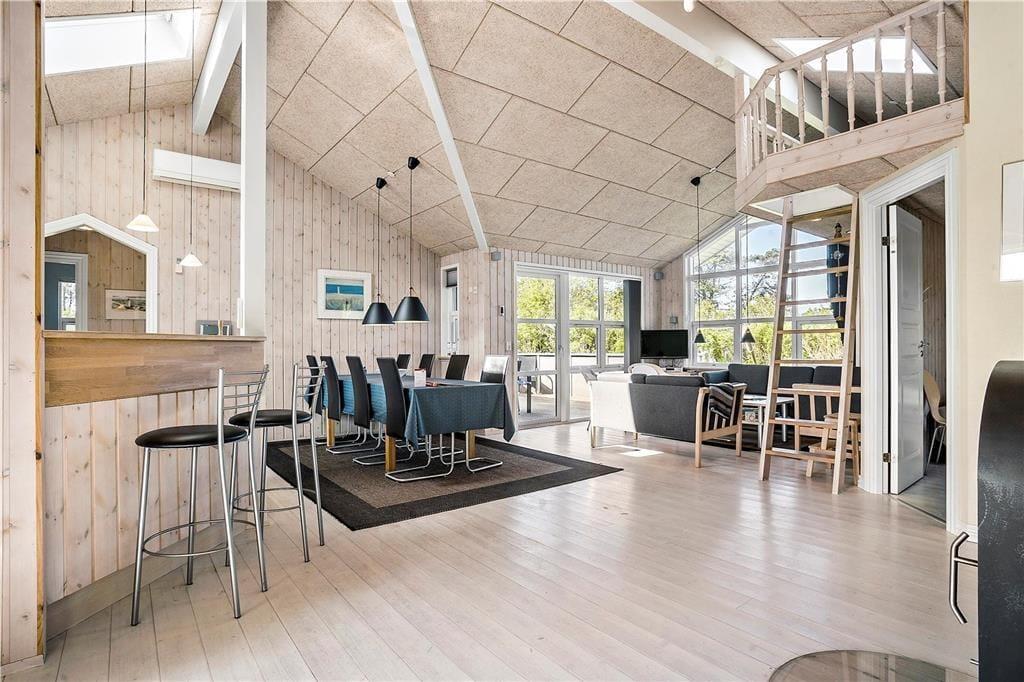 117 m2 får I at brede jer på inden døre i det lyst indrettede hus, der er opført i 2005. Alle rum fremstår pæne og velholdte, og som en praktisk detalje er planløsningen god. Fire soveværelser og to badeværelser er nemlig placeret ligeligt i begge ender af huset – hvilket for eksempel er rart, hvis I er to familier, der vil holde ferie sammen. Centralt i ferieboligen ligger opholdsrummet, hvor køkkenet er integreret med stuen. Her er en god loftshøjde og en behagelig atmosfære, og de store vinduespartier sørger for et godt lysindfald og giver udsigt til den grønne have.