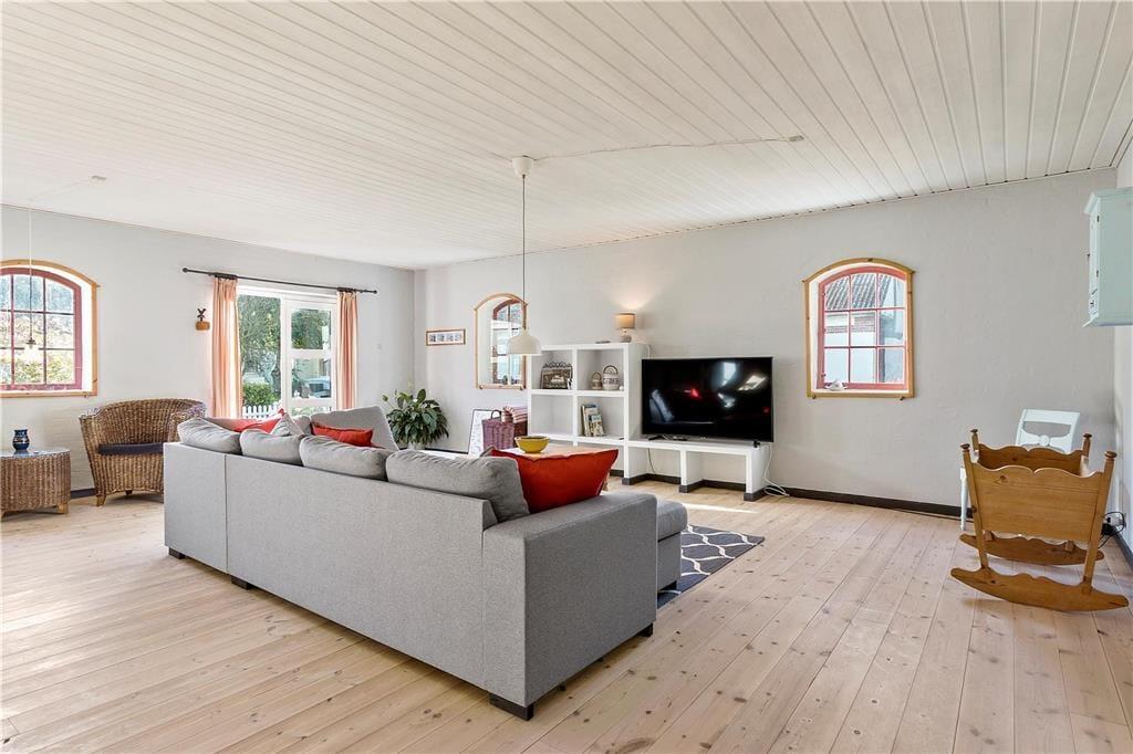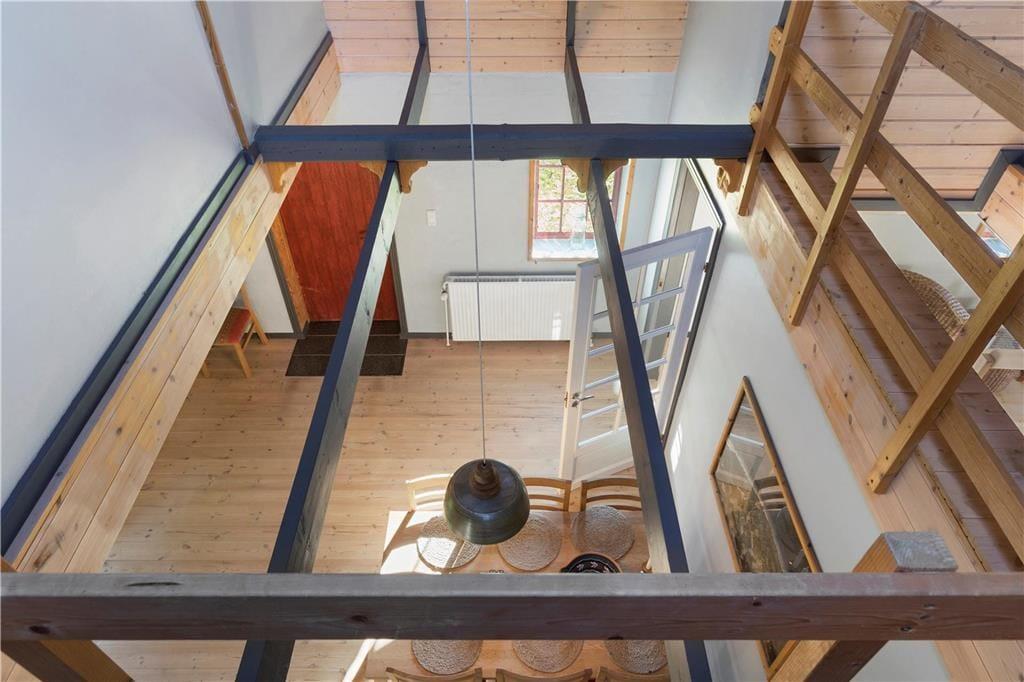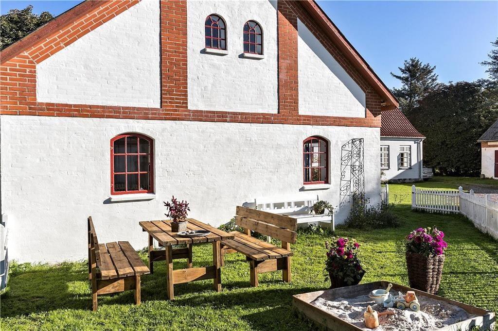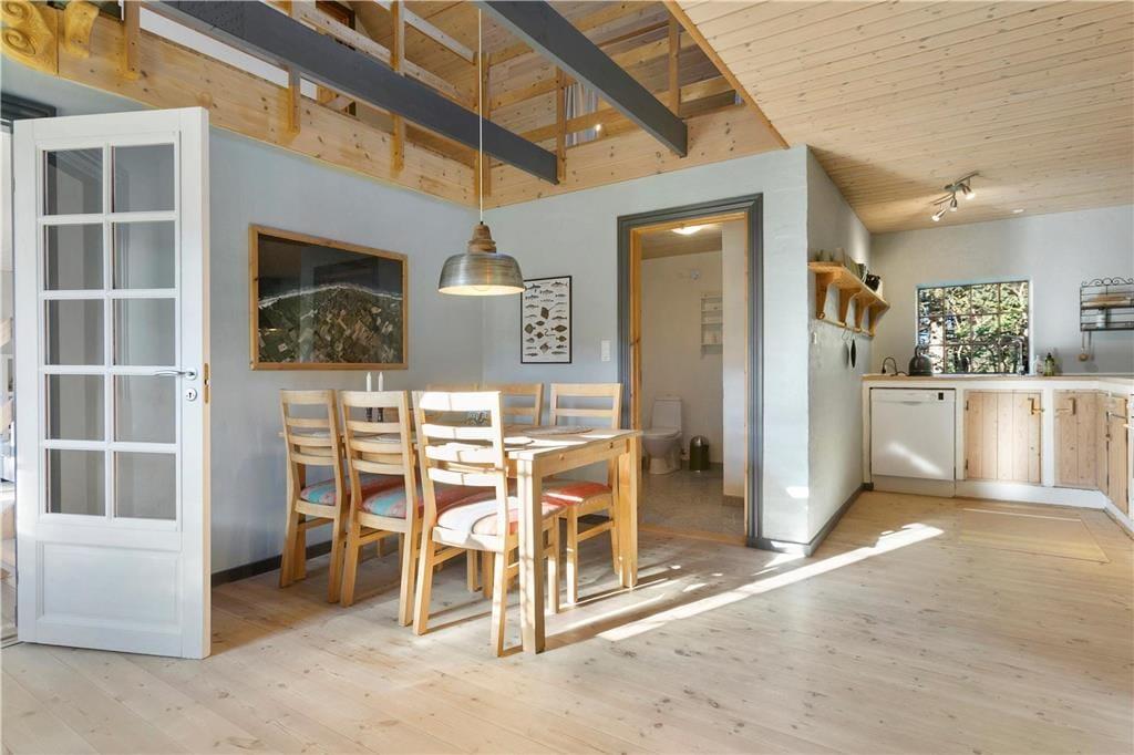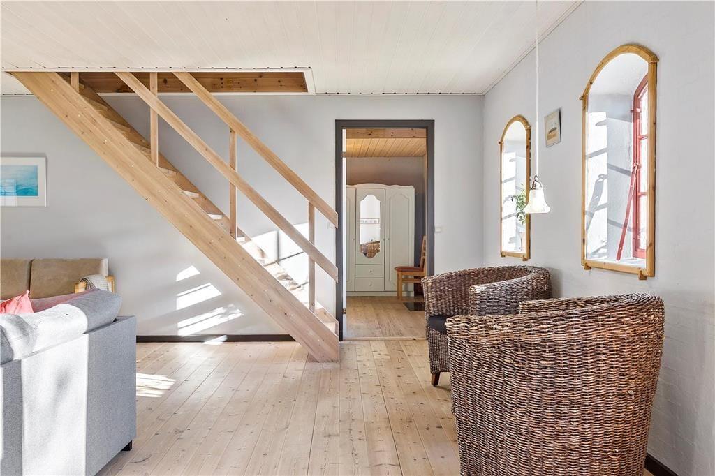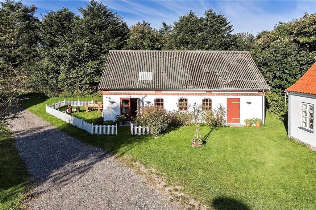 En gang rummede feriehuset gårdens traktorer og øvrige maskiner, og den oprindelige charme var det vigtigt for gårdens familie at bevare, da de besluttede sig for at indrette et feriehus. Derfor allierede de sig med en dygtig arkitekt og en lokal snedker med sans for detaljerne. Det er der kommet et helt særligt feriehus på 130 kvm ud af, skræddersyet til at danne rammen om jeres ferieoplevelser. Feriehuset er i to etager og rummer en stor stue og et lækkert køkken-alrum med brudt etageadskillelse og ovenlysvindue. Køkkenet har opvaskemaskine, mikrobølgeovn, ovn, komfur, køleskab og fryser. Feriehuset er i det hele taget indrettet med charme og opmærksomhed for detaljer. Indretningen er velgennemtænkt og farverne er afstemt. På 1. salen finder man et stort lækket soveværelse med dobbeltseng og et mindre værelse med 2 enkeltsenge. Hertil kommer en hyggelige og charmerende alkove.