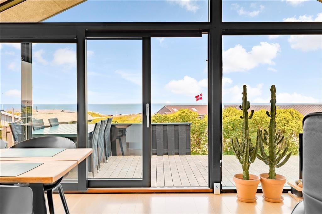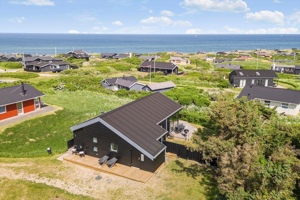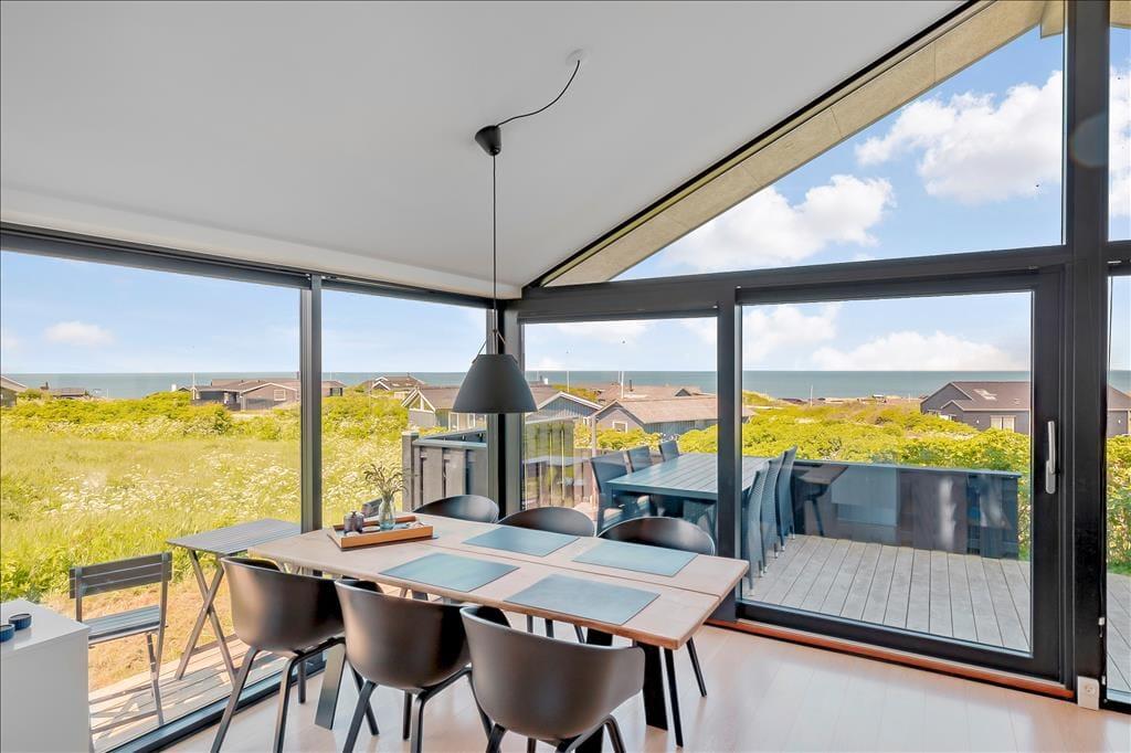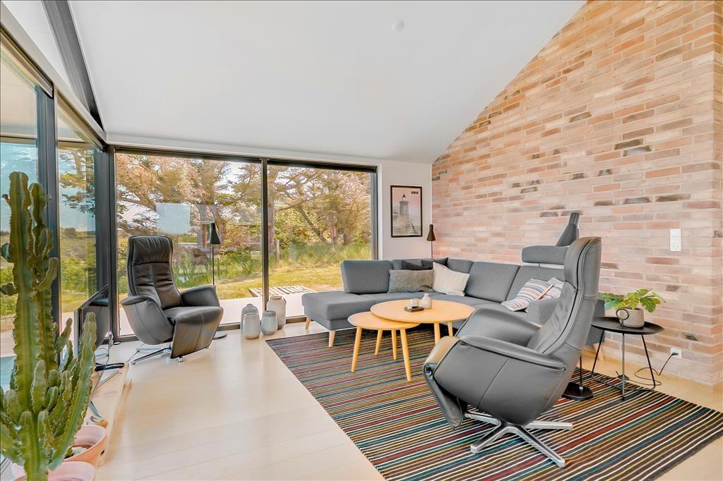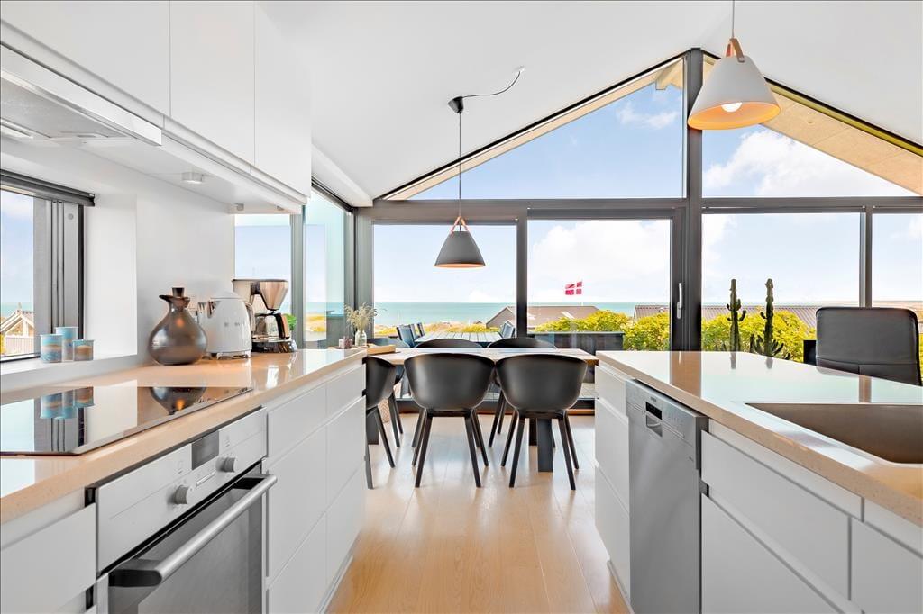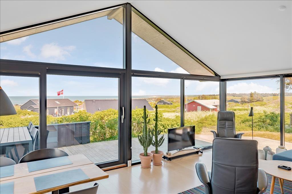 Sommerhuset ligger højt i landskabet, og netop derfor er havudsigten så fantastisk. Det smukke vue er der selvfølgelig taget højde for i arkitekturen, så opholdsafdelingen prydes af panoramavinduer, så I kan se hele den smukke kyststrækning – ja, helt fra Hirtshals Fyr og til Rubjerg Knude Fyr i klart vejr. De store glaspartier er ikke eneste lækre detalje, for der er tale om et arkitekttegnet Sonne-hus fra 2017, der har en lys og lækker indretning og en smart planløsning til seks feriegæster. Opholdsafdelingen består af stue og køkken i åben forbindelse, og derudover byder planløsningen på et flot badeværelse og tre dejlige soveværelser.