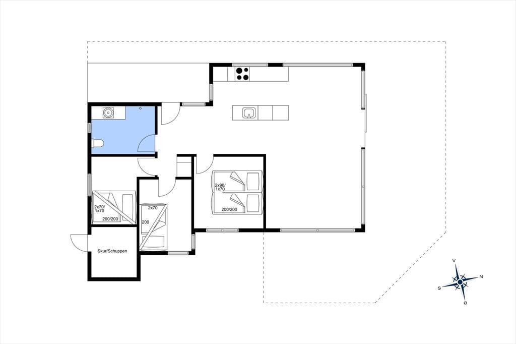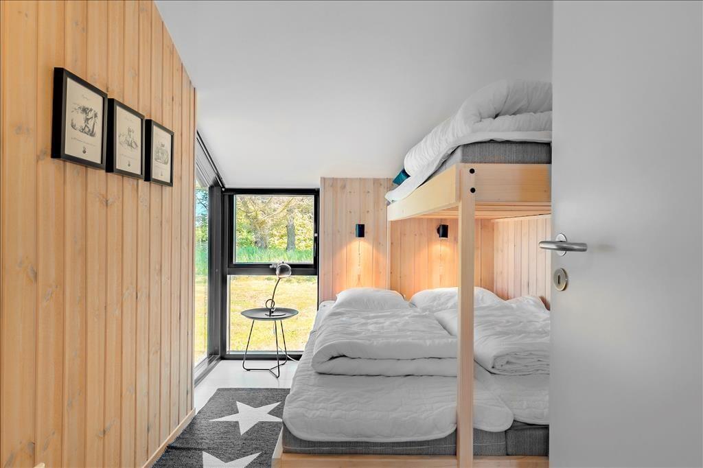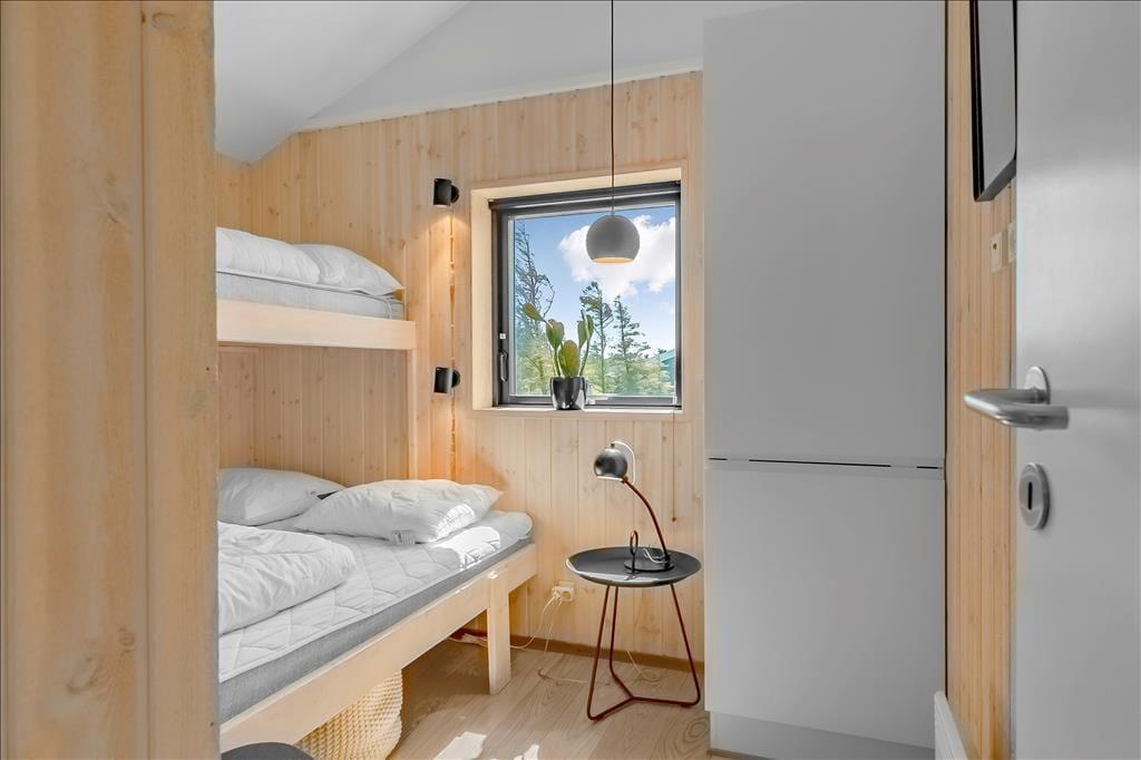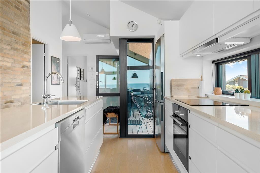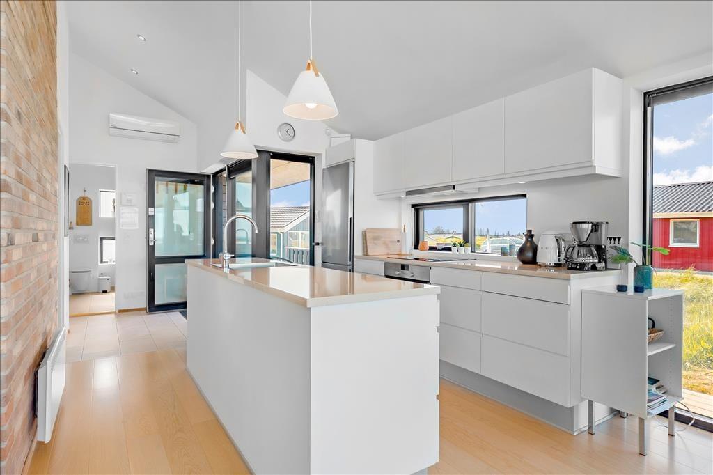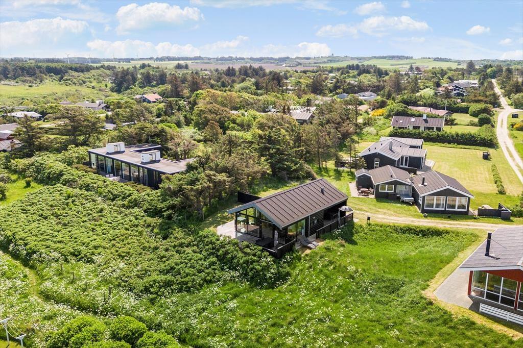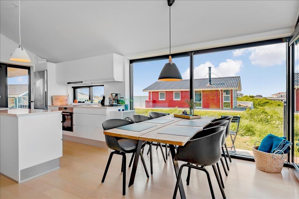 Sommerhuset ligger højt i landskabet, og netop derfor er havudsigten så fantastisk. Det smukke vue er der selvfølgelig taget højde for i arkitekturen, så opholdsafdelingen prydes af panoramavinduer, så I kan se hele den smukke kyststrækning – ja, helt fra Hirtshals Fyr og til Rubjerg Knude Fyr i klart vejr. De store glaspartier er ikke eneste lækre detalje, for der er tale om et arkitekttegnet Sonne-hus fra 2017, der har en lys og lækker indretning og en smart planløsning til seks feriegæster. Opholdsafdelingen består af stue og køkken i åben forbindelse, og derudover byder planløsningen på et flot badeværelse og tre dejlige soveværelser.