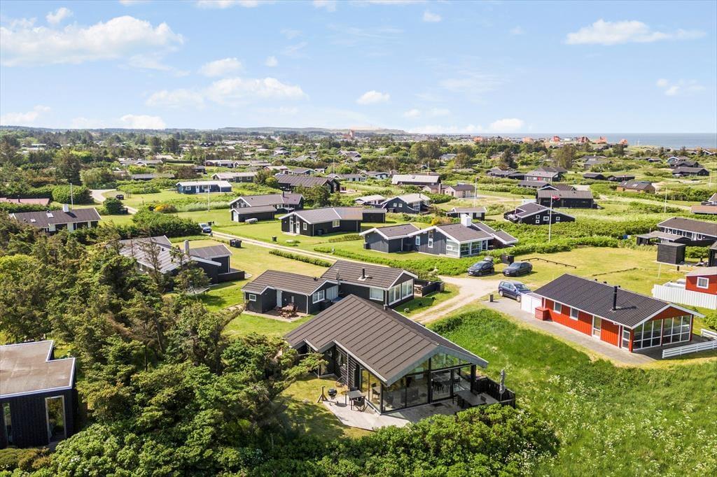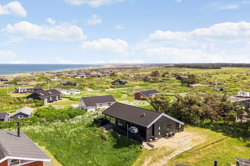 Sommerhuset ligger ikke bare flot, men også fredeligt, for den lille Hybenvej ender blindt. Giver synet af Vesterhavet jer lyst til en strandtur, kan I nemt spadsere til kysten, og vil I på café eller købe ind, er der blot halvanden kilometer til Lønstrups bymidte. I Lønstrup har I også rig mulighed for at kigge på kunst, for det tidligere fiskerleje er nu kendt for sine mange gallerier og butikker med kunsthåndværk, og der er også mulighed for at kigge ind i et glaspusteri eller andre værksteder, hvor I kan se arbejdet tage form. Fra sommerhuset har I desuden nem adgang til Skallerup Seaside Resort og dejlige udflugtsmål som Rubjerg Knude Fyr og Mårup Kirke-ruinen.