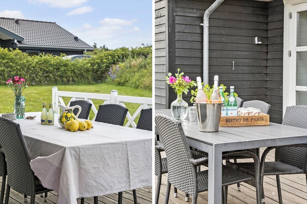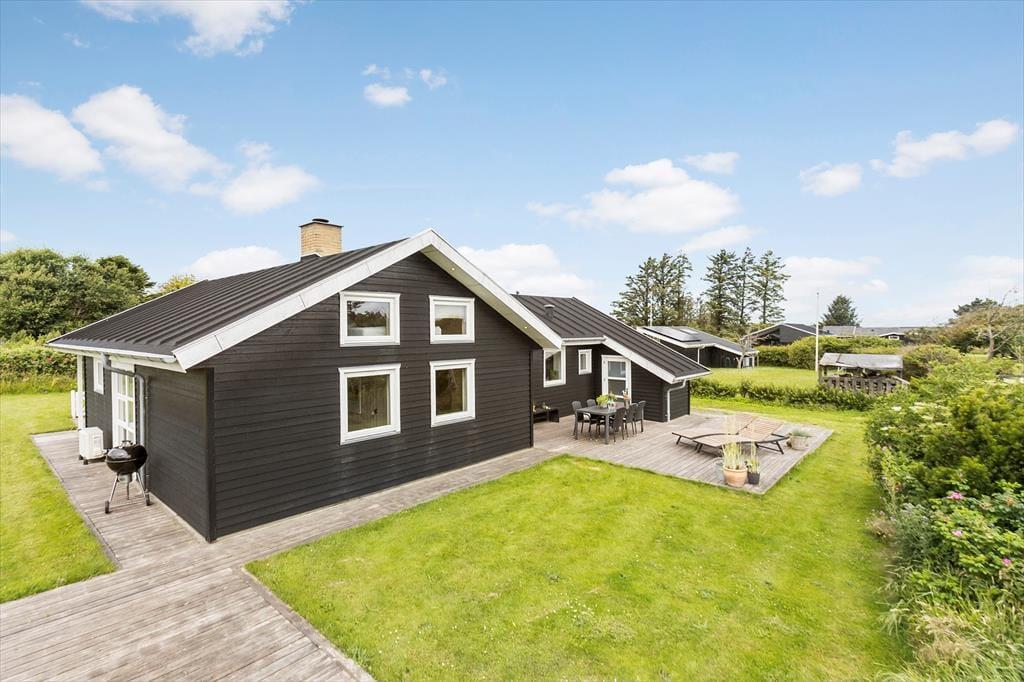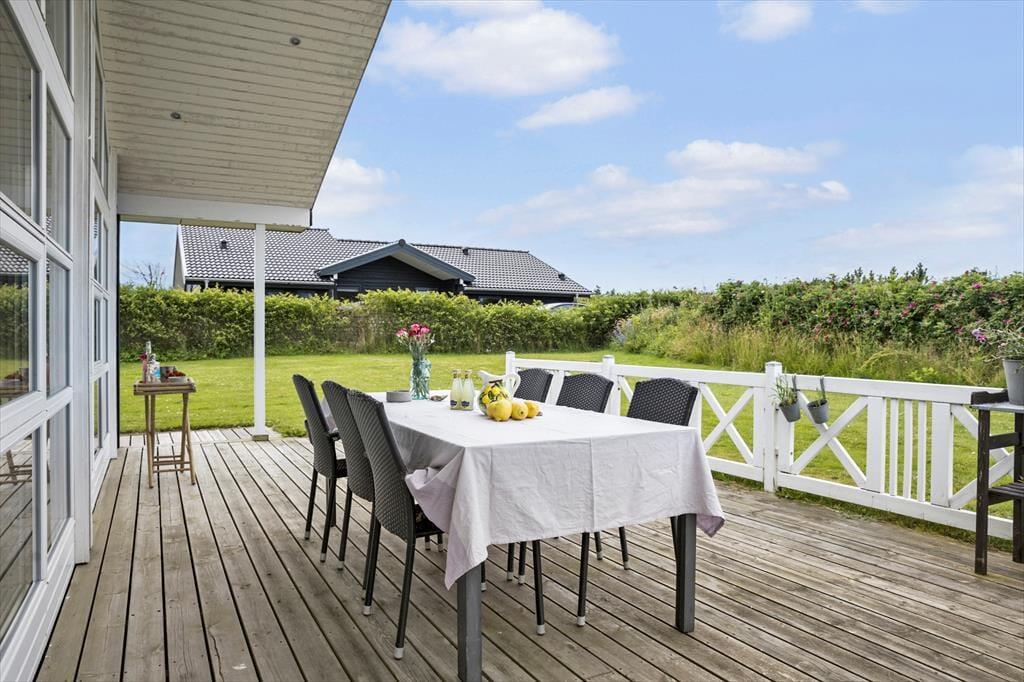 Sommerhuset ligger på en flot havegrund med en dejlig græsplæne, hvor der er masser af plads til at lege, spille og løbe rundt. Der er terrasser rundt om en stor del af huset og en dejlig overdækket del med udgang fra stuen, hvor man kan nyde de lange, lune sommeraftener. Grill, gode havemøbler og liggestole er til rådighed for gæsterne.