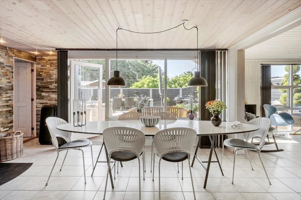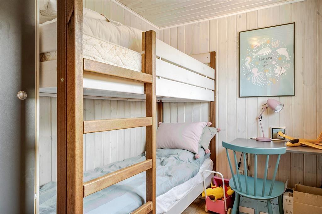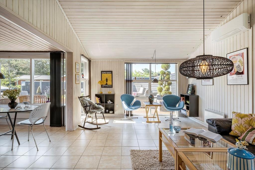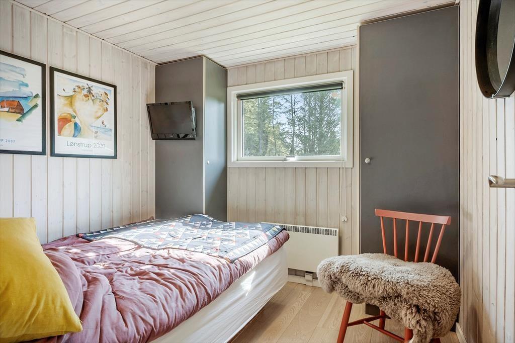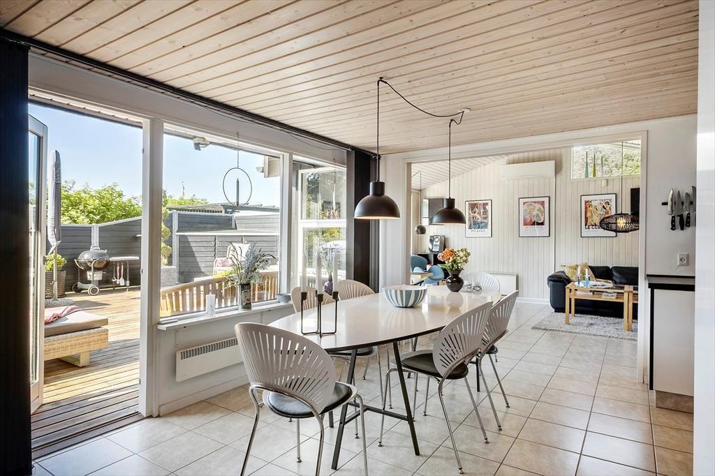 Sommerhuset er lyst og venligt indrettet med smagfulde og moderne møbler, og køkkenet ligger i åben forbindelse med stuen. Her er loft til kip, som sammen med de store vinduer giver et dejligt lysindfald. Sommerhuset har 3 soveværelser, et med dobbeltseng, et med to enkeltsenge og et med køjer. Badeværelset er flot og praktisk indrettet med en stor rummelig bruser, og fra stuen er der udgang til både den vest og den øst-vendte terrasse.
