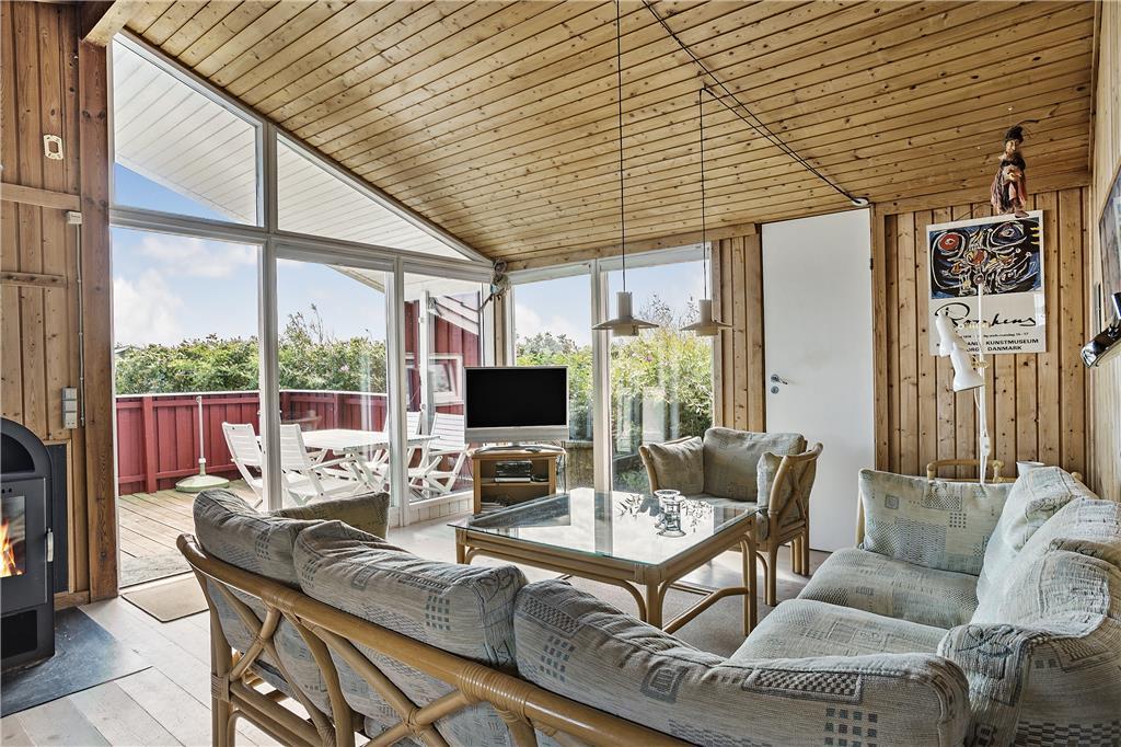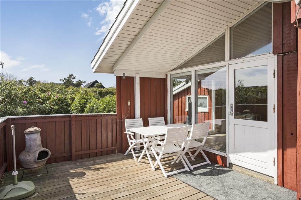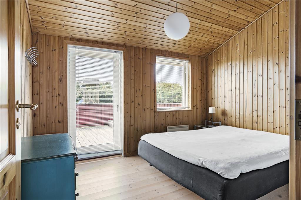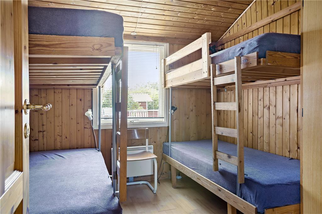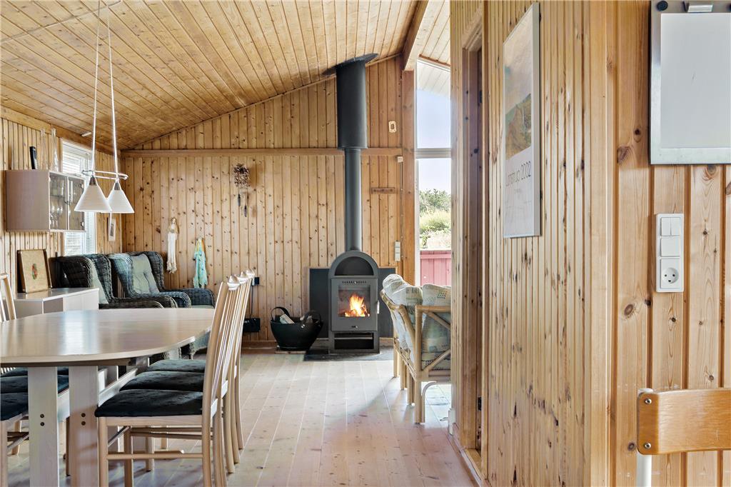 Stuen med en hyggelig sofakrog og brændeovn ligger i åben forbindelse til køkkenet, som har opvaskemaskine og direkte udgang til en terrasse, hvor de tilberedte måltider kan nydes. Der er tre værelser i huset, hvoraf der er dobbeltseng på det ene, en køjeseng på det andet og to køjesenge på det sidste værelse. Her er plads til hele familien, og de mindre børn kan hygge sig og sove sammen i ”hulen” med den dobbelte køjeseng. Badeværelset er pænt og lyst med bruseniche og en vaskemaskine.