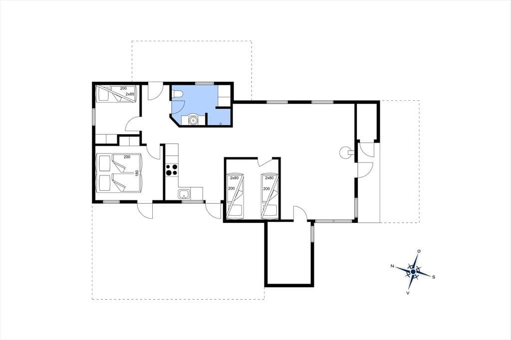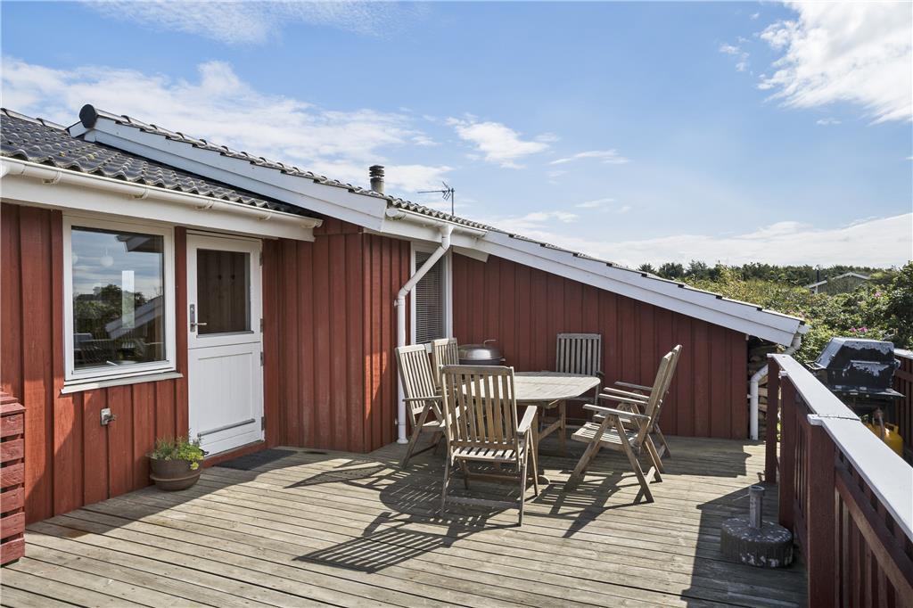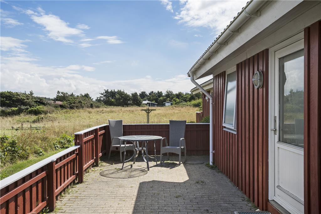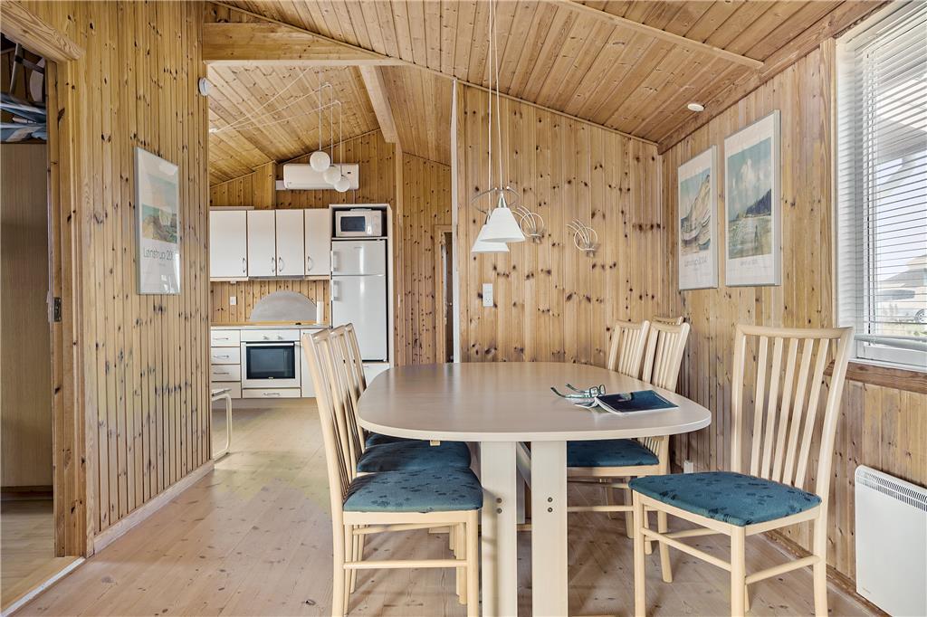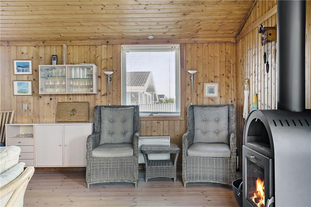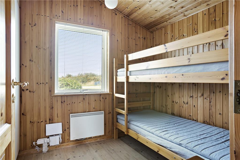 Stuen med en hyggelig sofakrog og brændeovn ligger i åben forbindelse til køkkenet, som har opvaskemaskine og direkte udgang til en terrasse, hvor de tilberedte måltider kan nydes. Der er tre værelser i huset, hvoraf der er dobbeltseng på det ene, en køjeseng på det andet og to køjesenge på det sidste værelse. Her er plads til hele familien, og de mindre børn kan hygge sig og sove sammen i ”hulen” med den dobbelte køjeseng. Badeværelset er pænt og lyst med bruseniche og en vaskemaskine.