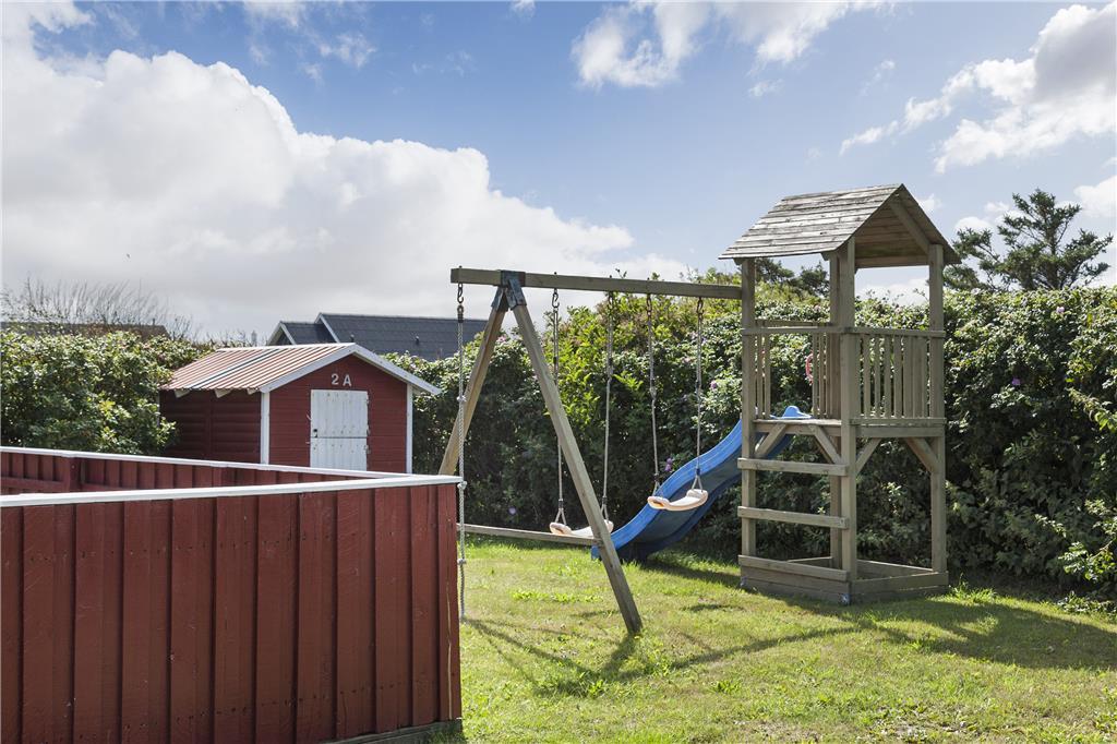 Til sommerhuset er der fine udendørsfaciliteter, blandt andet et legetårn med gynger og rutsjebane, en stor græsplæne med plads til boldspil og leg samt flere gode terrasser, hvor solen kan nydes. Der er naturligvis også en grill, og med den direkte udgang fra køkken til terrasse, så er det oplagt at tilberede flere af feriens måltider udendørs.