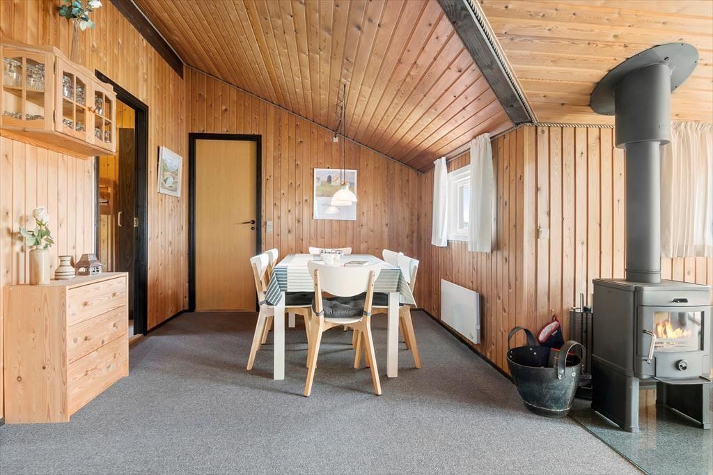 Huset er utrolig velindrettet med åbent køkken til spisestue og opholdsstue, og med brændeovnen centralt placeret i huset er der gode muligheder for hyggestemning, også selvom aftenerne skulle blive lidt kølige. De tre soveværelser med hhv. dobbeltseng, to enkeltsenge og en køjeseng er i nær tilknytning til husets øvrige rum samt det gode og rummelige badeværelse.