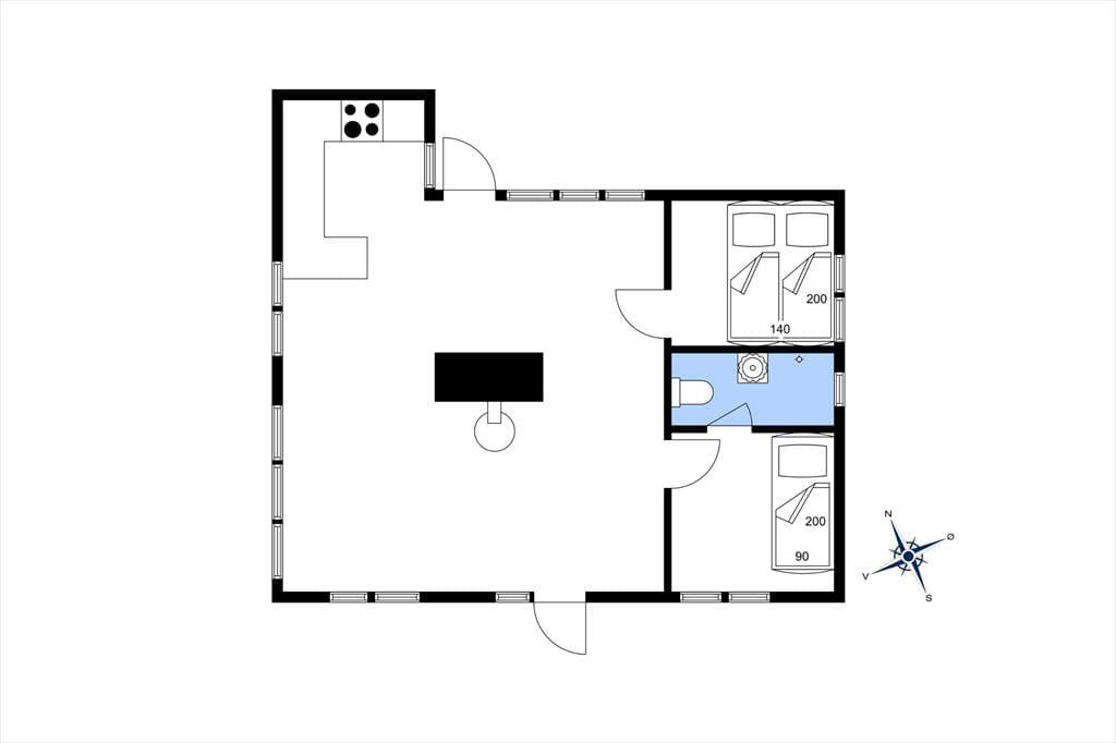 Feriehuset indeholder et dejligt køkken/alrum, hvor fra der er udgang til terrasse mod nord og mod syd. I huset er der 2 gode værelser - et med en 3/4 seng og et med køjesenge. Fra det ene værelse er adgang til mindre badeværelse med bruser. I anneks er der et stort lyst rum med 2 enkeltsenge - annekset har udgang til den fælles terrasse. Et personligt hus med stil samt havudsigt fra lænestolen.