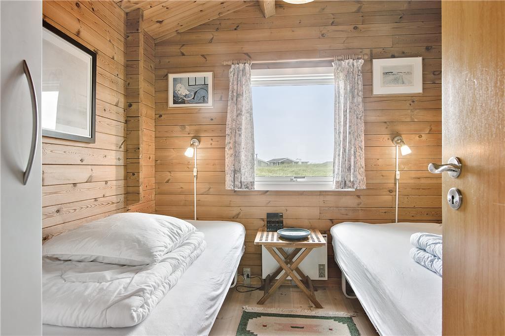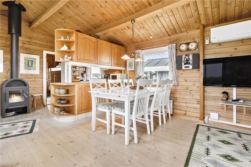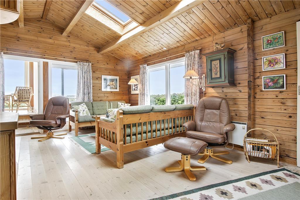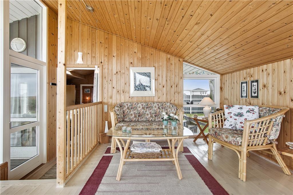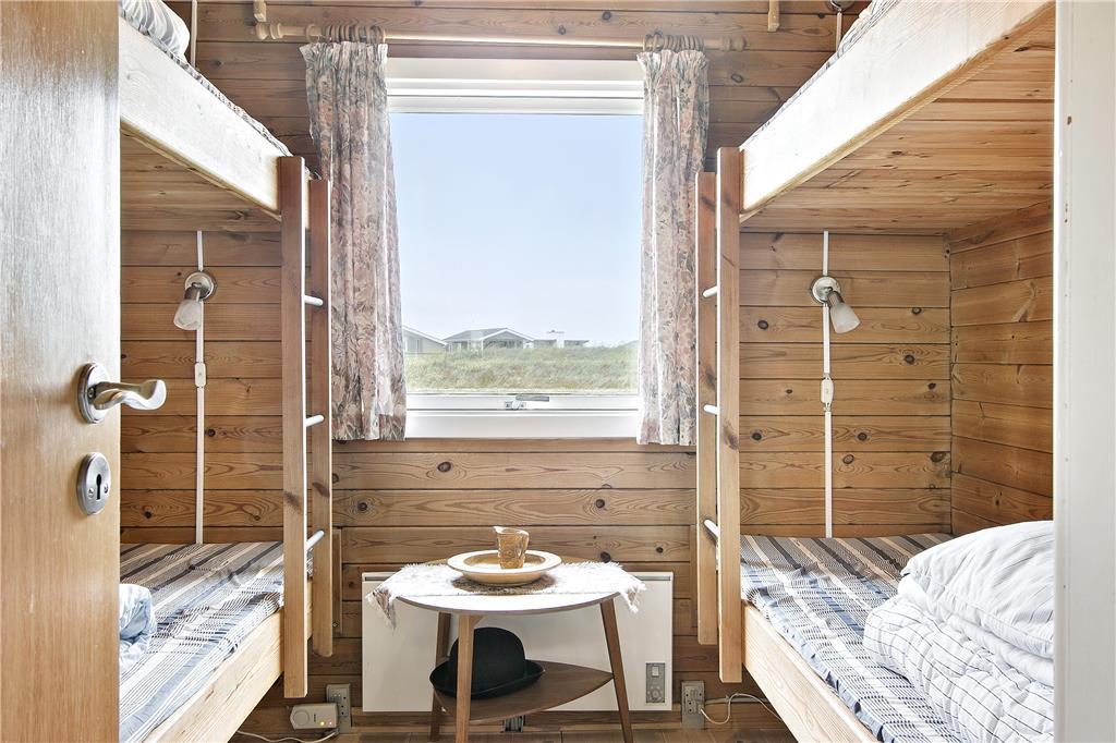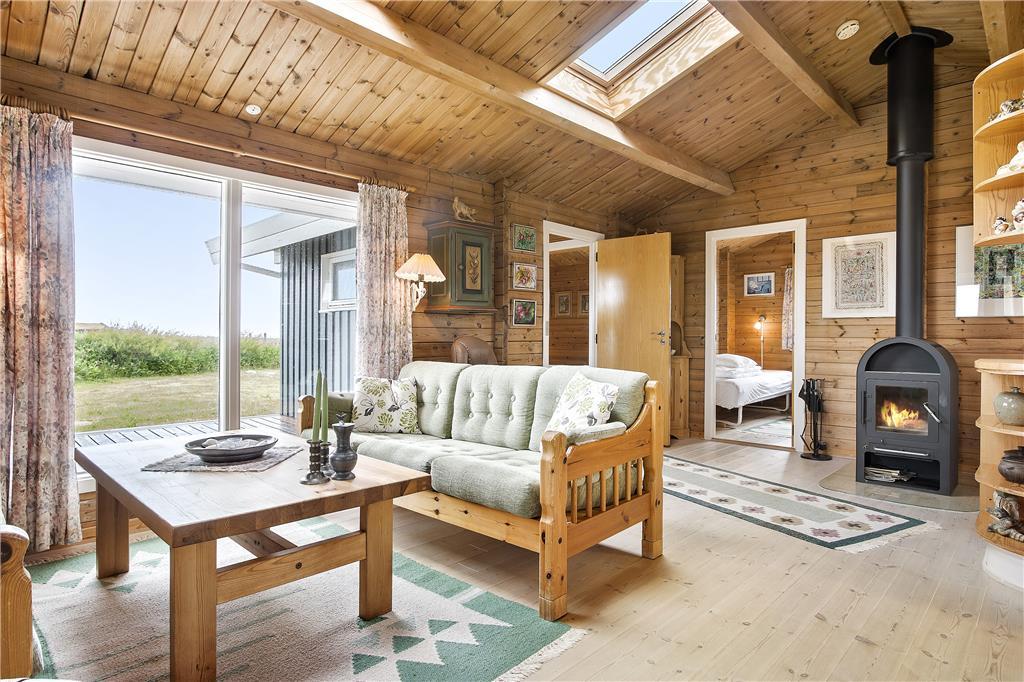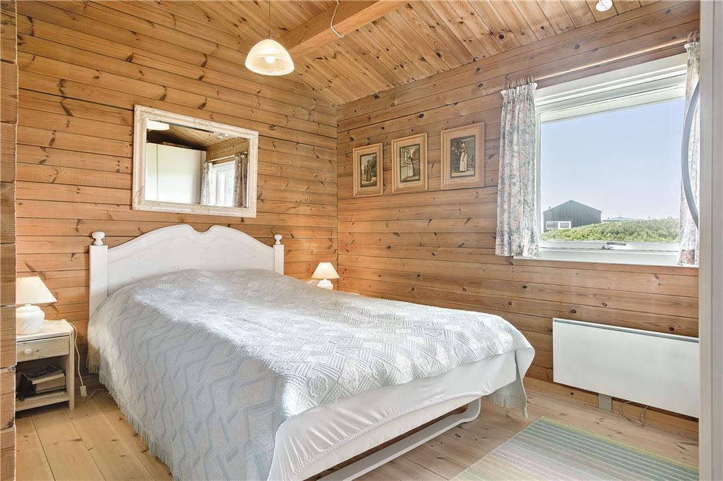 Huset indeholder en lille fordelingsgang med udgang til renoveret badeværelse, et soveværelse med 3/4 seng samt til stuen. Fra stuen er der adgang til to soveværelser, et med to enkeltsenge, og et med køjesenge. Stuen er kombineret køkken/alrum, således man kan være sammen om aktiviteter i huset. Hertil kommer en fantastisk udestue med panoramaudsigt over havet og fyret. Huset er personligt og hyggelig indrettet og meget velholdt. Der er installeret varmepumpe, som har meget positiv betydning for elforbruget. Der er desuden hobbyrum til havemøbler, hynder, cykler mm.