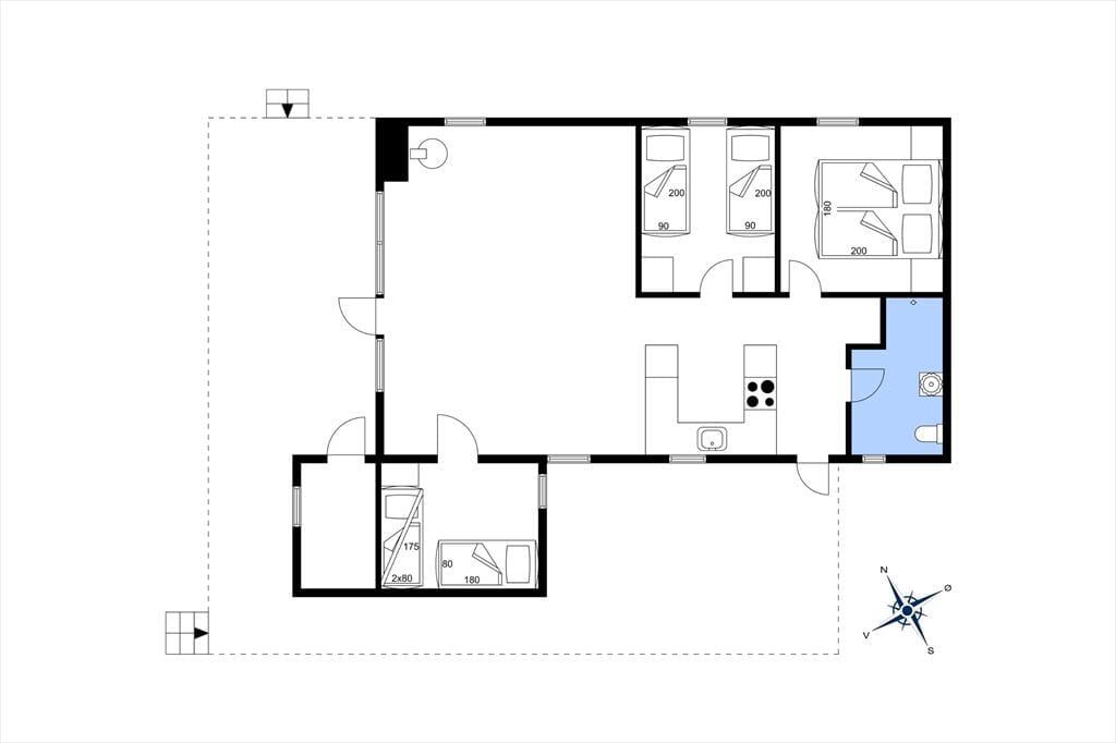 Feriehuset er rigtig praktisk indrettet med åbent køkken til både spisestue og opholdsstue. Herfra er der udgang til en dejlig delvist overdækket terrasse med den mest fantastiske havudsigt. Huset er indrettet med funktionelle møbler og en lille brændeovn, som kan gøre nytte, hvis aftenerne skulle blive lidt kolde. Der er tre soverum med hhv. dobbeltseng, to enkeltsenge og et værelse med en køjeseng og en enkeltseng, som ikke har fuld længde. Badeværelset er lyst og praktisk indrettet med bruseniche.