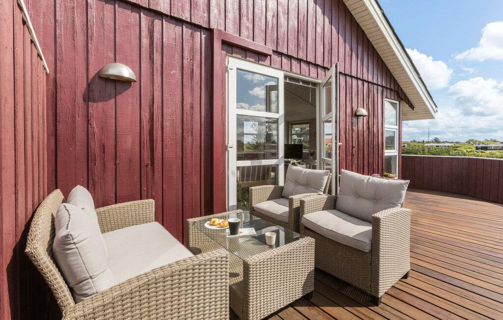 Træd ud på den store træterrasse og lad blikket feje hen over kystbyens tage og ned til havet. Nyd morgenmaden i den friske luft eller slap af i de komfortable loungemøbler. Terrassen omgiver næsten hele huset og gør det muligt at finde en plads i solen eller skyggen når som helst på dagen.