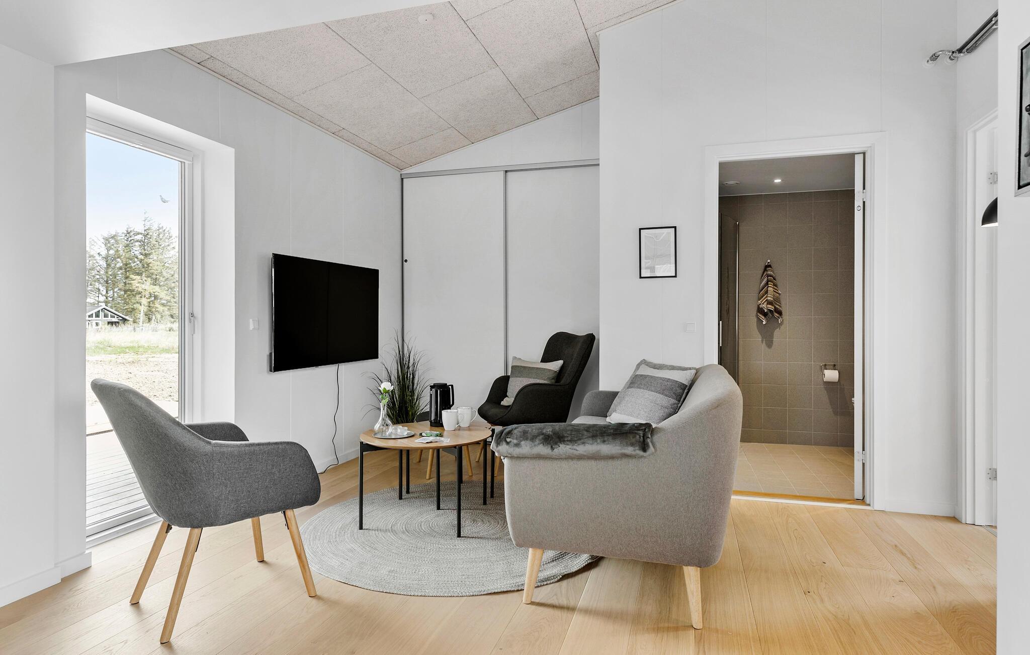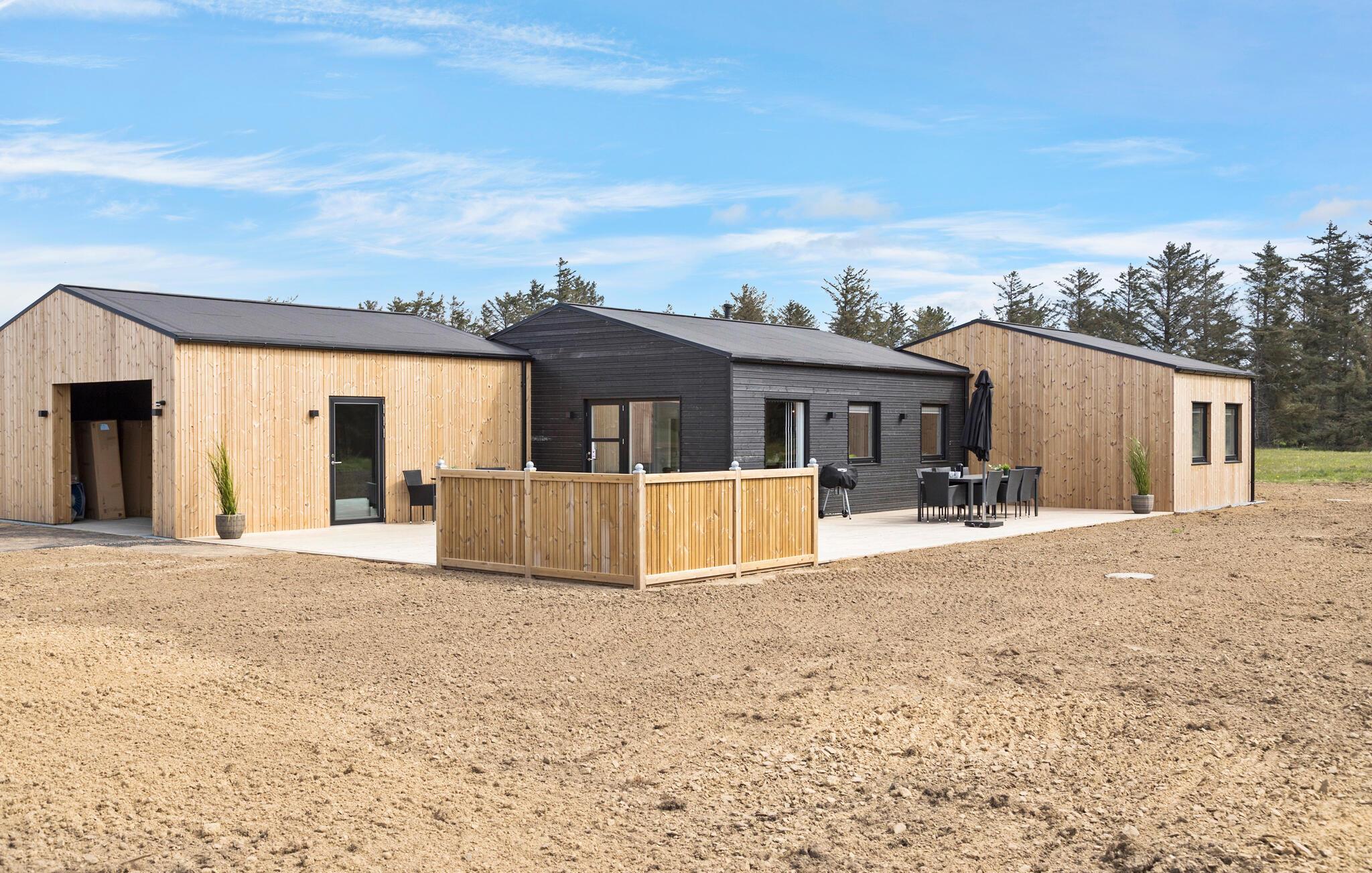 Moderne træhus ved Lønstrup Strand med vildmarksbad, legeplads og stor terrasse til afslapning.
