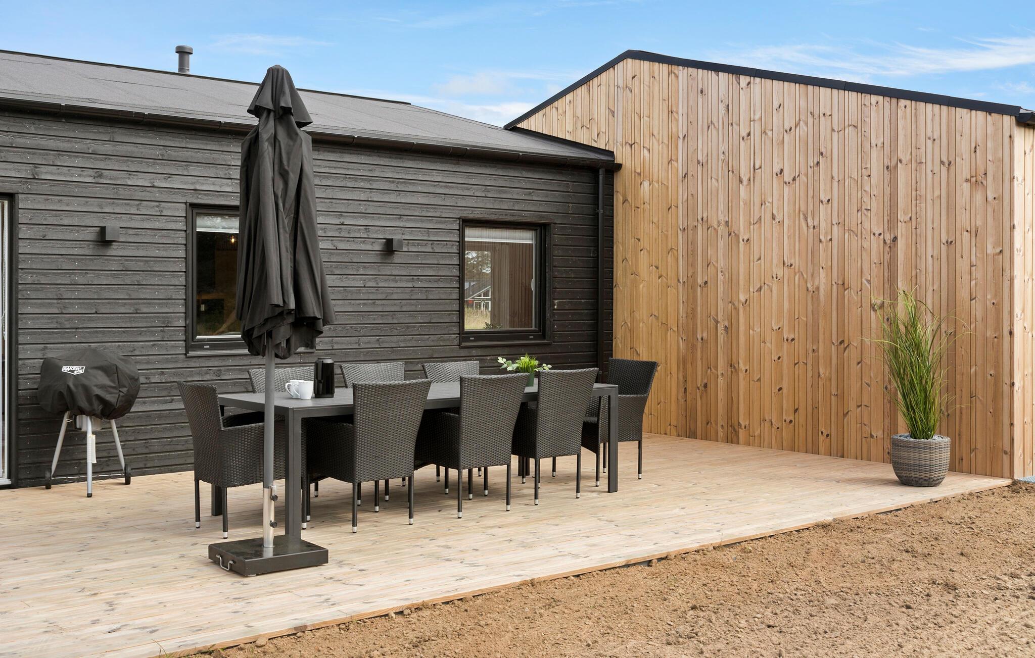 På de varme dage kan I trække ud på terrassen, der bliver jeres anden stue om sommeren. Begynd dagen her med en god kop kaffe og nyd solen, mens børnene løber rundt og leger med de mange fremragende legeredskaber. Ud på eftermiddagen kan I grille nogle saftige bøffer, mens I lægger planer for de kommende dage. Og måske aftenen skal rundes af med en tur i vildmarksbadet?