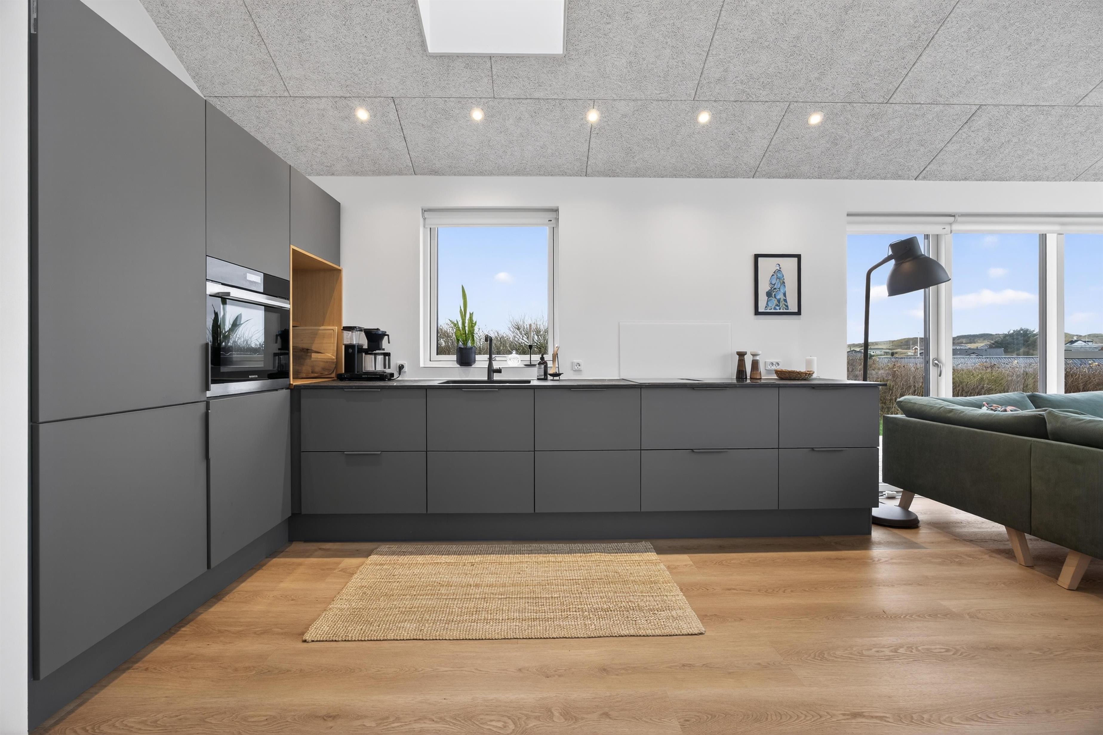 Velkommen til et nyt og moderne sommerhus, hvor kvalitet og komfort går hånd i hånd. Allerede i entréen mærker du rummeligheden og den høje loftshøjde, som giver huset en luftig og indbydende atmosfære. Herfra træder du ind i en smukt indrettet opholdsafdeling med store panoramavinduer, der lukker havets horisont ind i stuen.