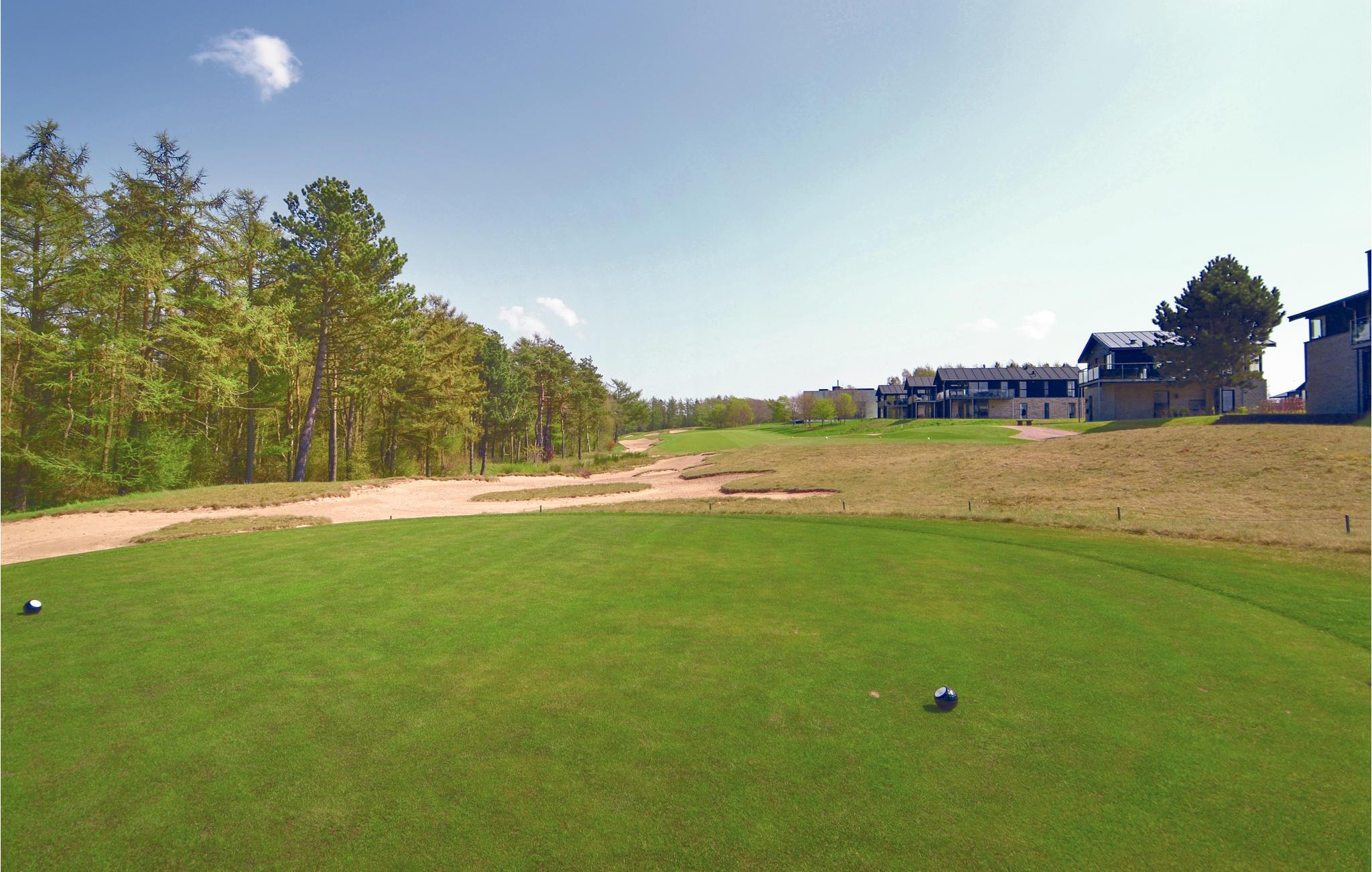 Flot feriehus på Lübker Resort med udsigt over golfbanen, tæt på Djurs Sommerland og wellnesscenter.