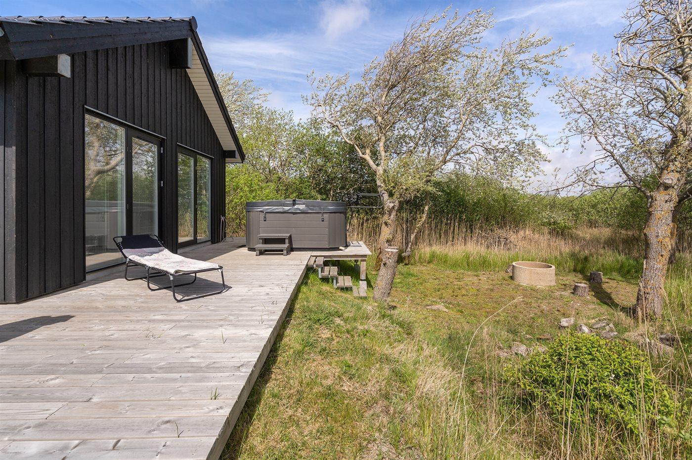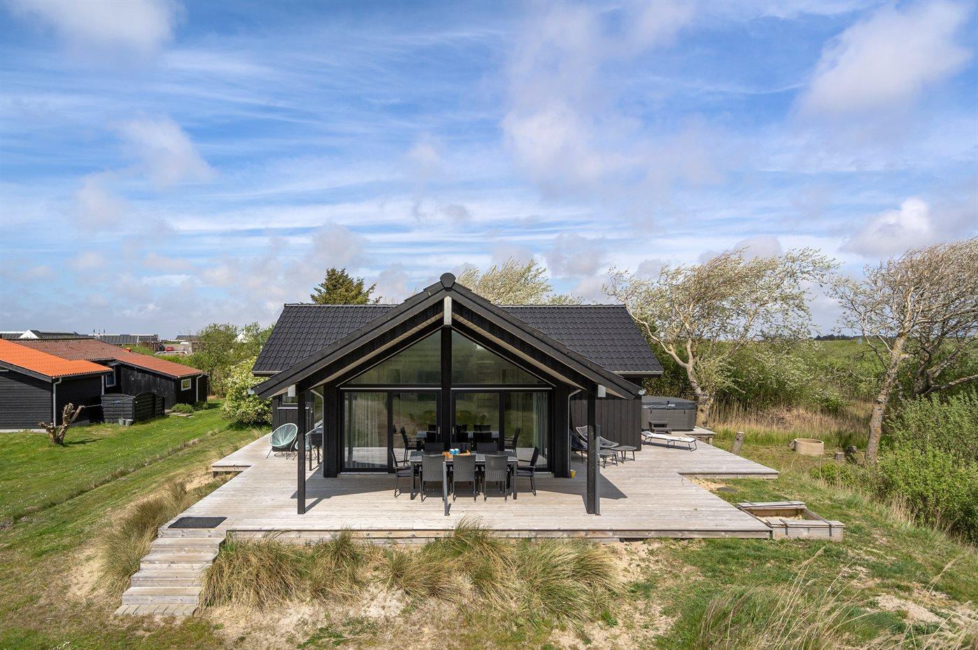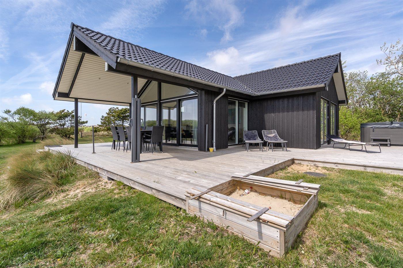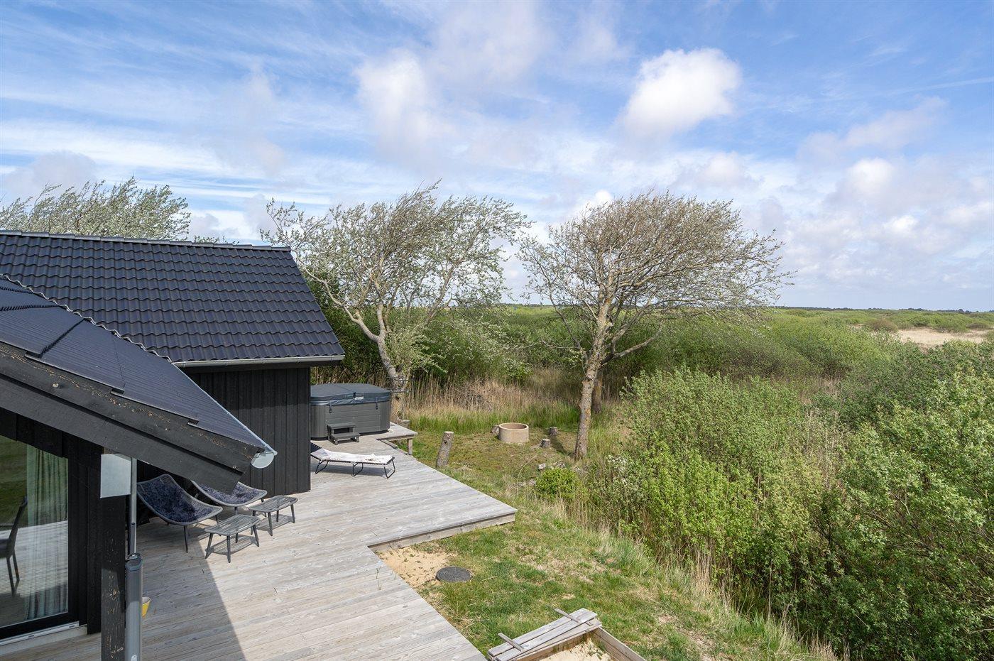 Flot sommerhus ved Lakolk strand med spa, sauna og stor terrasse på en rolig naturgrund.