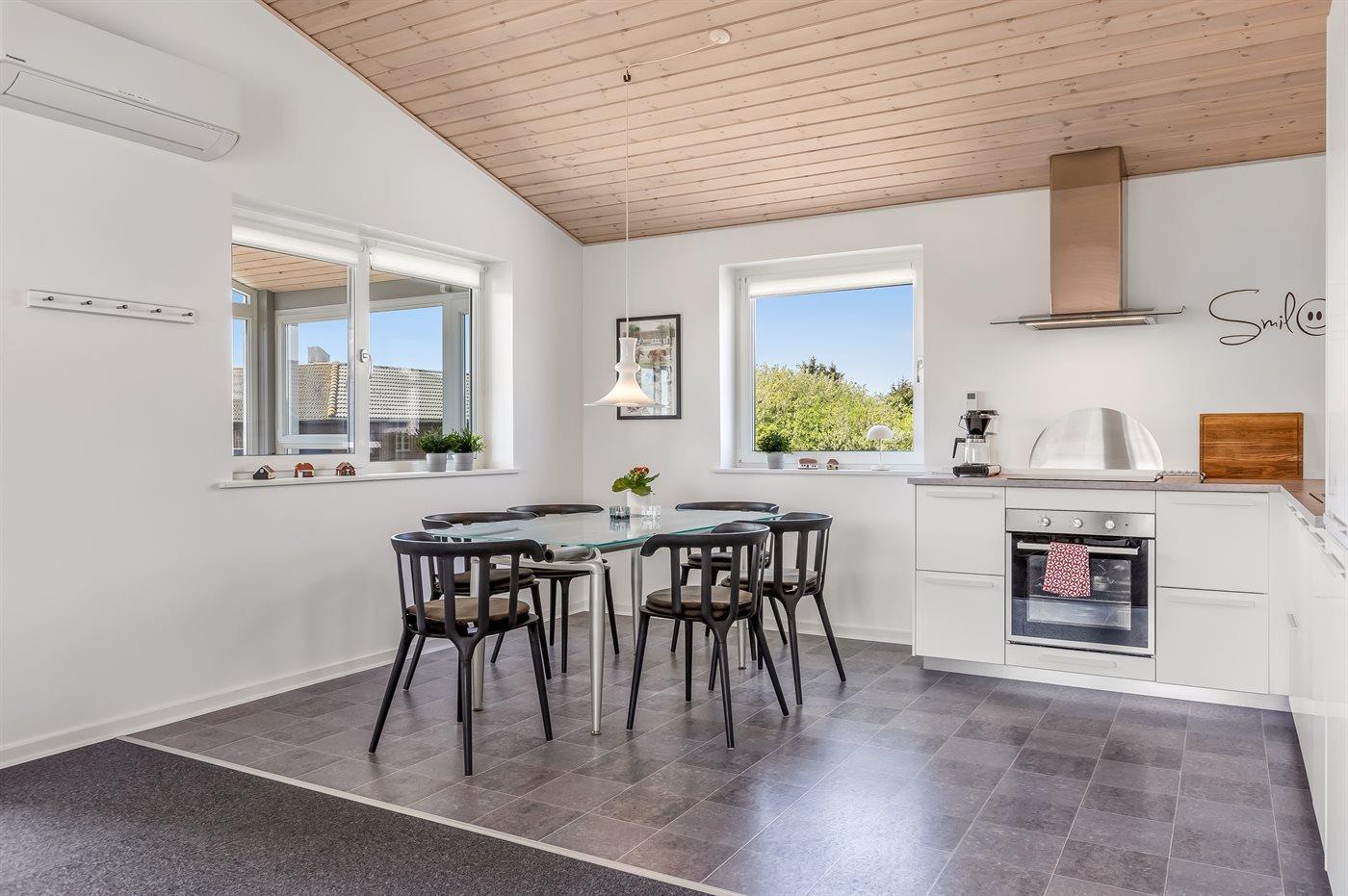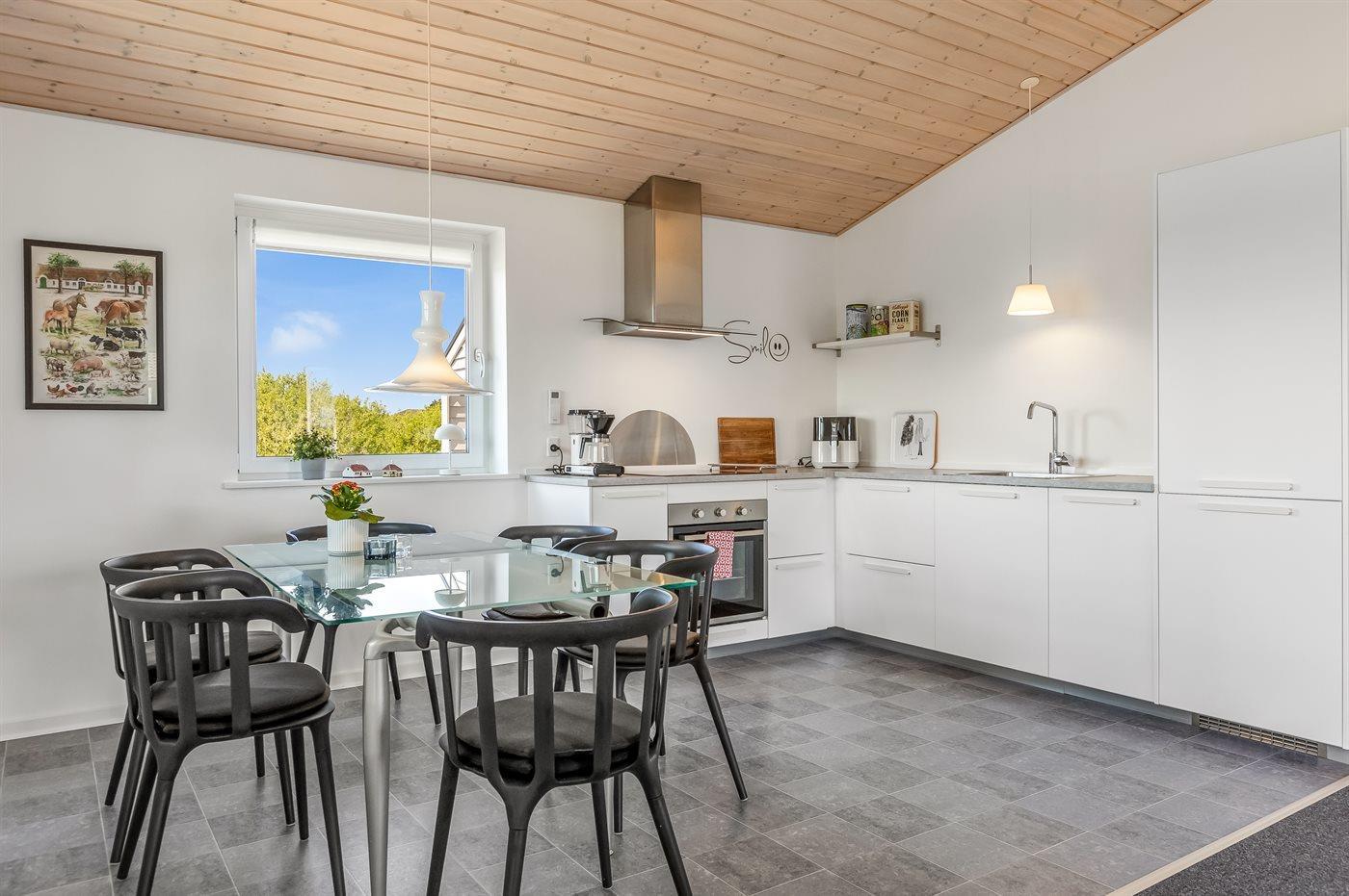Køkkenet er udstyret med 1 køleskab. Der er 4 keramiske kogeplader, varmluftovn, mikrobølgeovn samt opvaskemaskine.