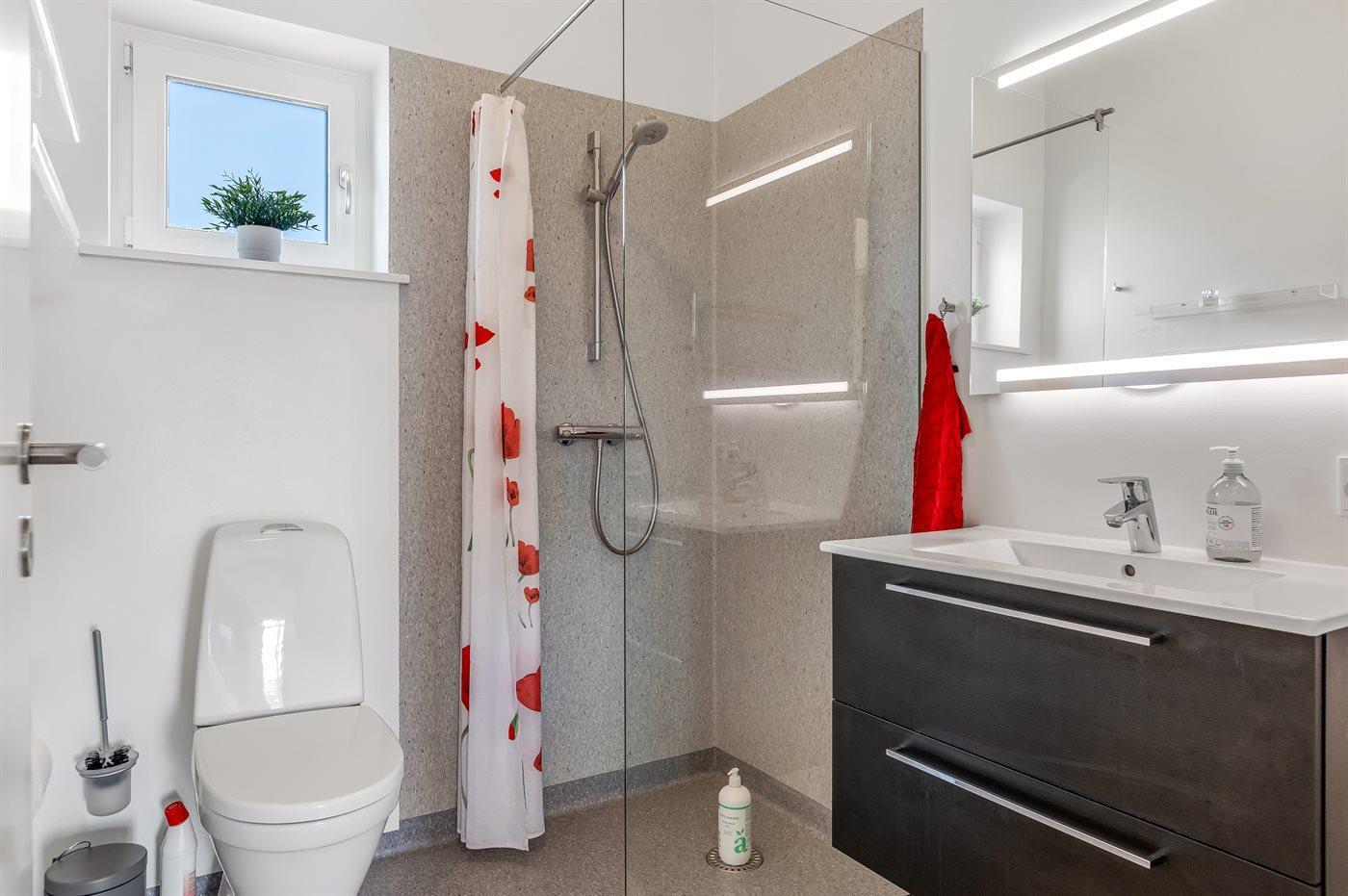 Der er 1 badeværelse med bruseniche og 1 toilet.. Der er gulvvarme på 1 badeværelse.