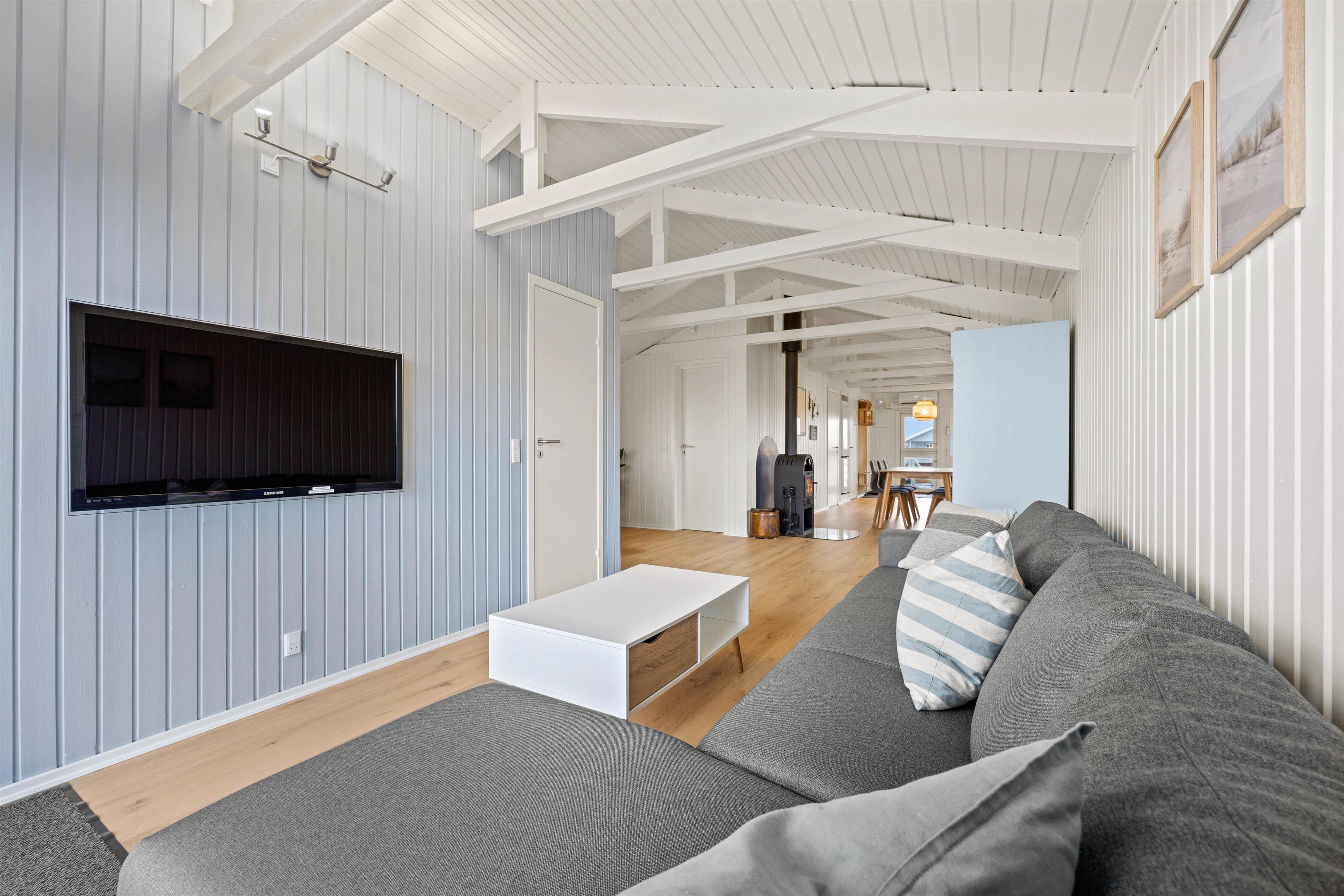 Samlingspunktet inden døre bliver dog køkkenalrummet, hvor køkken, spiseplads og stue er i forlængelse af hinanden. I køkkenet kan der tilberedes lækker mad, der senere skal en tur på gasgrillen eller måske bages en kage til kaffen? Den kedelige opvask klares heldigvis af opvaskemaskinen. Rummets store glasdøre og vinduer bidrager med masser af dagslys, mens brændeovnens placering i midten skaber en naturlig opdeling mellem køkken og stue. På denne måde spredes dens varme og hygge også i hele rummet. Slå efterfølgende benene op i sofaen med en god bog eller hyg med jeres yndlingsbrætspil ved spisebordet– alt imens pejsens varme og hygge spredes. Stuen har desuden en energibesparende varmepumpe, mens I til højre for indgangen har adgang til et lille separat opbevaringsrum, der også indeholder en tørretumbler.