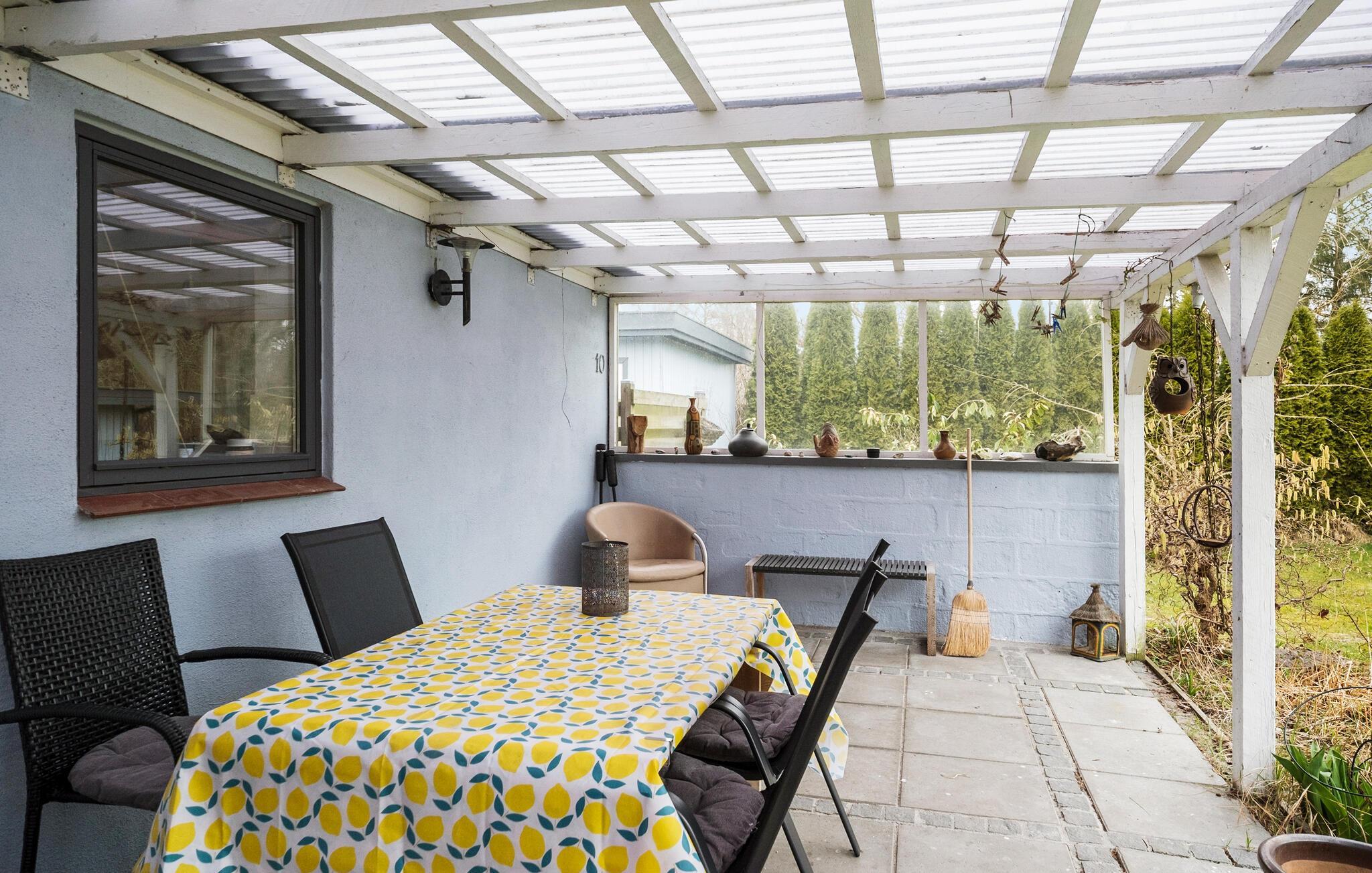Den overdækkede terrasse tilbyder det ideelle sted at få noget frisk luft og nyde dagen på en afslappet måde. Komfortable siddepladser og en rummelig have skaber plads til afslapning og motion i lige grad. Spil fodbold på græsplænen med børnene og nyd den særlige atmosfære i det fri.