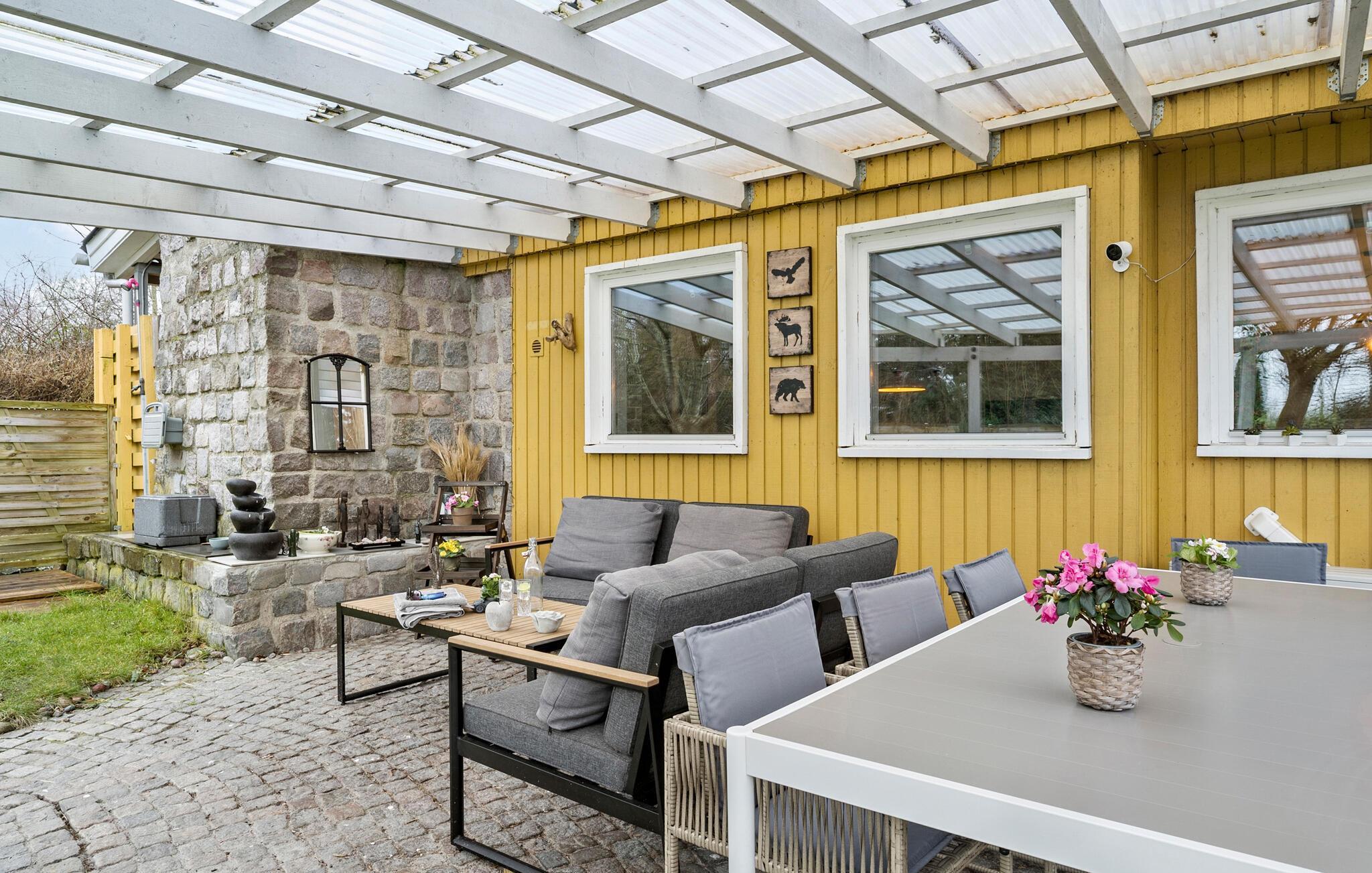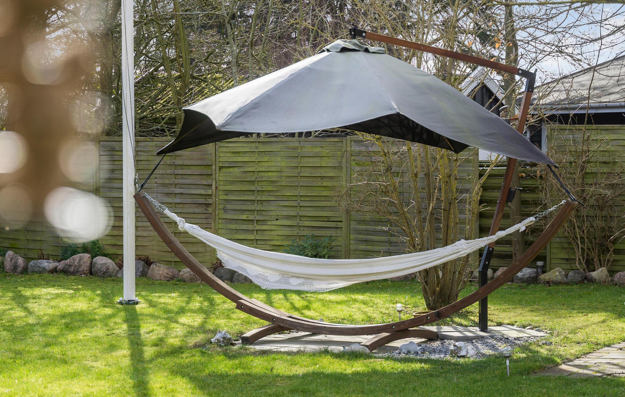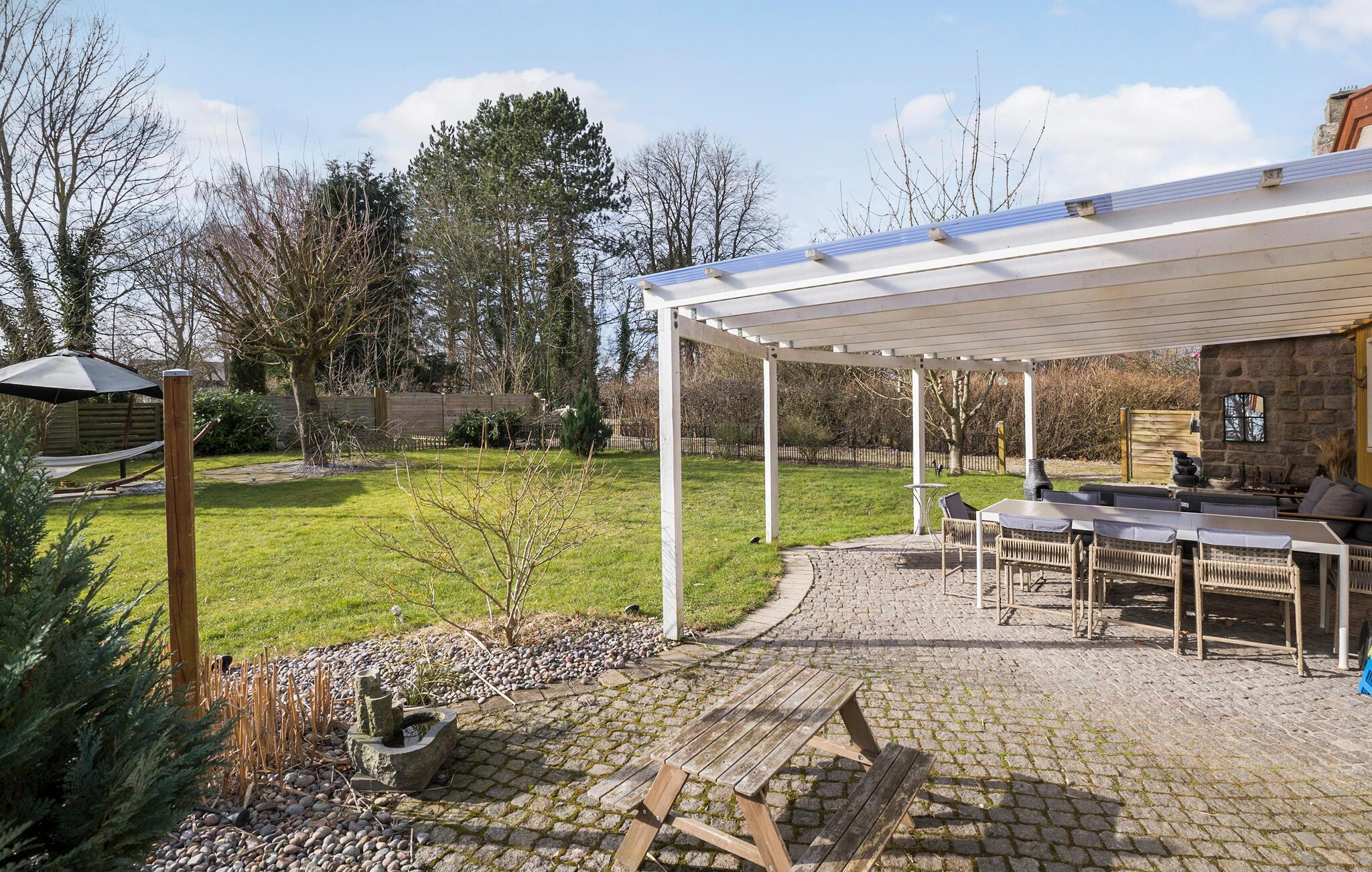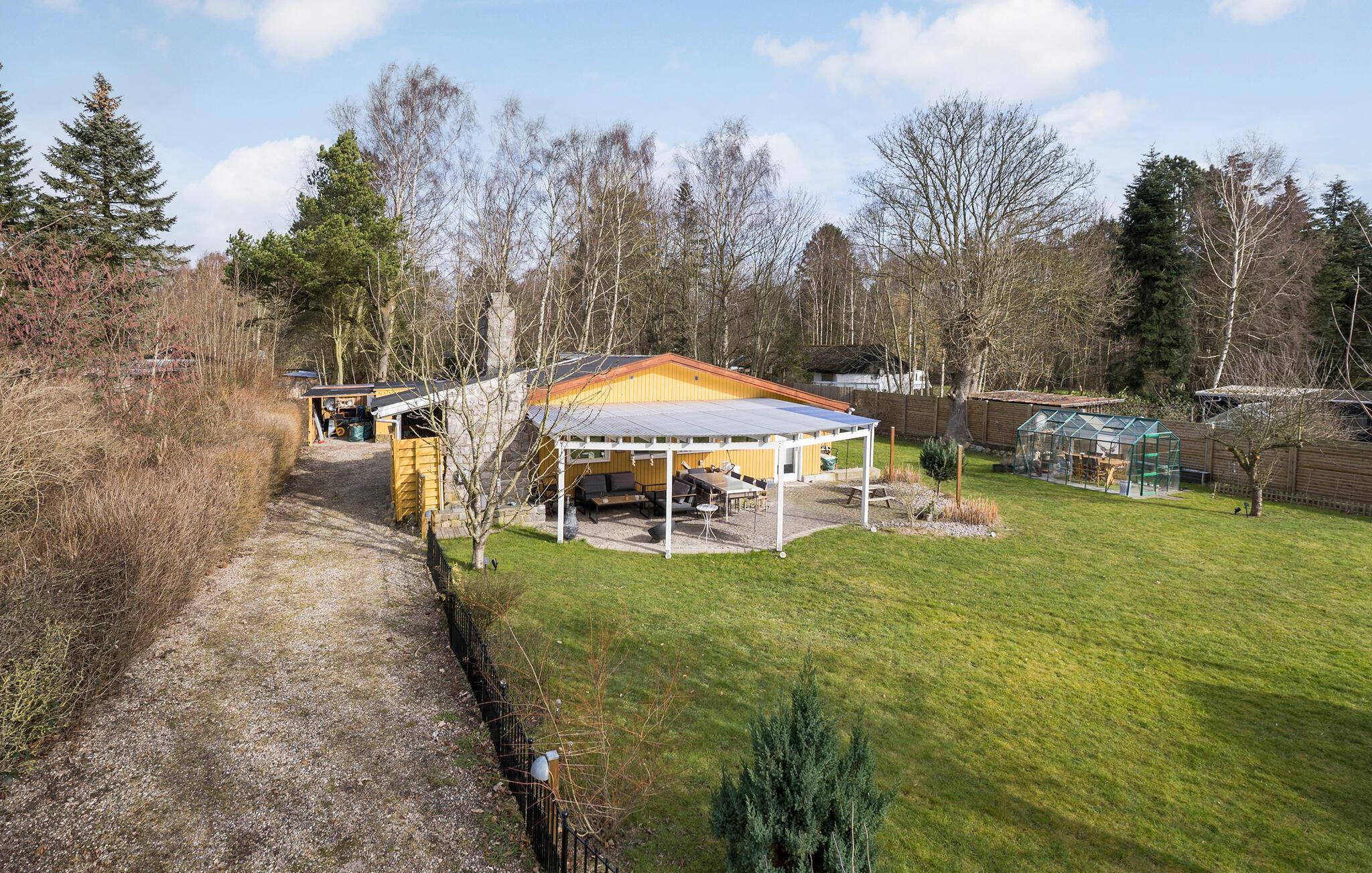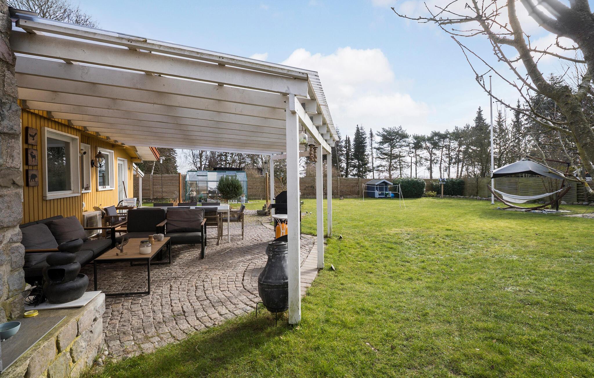 På den overdækkede terrasse glemmer I hurtigt alt om hverdagen, for her kan alle mærke en skøn fred og ro. Find jer godt til rette i de komfortable møbler og brug den store have til en lang række fritidsaktiviteter. Uanset om det er fodbold eller badminton kan hele familien hygge sig her. Børnene kan boltre sig i sandkassen eller legehuset, mens I nyder aftenstunden. Vil I gøre det ekstra hyggeligt, kan I tænde op i bålstedet og sidde ude til mørket falder på.