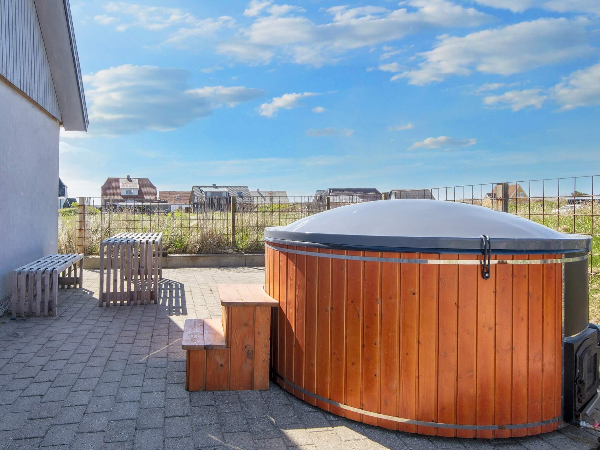 Der er en åben terrasse med havemøbler, liggestole og en kulgrill, hvor du kan nyde aftensmaden, mens du ser solen gå ned over området.