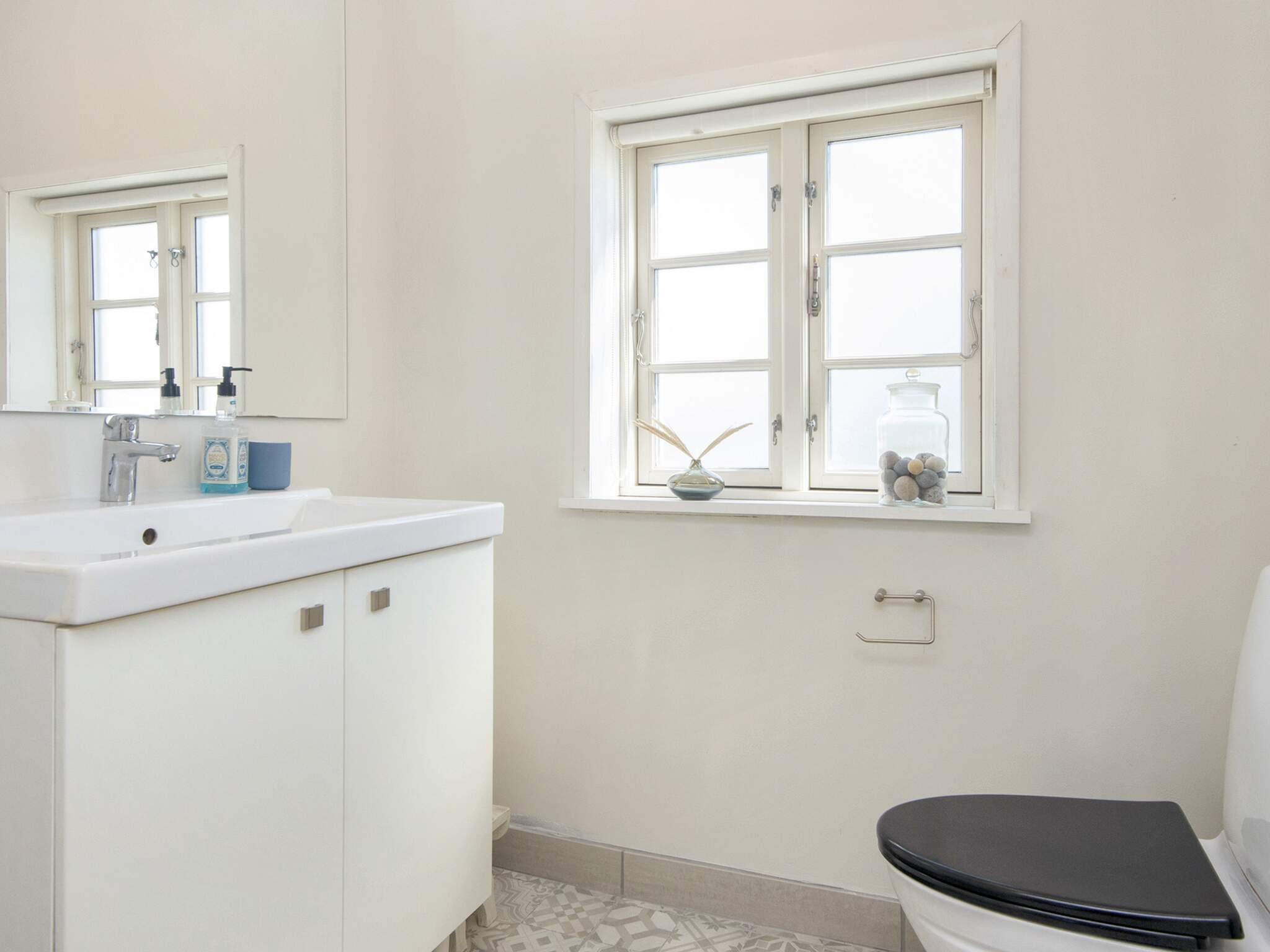 Badeværelse med bruser, badekar og toilet. Der er også et gæstetoilet i huset. Der er vildmarksbad i huset.