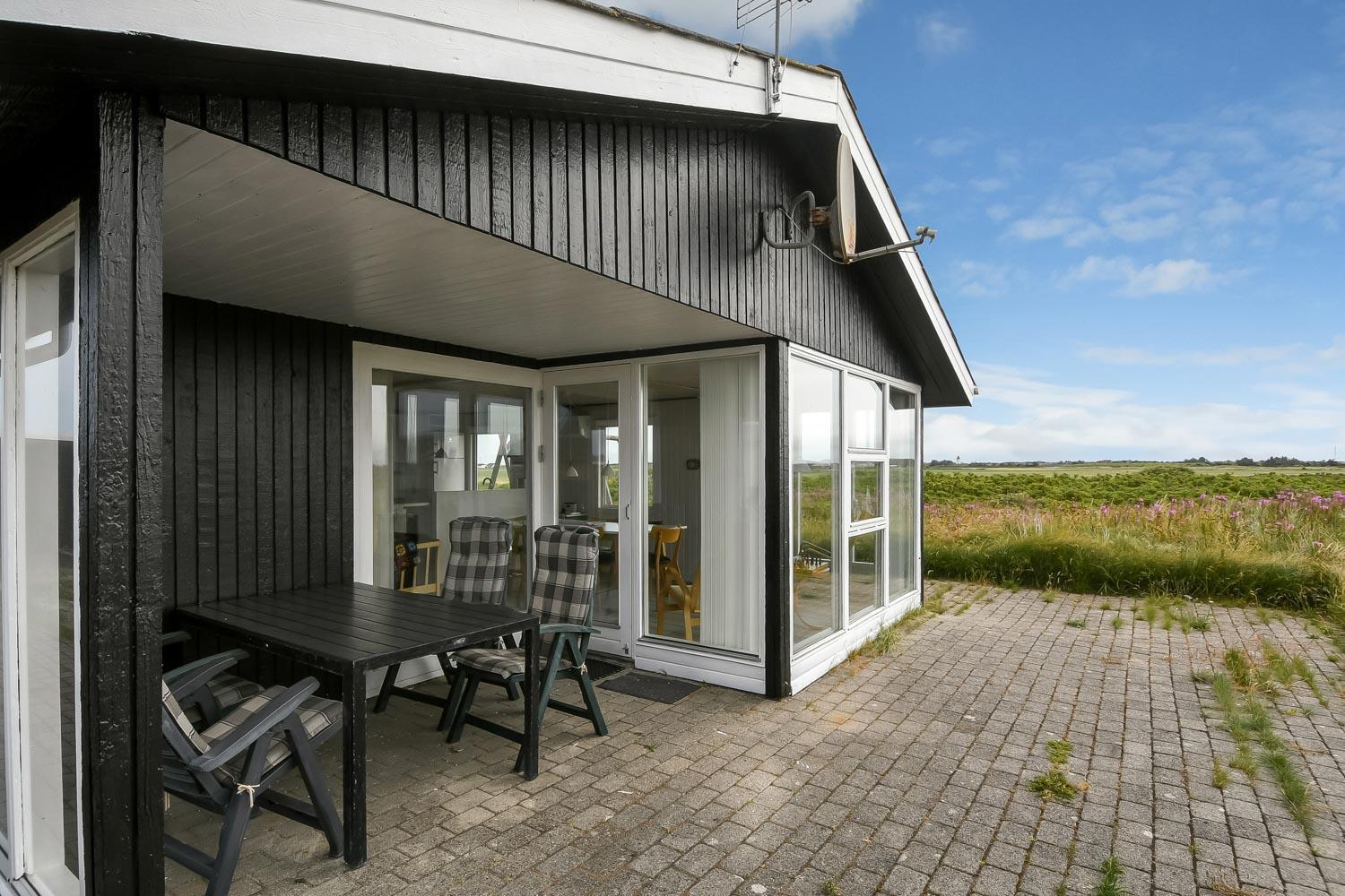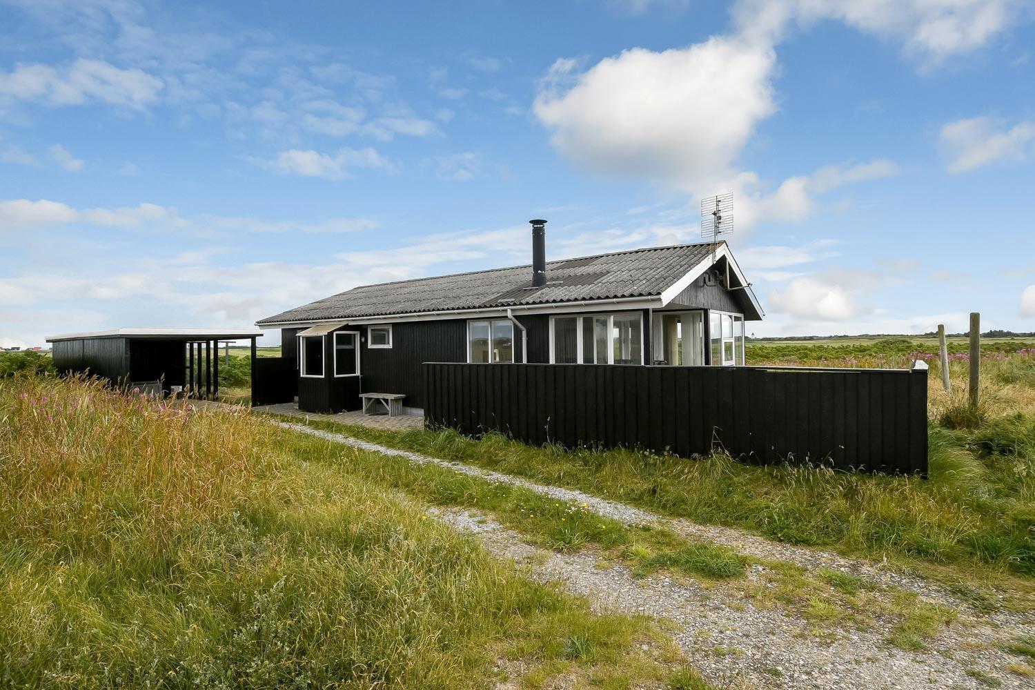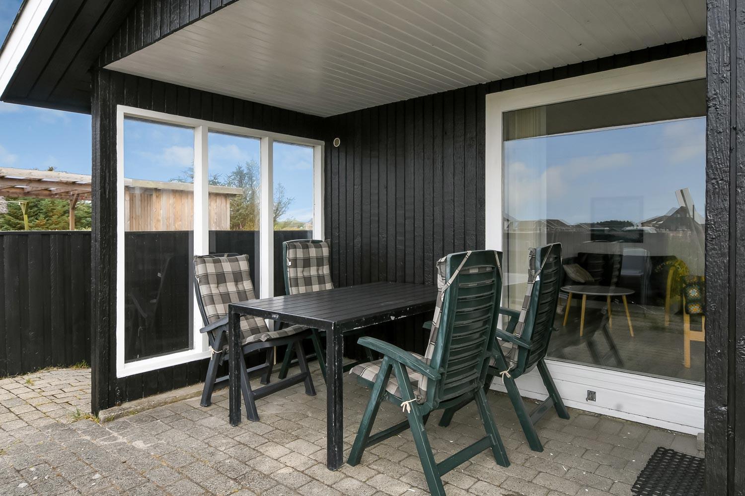 Fra opholdsstuen er der udgang til en dejlig delvis overdækket terrasse med havemøbler, liggestole og grill. Der er også en dejlig morgenterrasse langs med huset. Carport. Et rigtig godt sommerhus med den perfekte beliggenhed på en dejlig naturgrund tæt på det unikke Vesterhav som er et dagligt besøg værd både på solrige- som på blæsende dage. Hop ind i bilen eller tag cyklen og hent morgenbrød til familien i hos de nærved liggende supermarkeder. Så hvad enten du er til aktiv ferie eller total afslapning, danner dette feriehus en dejlig ramme både hvad angår hus, beliggenhed og omgivelser.