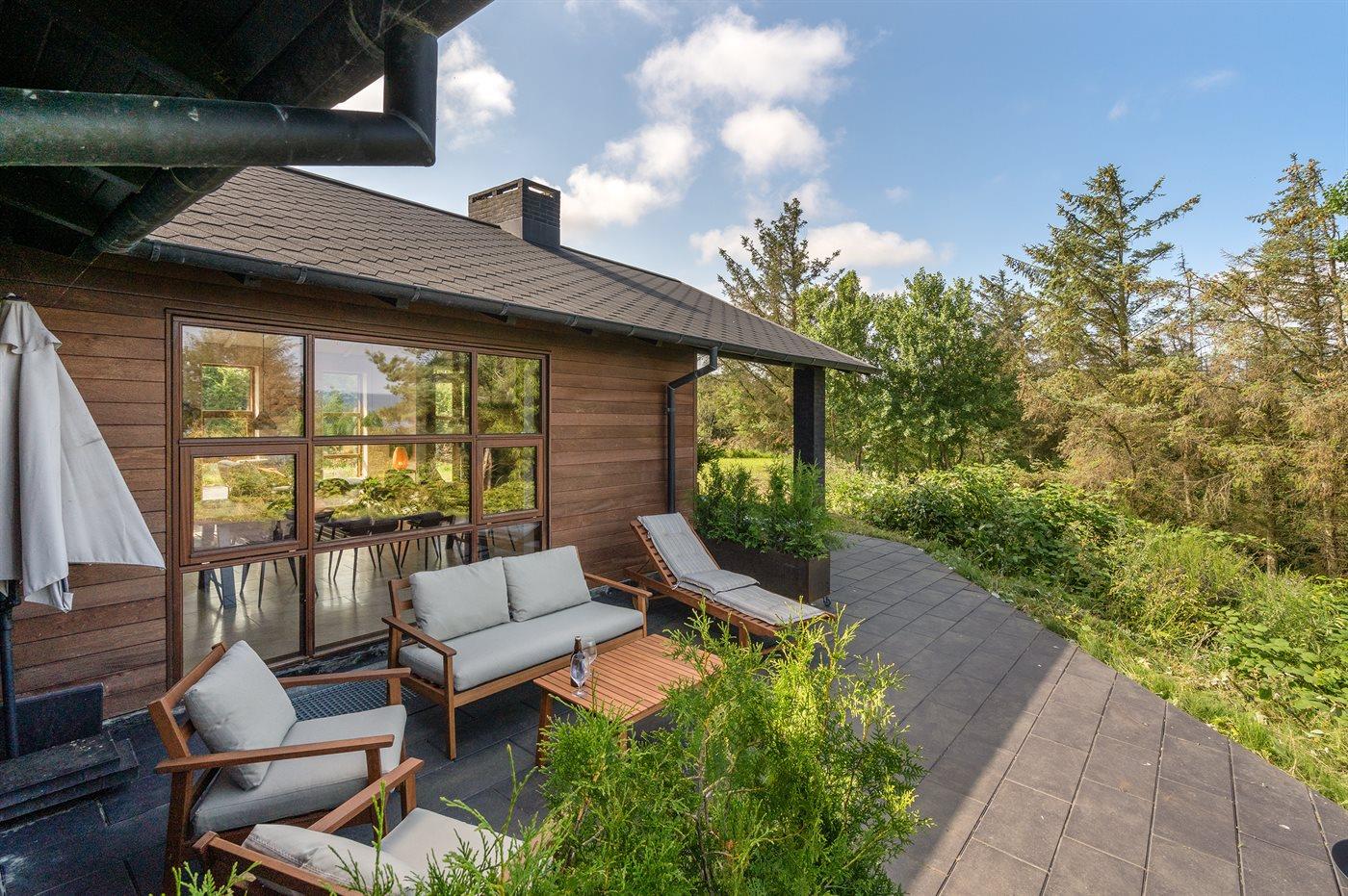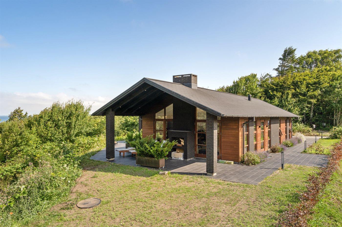 Ferieboligen er beliggende på en 800 m² stor naturgrund. Der er 600 m til fjorden. Nærmeste forretning er beliggende i en afstand af 3000 m. Der er en golfbane i en afstand af 3000 m. Til ferieboligen hører 75 m² terrasseareal. Desuden er der 27 m² overdækket terrasse. Grill til rådighed. Parkering ved ferieboligen.
