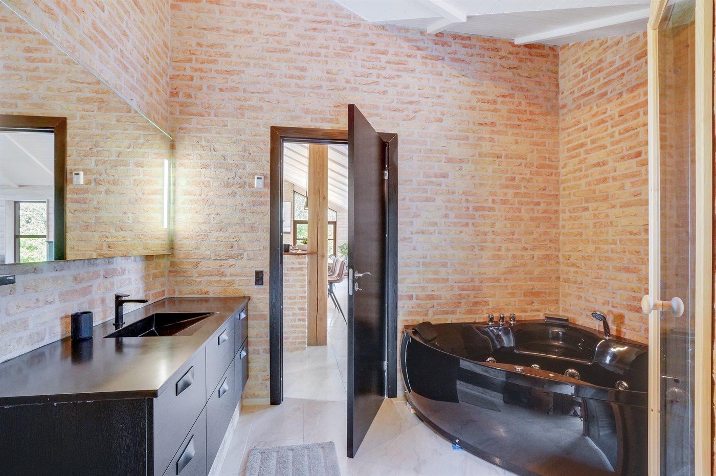 Der er 2 badeværelser med bruseniche og 2 toiletter. Der er gulvvarme på 2 badeværelser. I saunaen er der mulighed for afslapning.