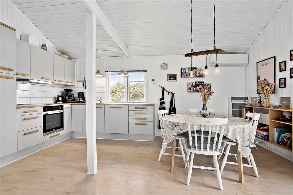 Huset er 58 m2 og her mangler absolut intet. Vægge og lofter er hvidmalede og sammen med de store vinduer, giver det en lys og venlig stemning. Køkkenet med bl.a. opvaskemaskine, er i åben forbindelse med stue og spiseplads og kan solen ikke opvarme huset alene, er her både mulighed for at hygge ved brændeovnen eller benytte varmepumpen. Badeværelset indeholder bruseniche, vaskemaskine og har desuden adgang til sauna. Sommerhusets to værelser er indrettede med henholdsvis dobbeltseng samt en køjeseng og egner sig derfor perfekt til den lille familie, eller et par, som gerne vil nyde hinanden i rolige omgivelser. Det er desuden værd at bemærke, at her både er parabol, kabel-tv, cromecast og lynhurtigt internet via bredbånd.