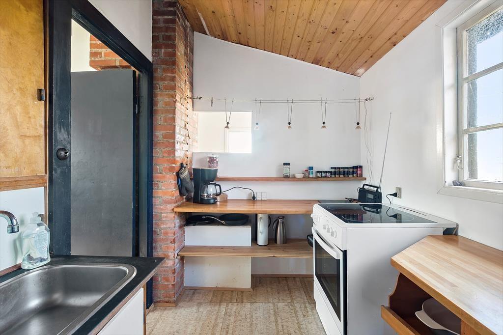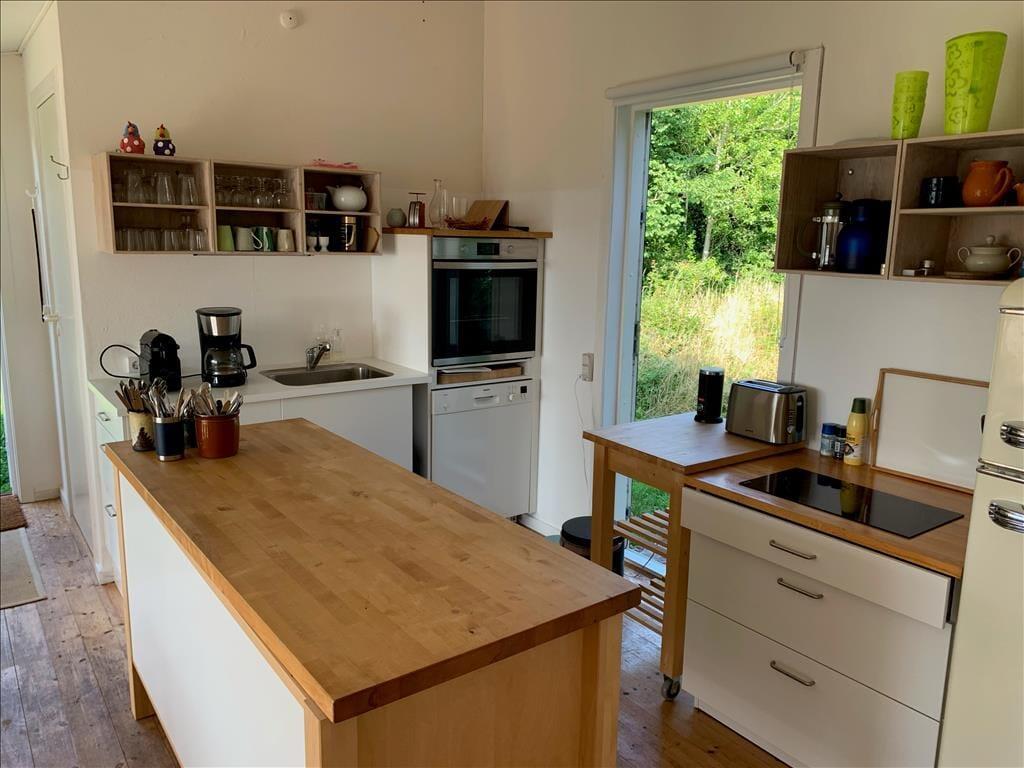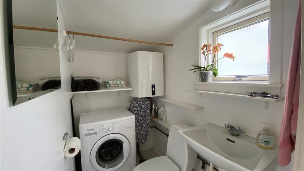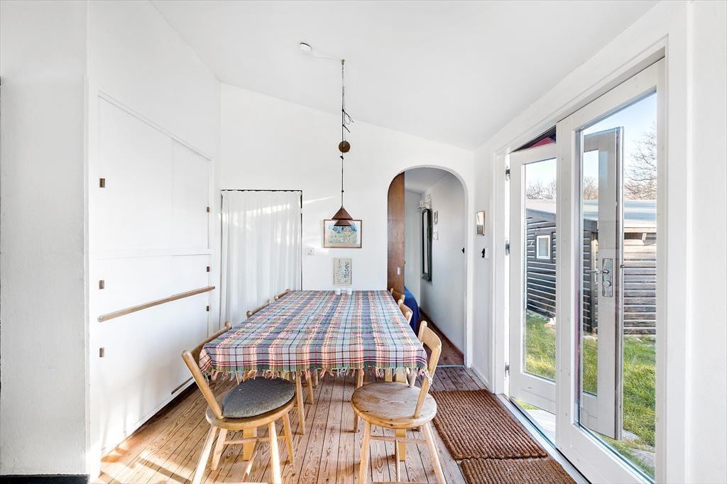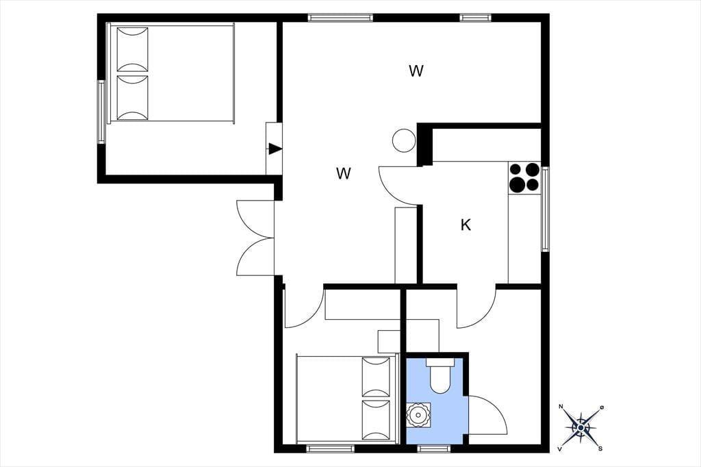 Hoved huset består af stue med spiseplads og brændeovn. Separat køkken. Soveværelse med dobbeltseng. Soveværelse med dobbeltseng og køje. Bryggers. Toilet.