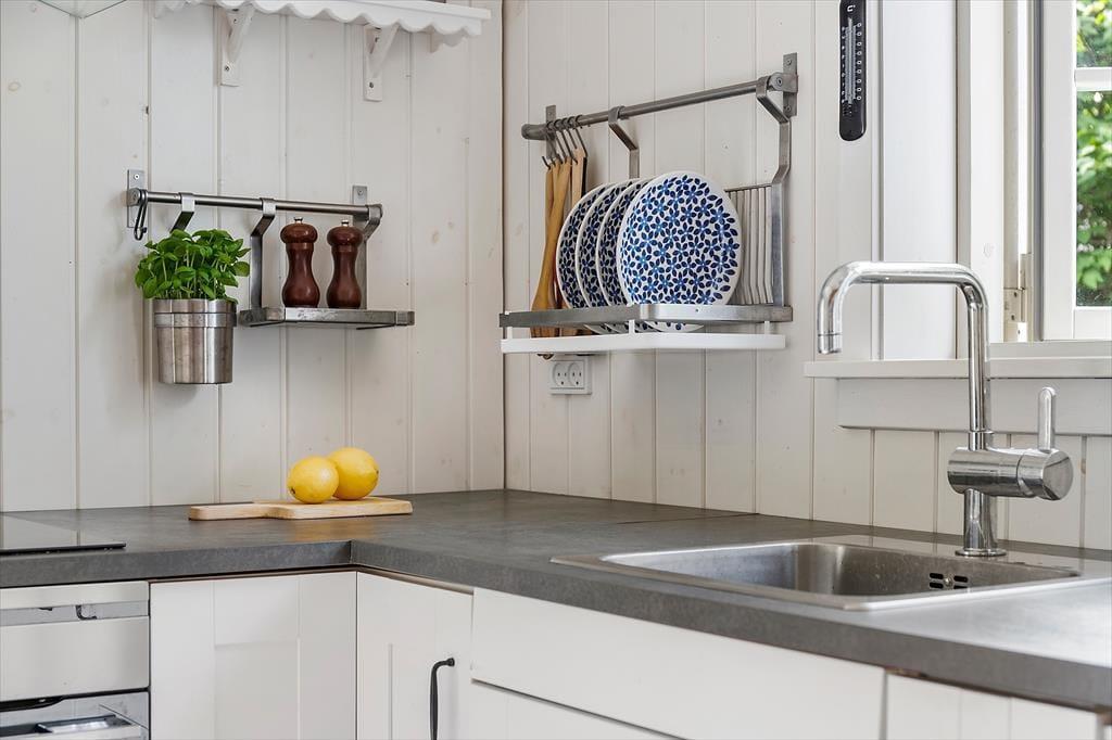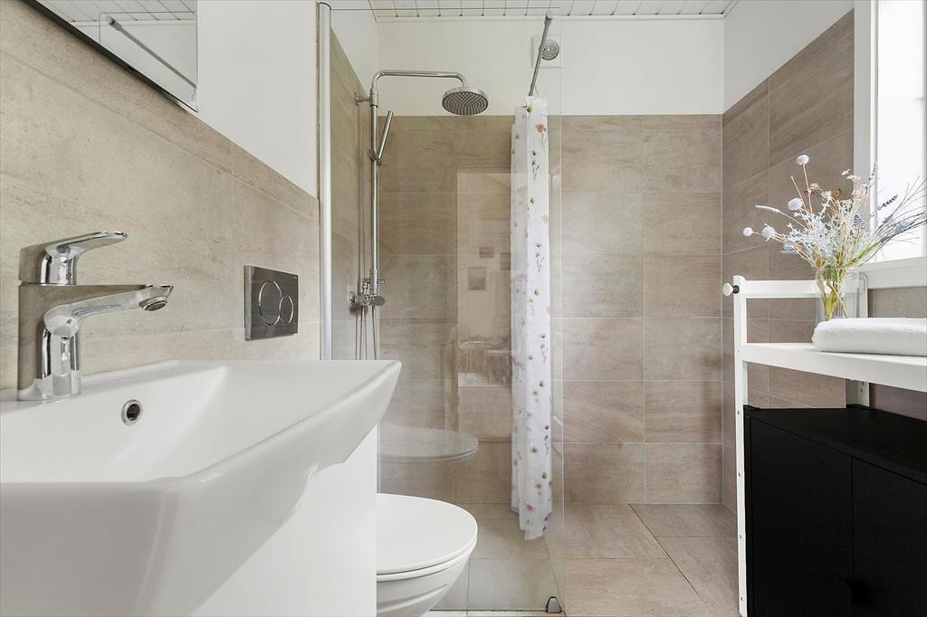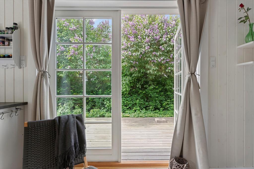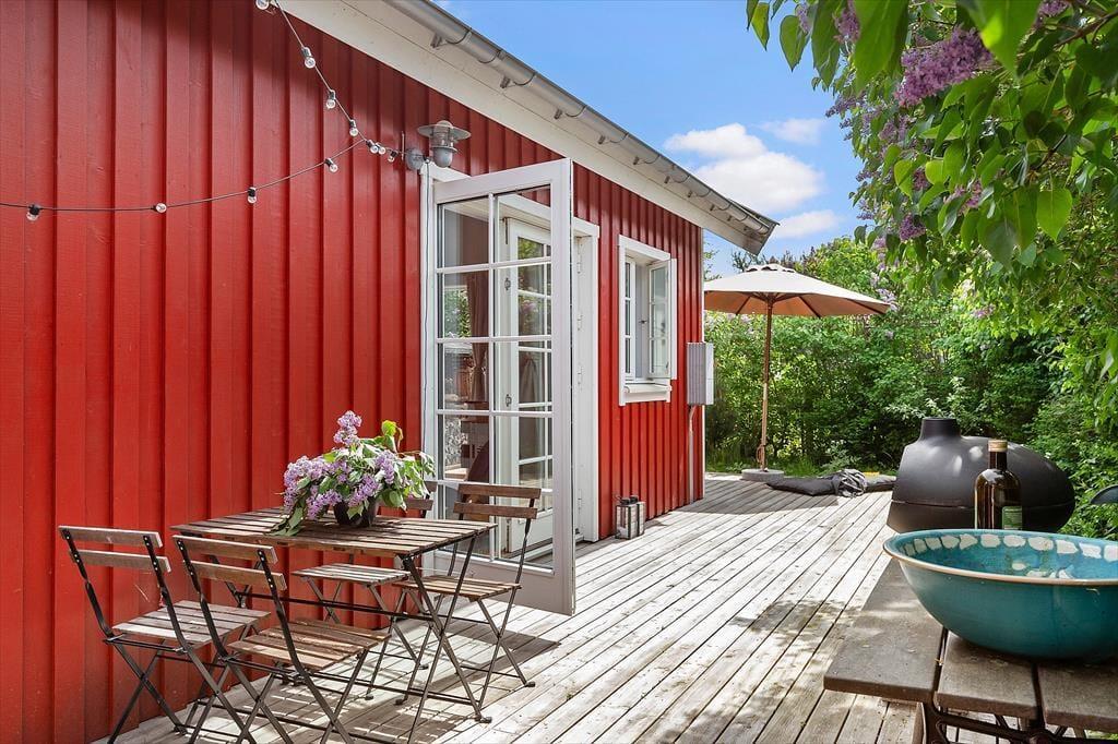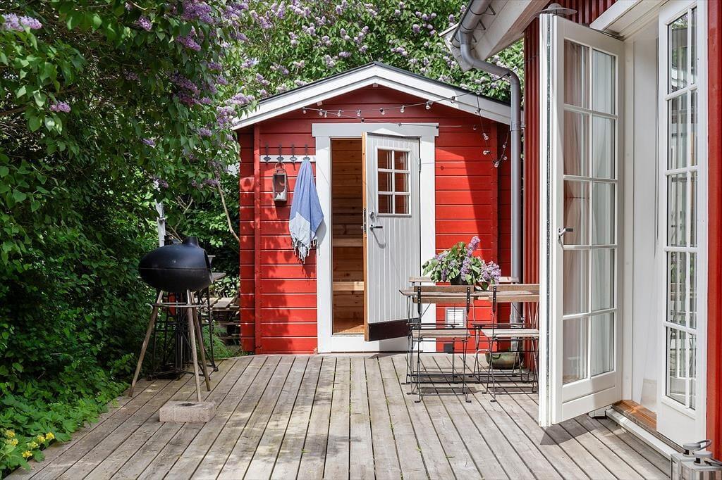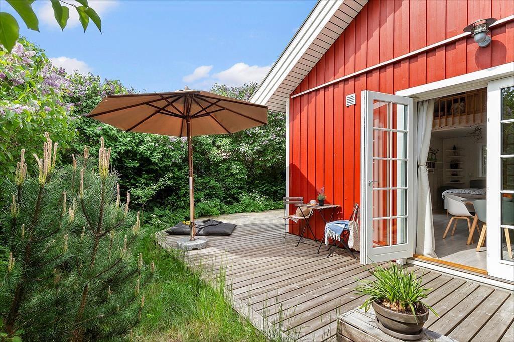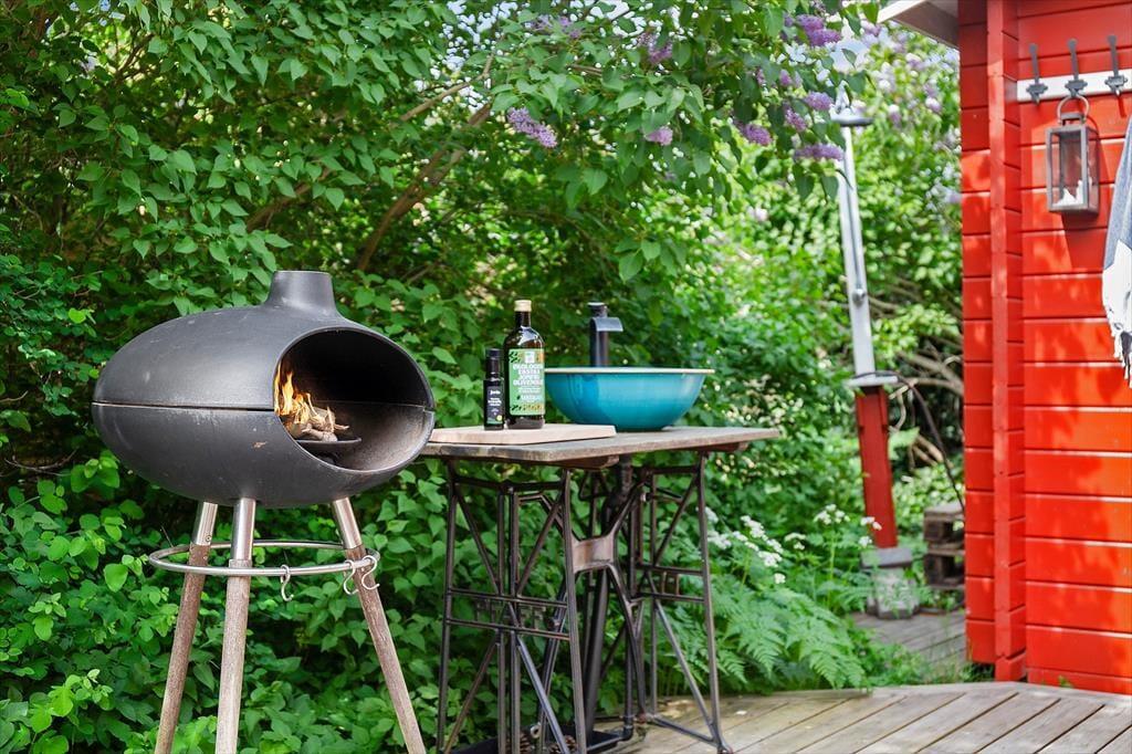Udenfor venter en dejlig terrasse, der indbyder til afslapning under åben himmel. Her kan du nyde din morgenkaffe i solen, tilberede lækre grillretter og afslutte dagen med en kølig drink i hånden. Efter en tur eller en løbetur i den omgivende natur kan du forkæle dig selv med en tur i saunaen, der tilbyder ultimativ afslapning og fornyet energi. Ved siden af saunaen finder du en udendørs bruser – perfekt til en forfriskende af skylning under den blå himmel. Den vilde, grønne have, der omgiver huset, giver plads til leg, ro og fordybelse, mens fuglesang fylder luften og forstærker den fredelige atmosfære.