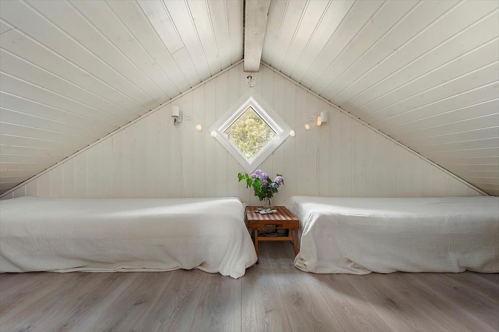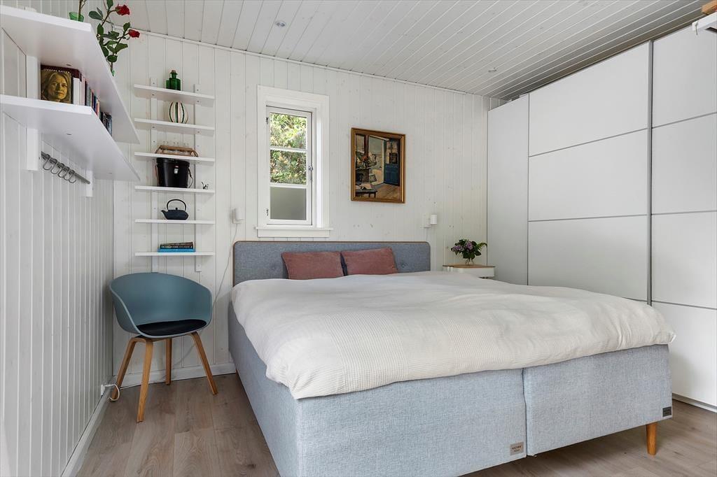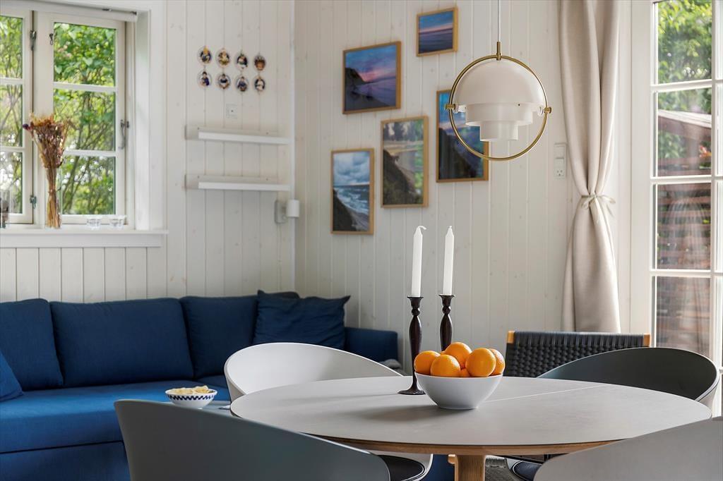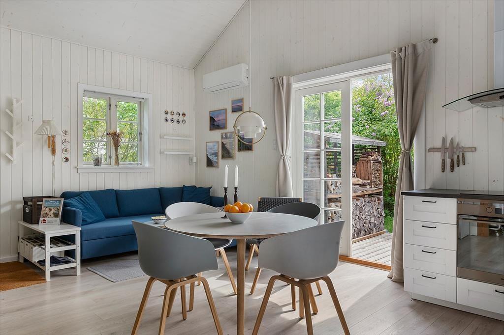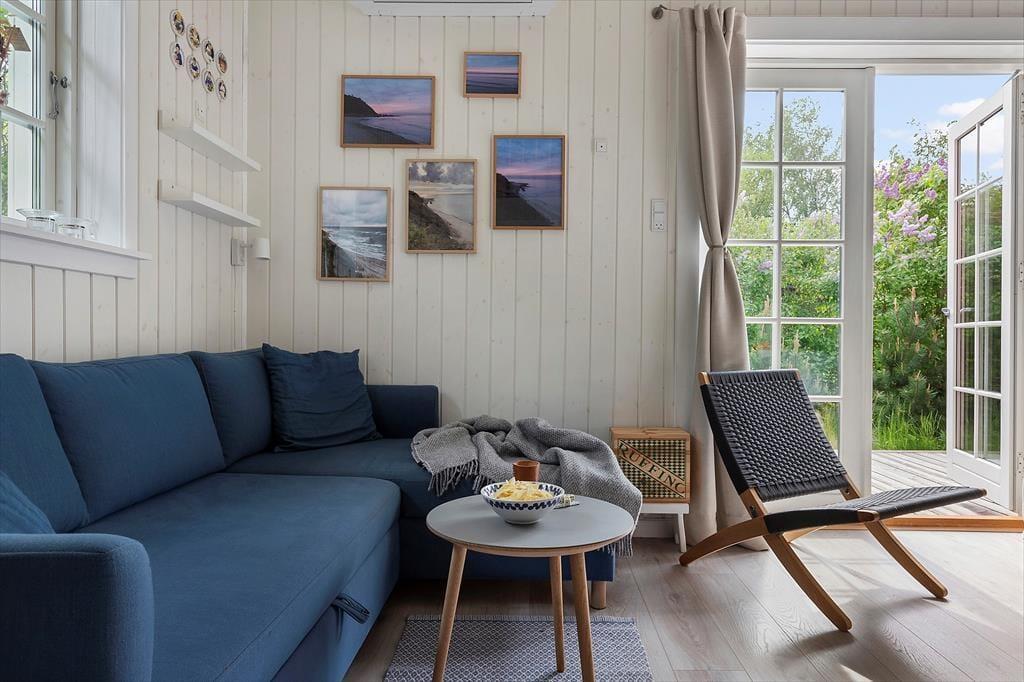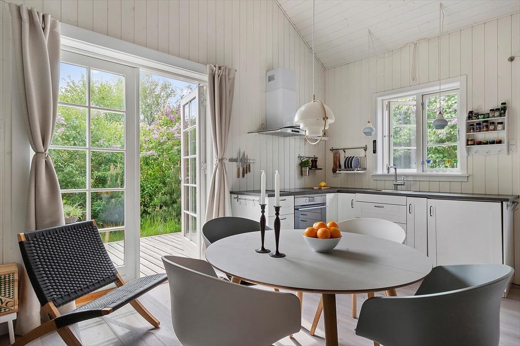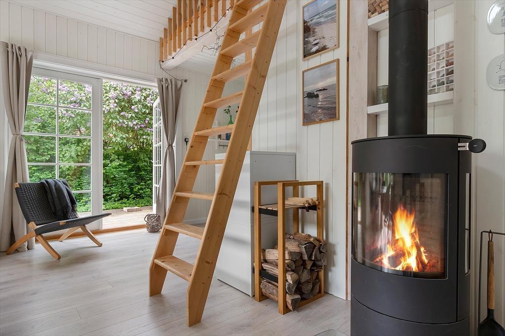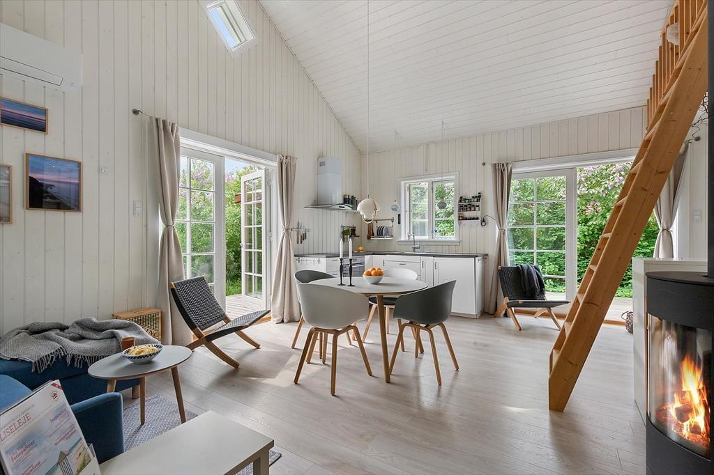 Når du træder ind i sommerhuset, mødes du af en lys og indbydende atmosfære. De høje lofter og store vinduer lader dagslyset strømme ind og skaber en følelse af ro og rummelighed. Det runde spisebord bliver midtpunktet for hyggelige måltider og spændende samtaler, mens de komfortable lænestole ved brændeovnen indbyder til afslapning med en god bog eller en varm kop kaffe. Loftet fungerer som et charmerende hjørne – perfekt til børn, en filmaften eller blot et sted at slappe af. Sommerhuset er designet med komfort og varme for øje og udstråler den ægte sommerhusstemning, der gør det nemt at føle sig hjemme.