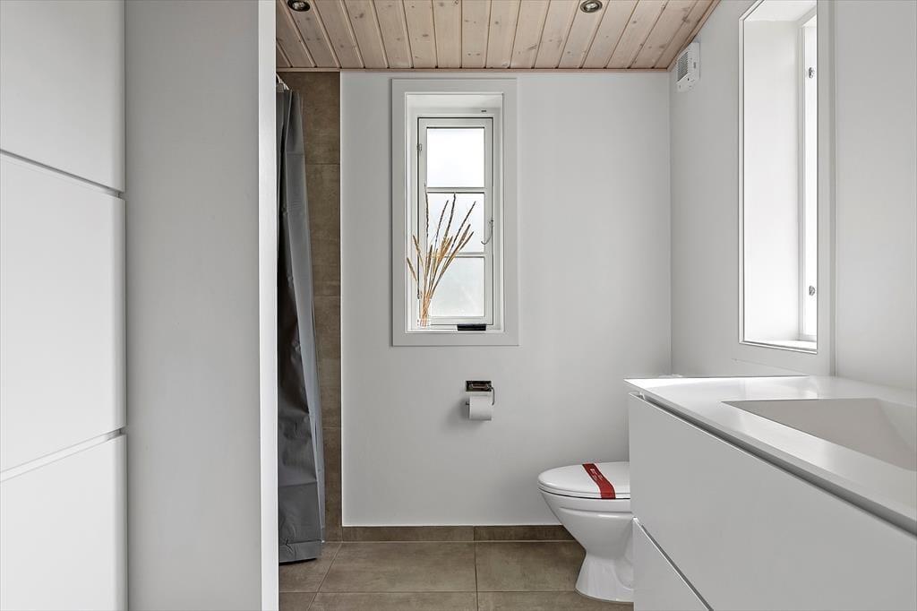 Den nyere del af huset åbner sig med mere lys og luft – her er en moderne stue, hvor dobbeltsengen står i det naturlige lysindfald, samt et lækkert badeværelse. Det enkle og åbne udtryk skaber en rolig kontrast til den mere traditionelle del, og sammen giver de to stilarter huset en særlig, næsten filmisk stemning – som en dansk udgave af “High Chaparral”.