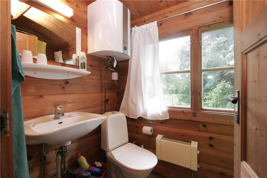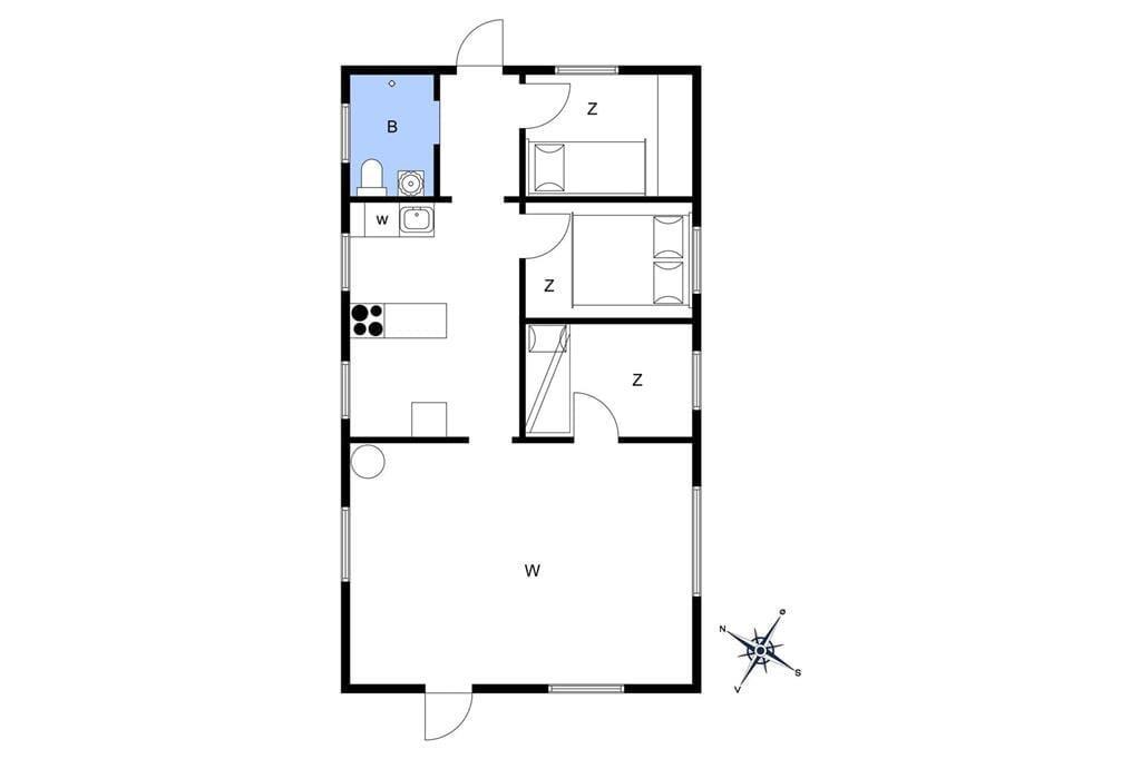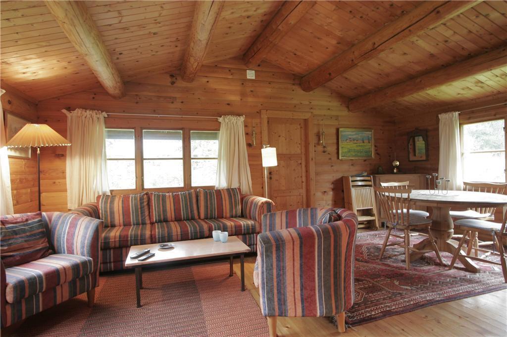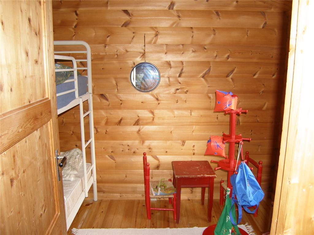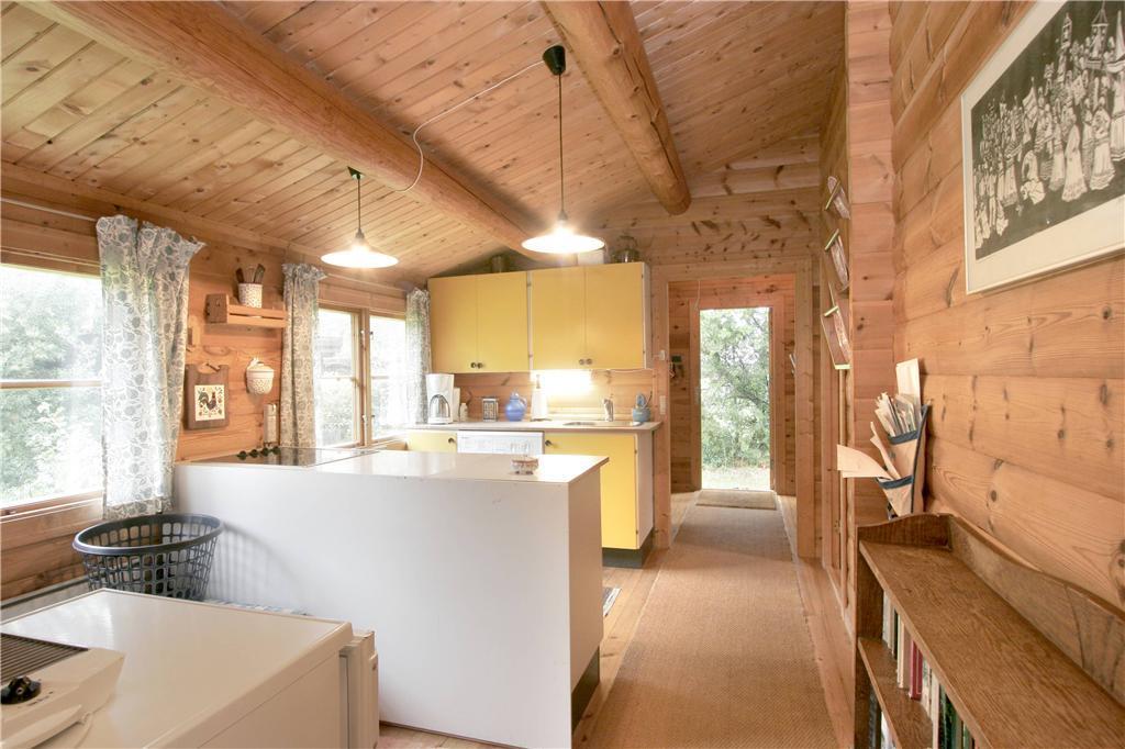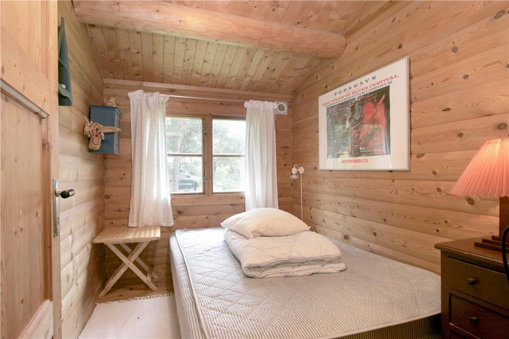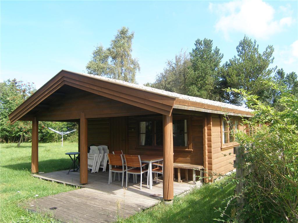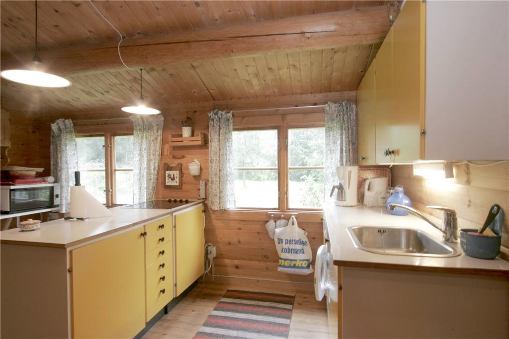Opholdsstue med lofter til kip og synlige bjælker. Stuen indeholder sofagruppe, spisebord og udgang til en overdækket terrasse. Åbent køkken. Badeværelse med brus. Soveværelse med dobbeltseng. Værelse med enkeltseng. Værelse med køjesenge.