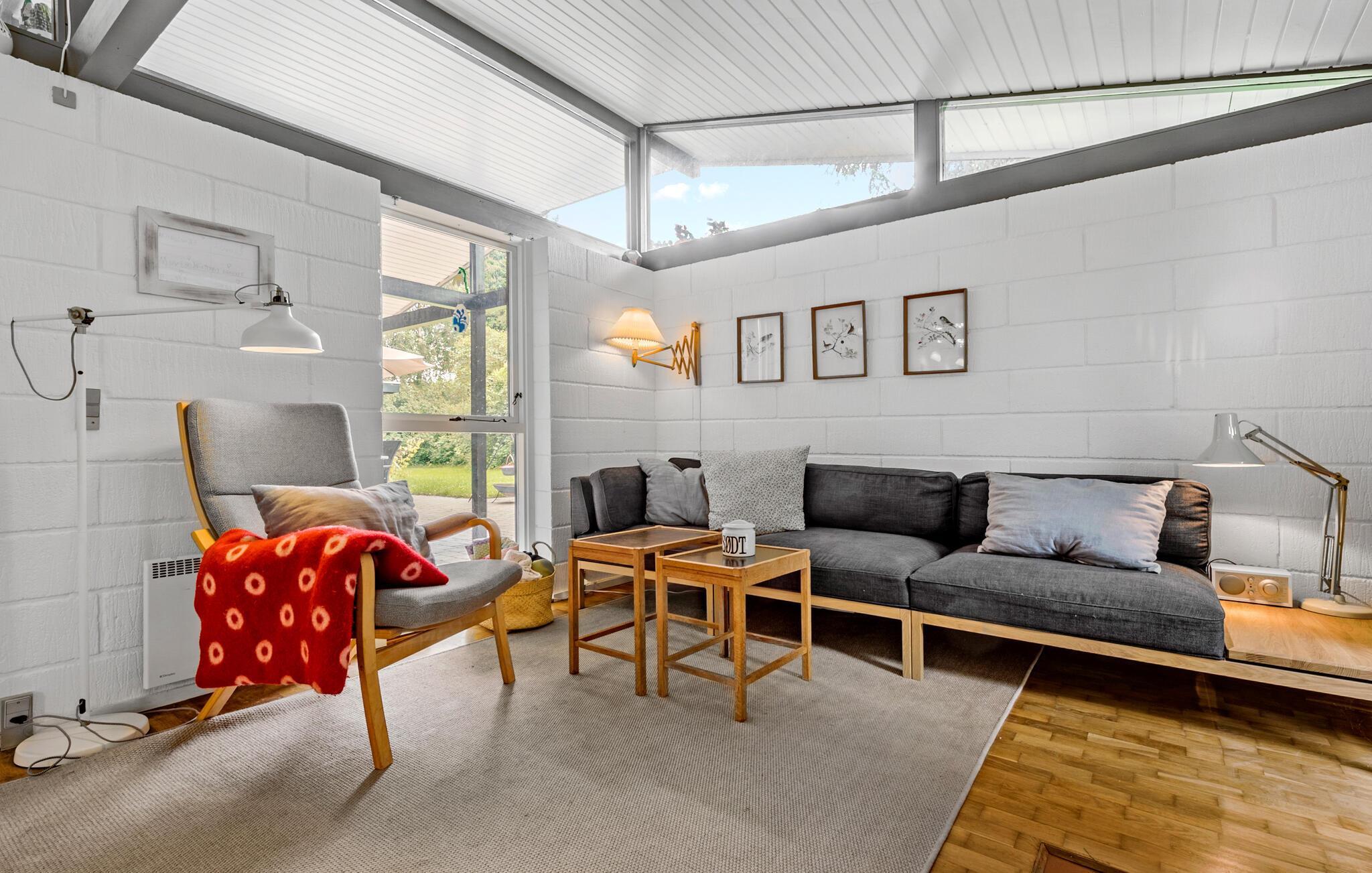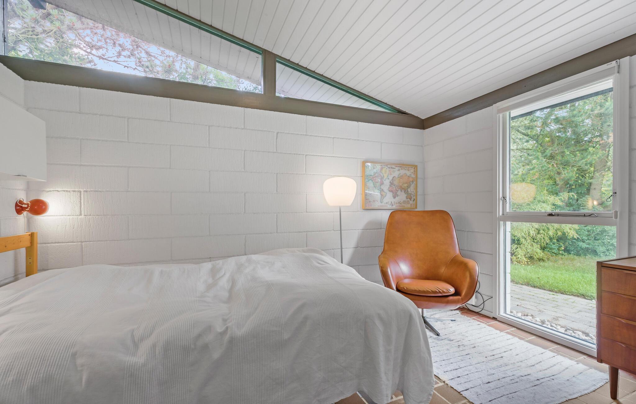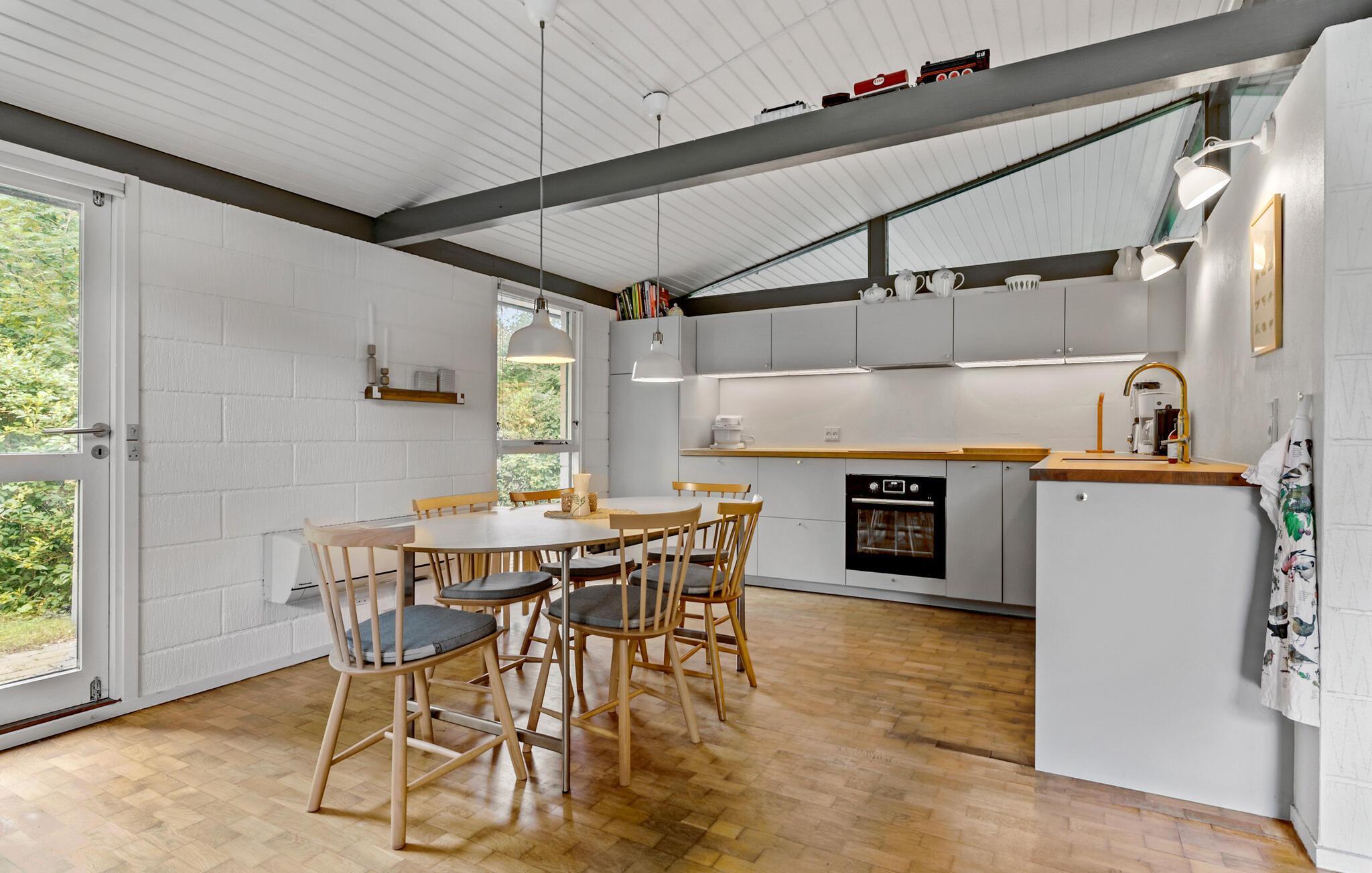 Tag familien med på ferie og slå jer ned i dette komfortable sommerhus. Kombinationen af de hvidmalede paneler i loftet og stenværk på væggene, samt flotte vinduesdetaljer under loftet giver huset en lys og indbydende stemning. Bjælkerne, trægulvet og den hyggelige indretning med brændeovn bringer en hjemlig følelse til huset, og gør det til en oplagt oase for jeres ferie.