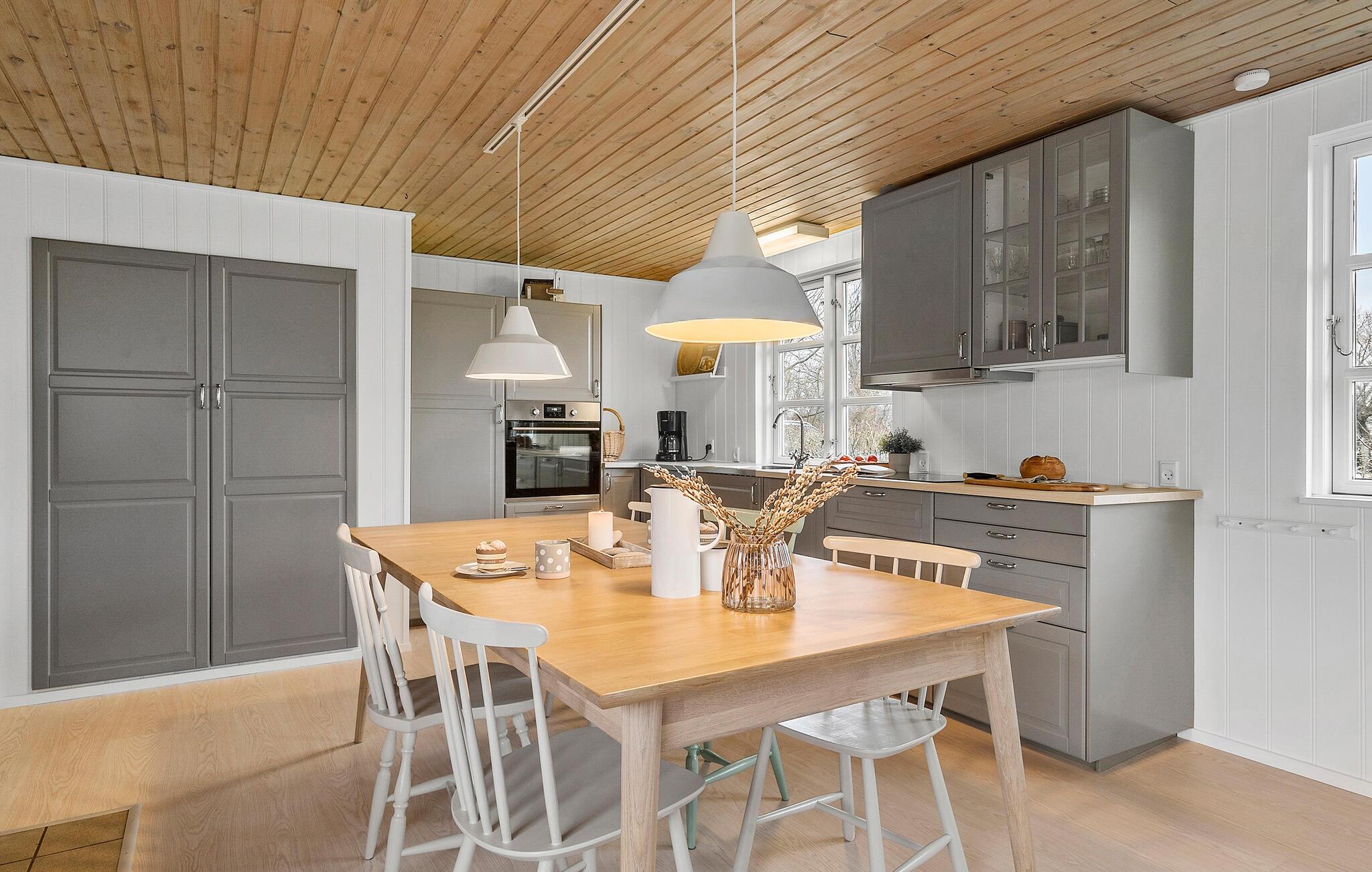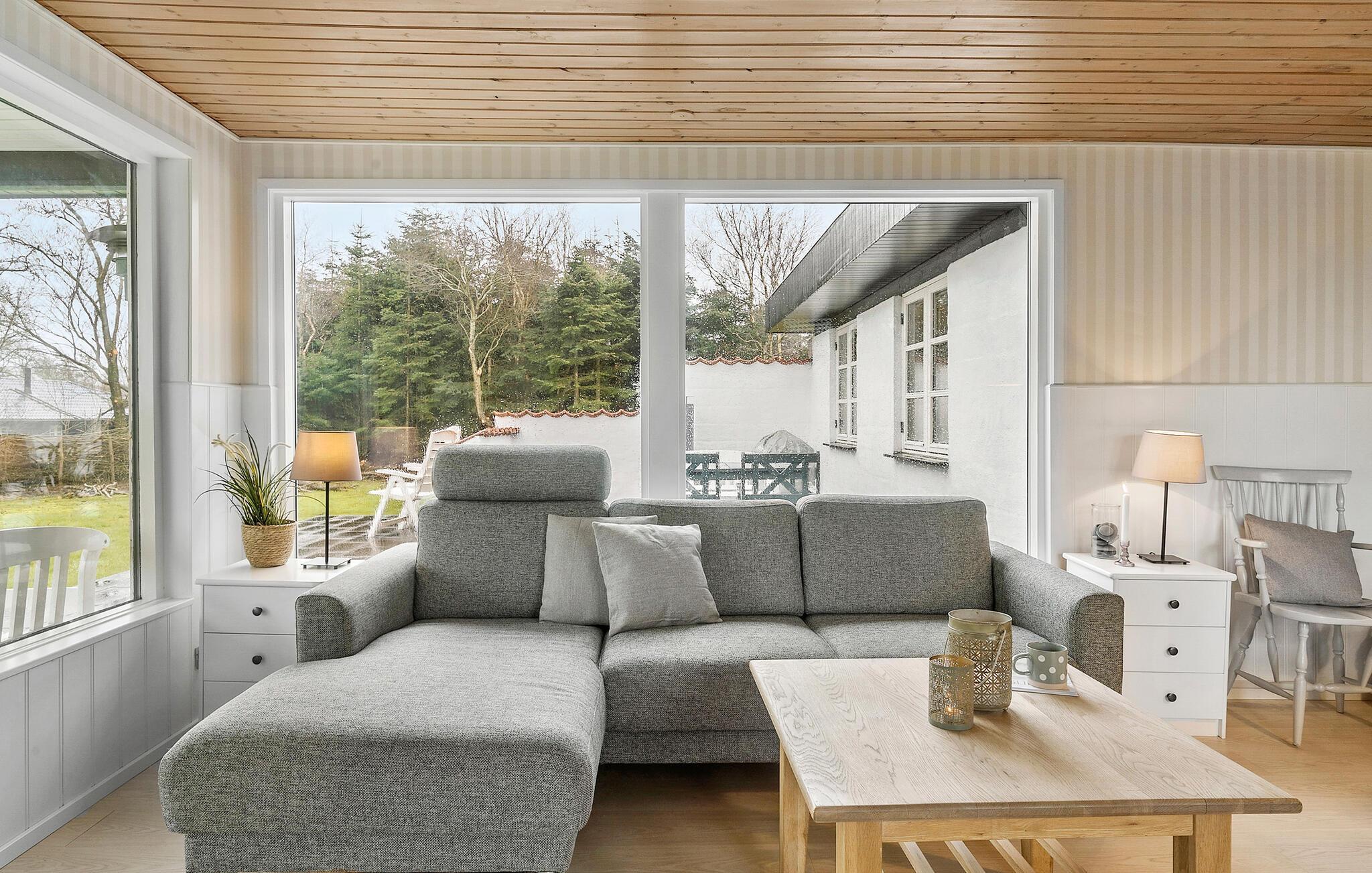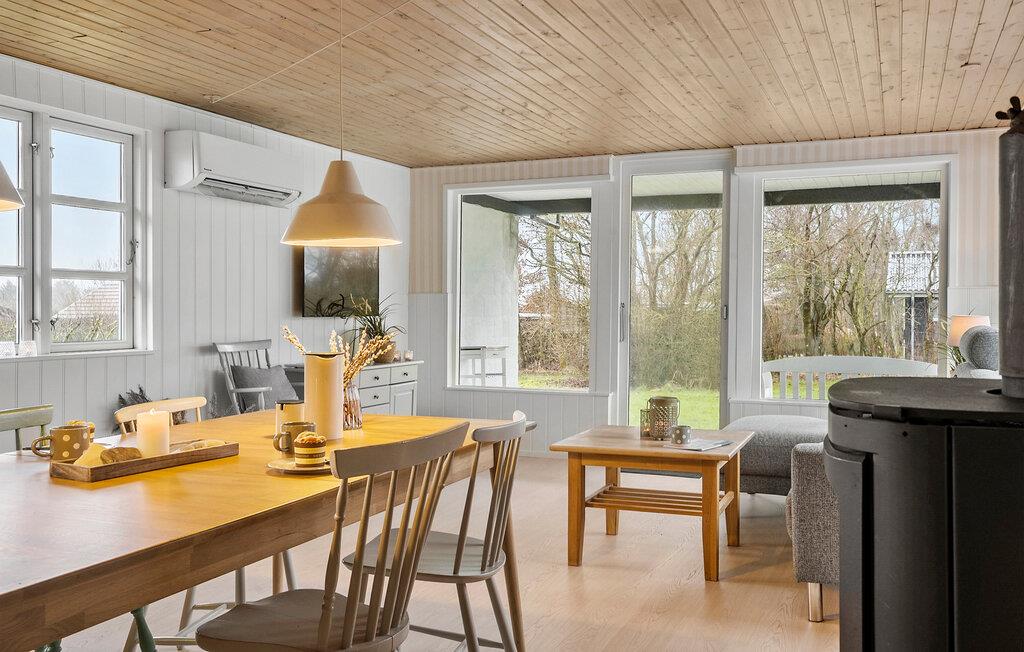 Dette lyse, indbydende sommerhus byder velkommen med en hyggelig indretning og smagfuld løsninger. Tænd op i brændeovnen og glæd jer til hyggelige madlavningsaftener i det åbne køkken efterfulgt af fællesspisning rundt om det indbydende spisebord. Slå jer ned i sofaen og hyg jer med en god film, en spændende bog eller en spilleaften.