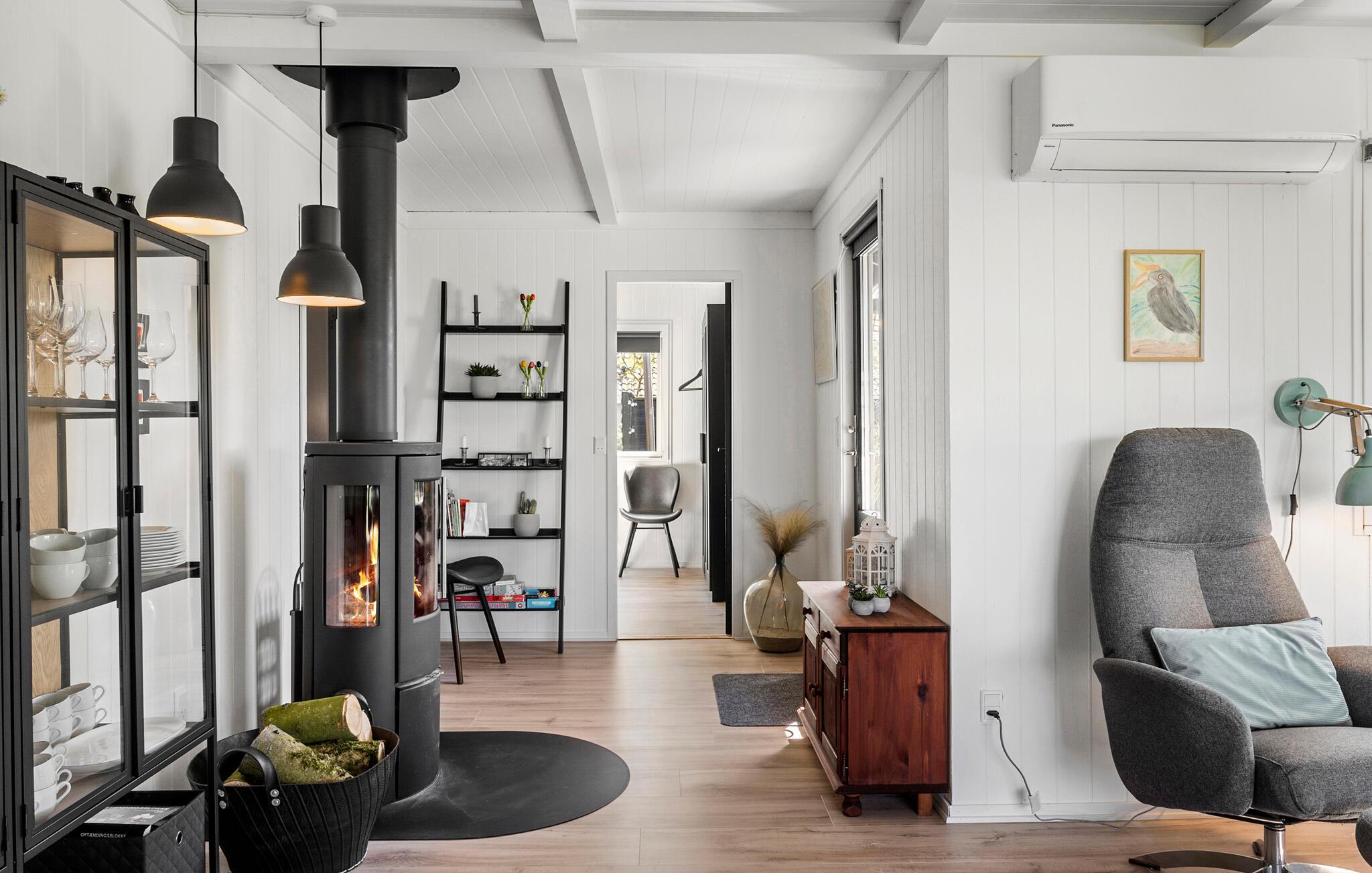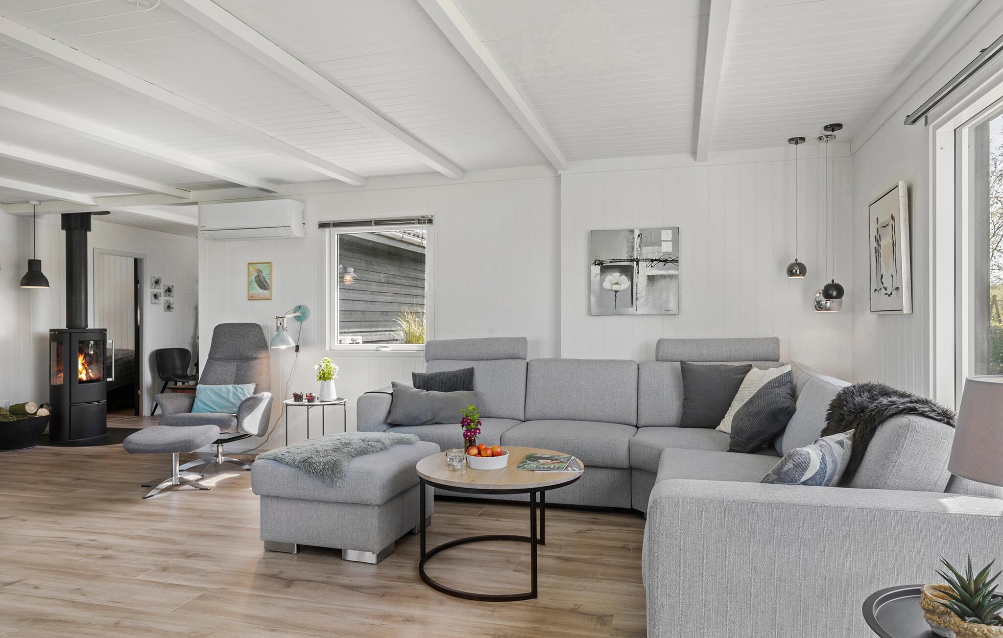 Der er lagt op til nogle afslappende dage i dette komfortable sommerhus, som emmer af ro, kvalitet og feriestemning . Træd ind i den lyse opholdsstue med stilfulde indretningsløsninger, komfortable sofaer og brændeovn. Find jer godt til rette med en bog eller en film, mens I af og til kigger ud på det grønne gennem de store vinduer. Brug den åbne spiseplads til fælles måltider og lav maden i køkkenet med moderne apparater.
