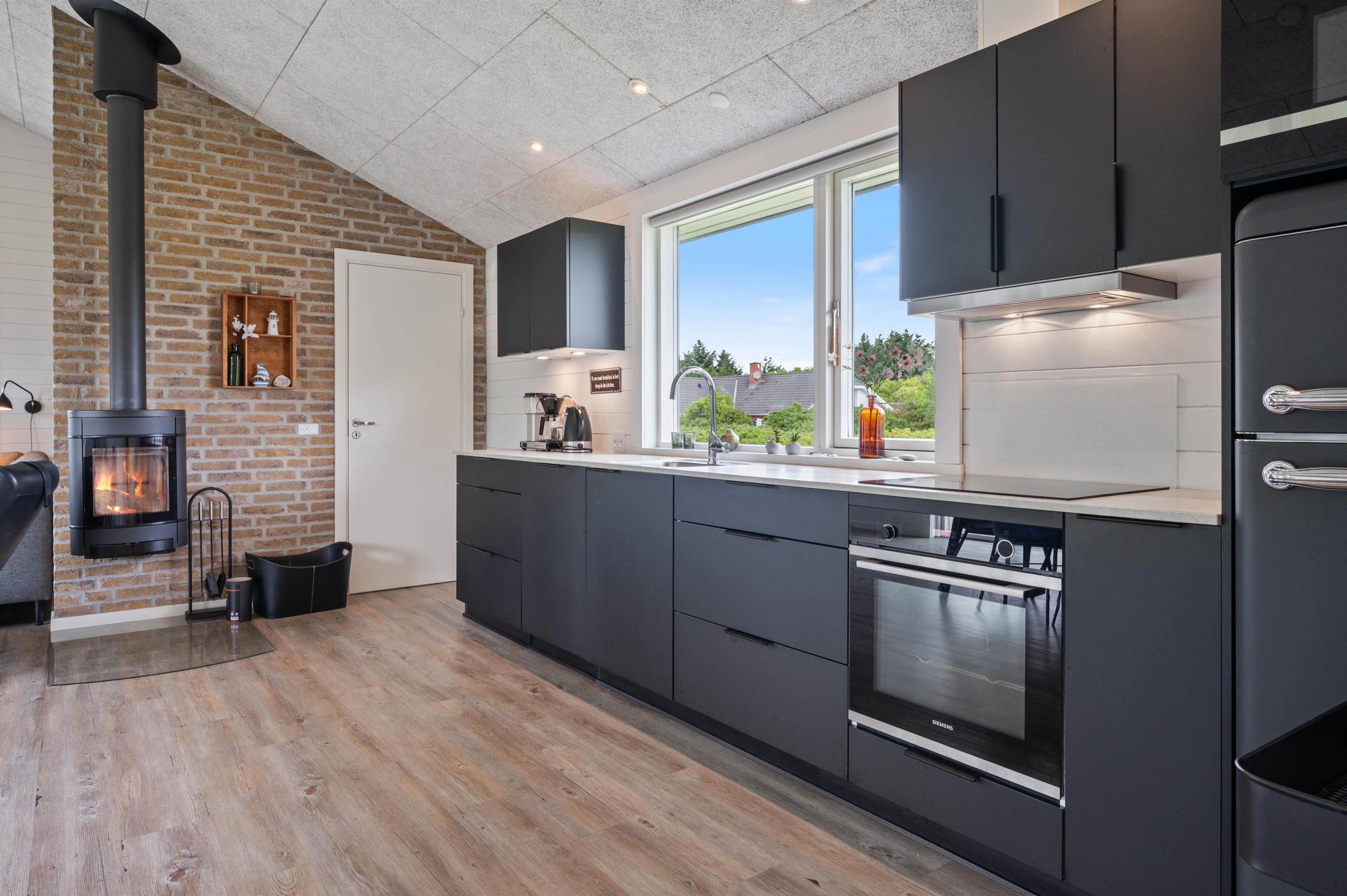 Omgivelserne er lyse og åbne, og det store køkkenalrum med stue er husets hjerte og familiens samlingspunkt på ferien. Det veludstyrede køkken har alt, hvad feriekokken har brug for, inklusiv opvaskemaskine der gør oprydningen efter middagen nem og bekvem, og brændeovnen fylder rummet med varme og hyggelig stemning i årets kolde måneder. Der står også et ekstra køleskab til rådighed.