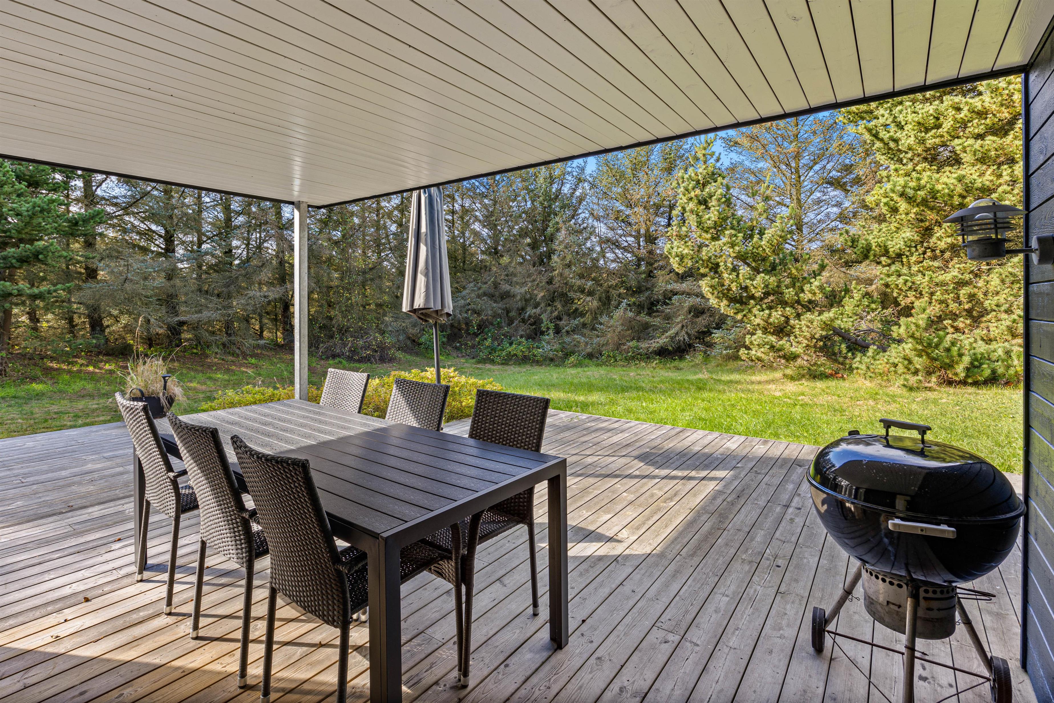 Feriehuset er beliggende på en dejlig, uforstyrret naturgrund på Brunbjergvej 8, og mens I sidder og nyder livet på husets dejlige træterrasse, kan I lytte til fuglekvidrer og en let brise i træernes top i området. De høje grantræer, der omgiver huset, sørger desuden for skøn læ og ugenerede dage i de grønne omgivelser.