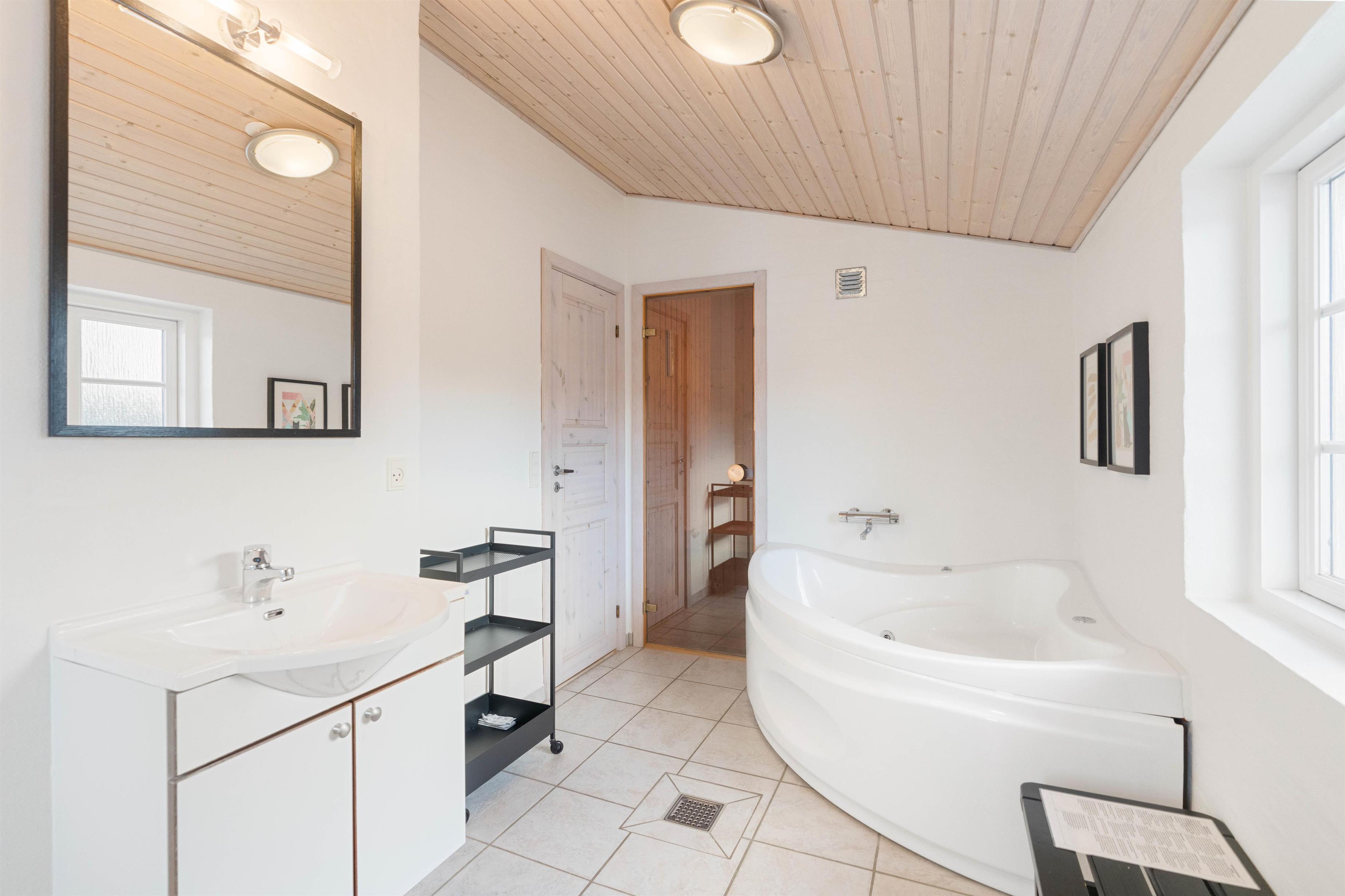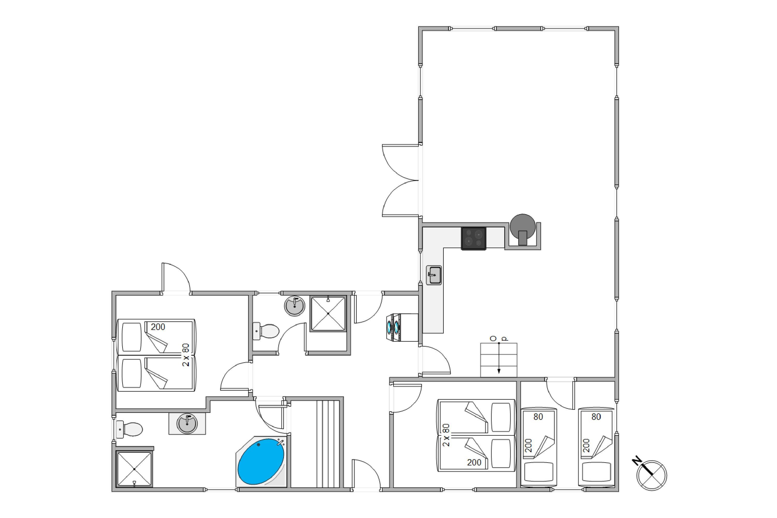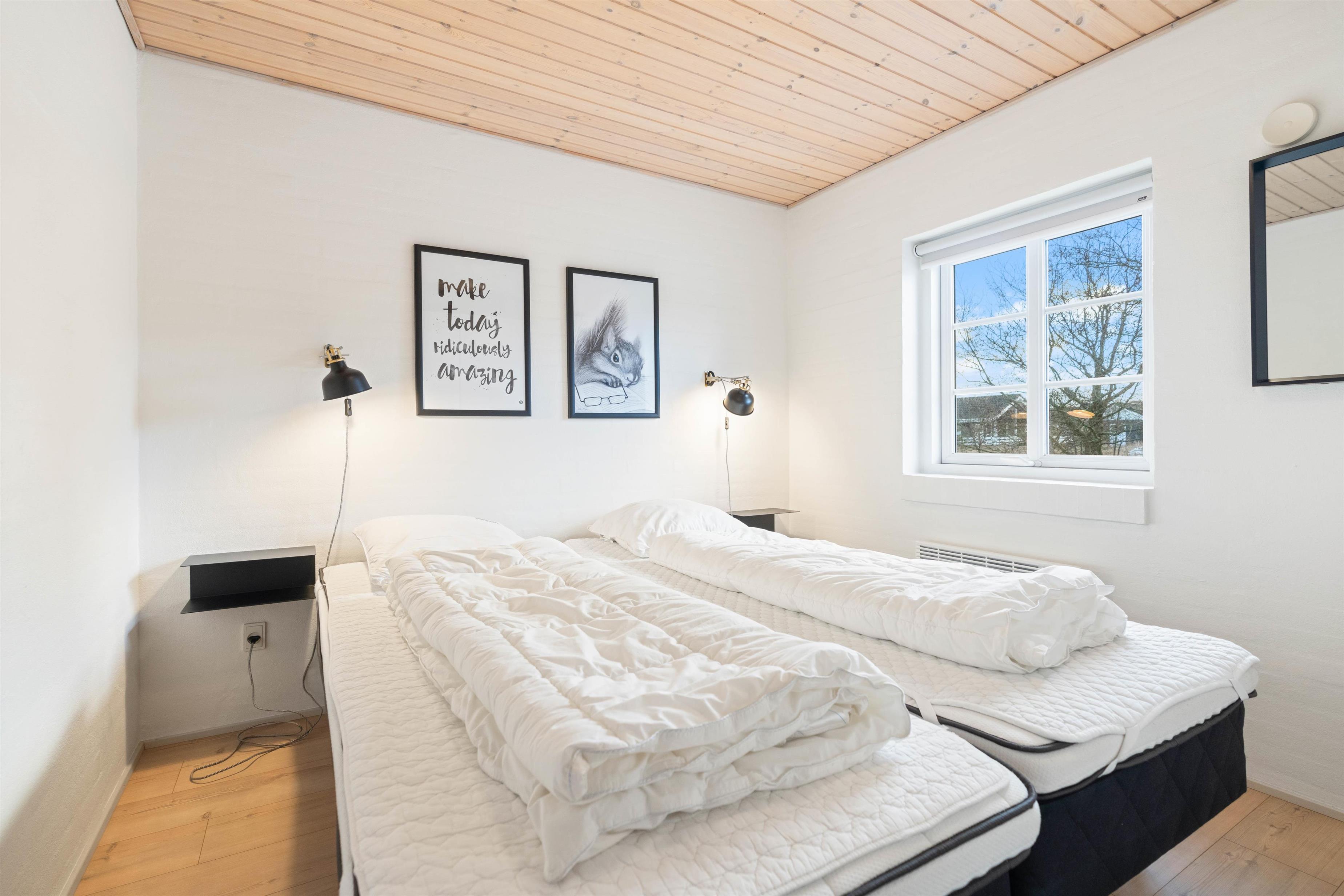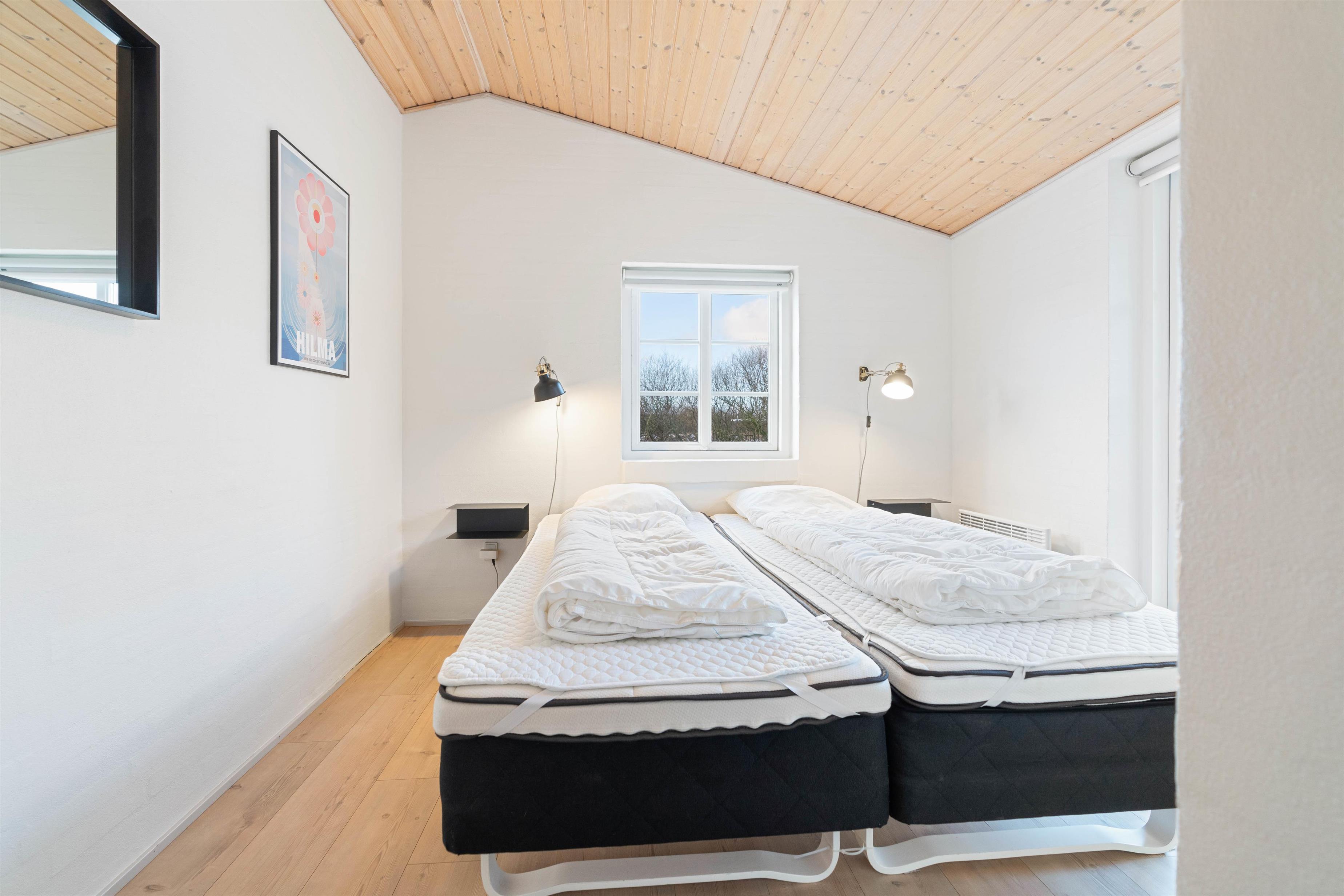 Sommerhuset på Løvsangervej 13 indeholder 3 soverum, heraf 1 er med dobbeltseng og de 2 andre er med enkeltsenge. Der er to dejlige badeværelser der begge er udstyret med gulvvarme, som sikrer lune fødder på køligere dage. Det ene badeværelse har spa og sauna, hvor I kan hygge jer og få ladet batterierne op til ferien.
