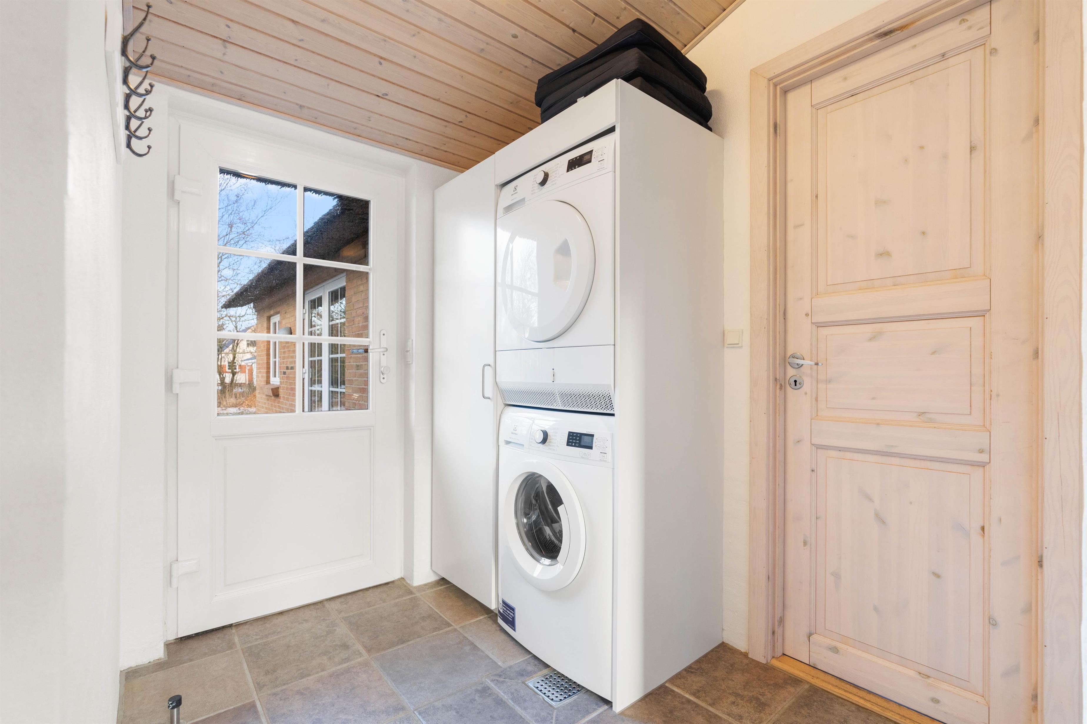 Om aftenen kan I synke ned i sofaen og kigge ud på stjernehimlen gennem de flotte, store vinduespartier, som bidrager til et fantastisk lysindfald i sommerhuset. Brændeovnen i stuen bidrager til den helt rigtige feriefornemmelse og intet er mere hyggeligt end at kigge ind i flammerne om aftenen. Skulle I få brug for at vaske tøj under jeres ophold, så er der vaskemaskine og tørretumbler til fri afbenyttelse.