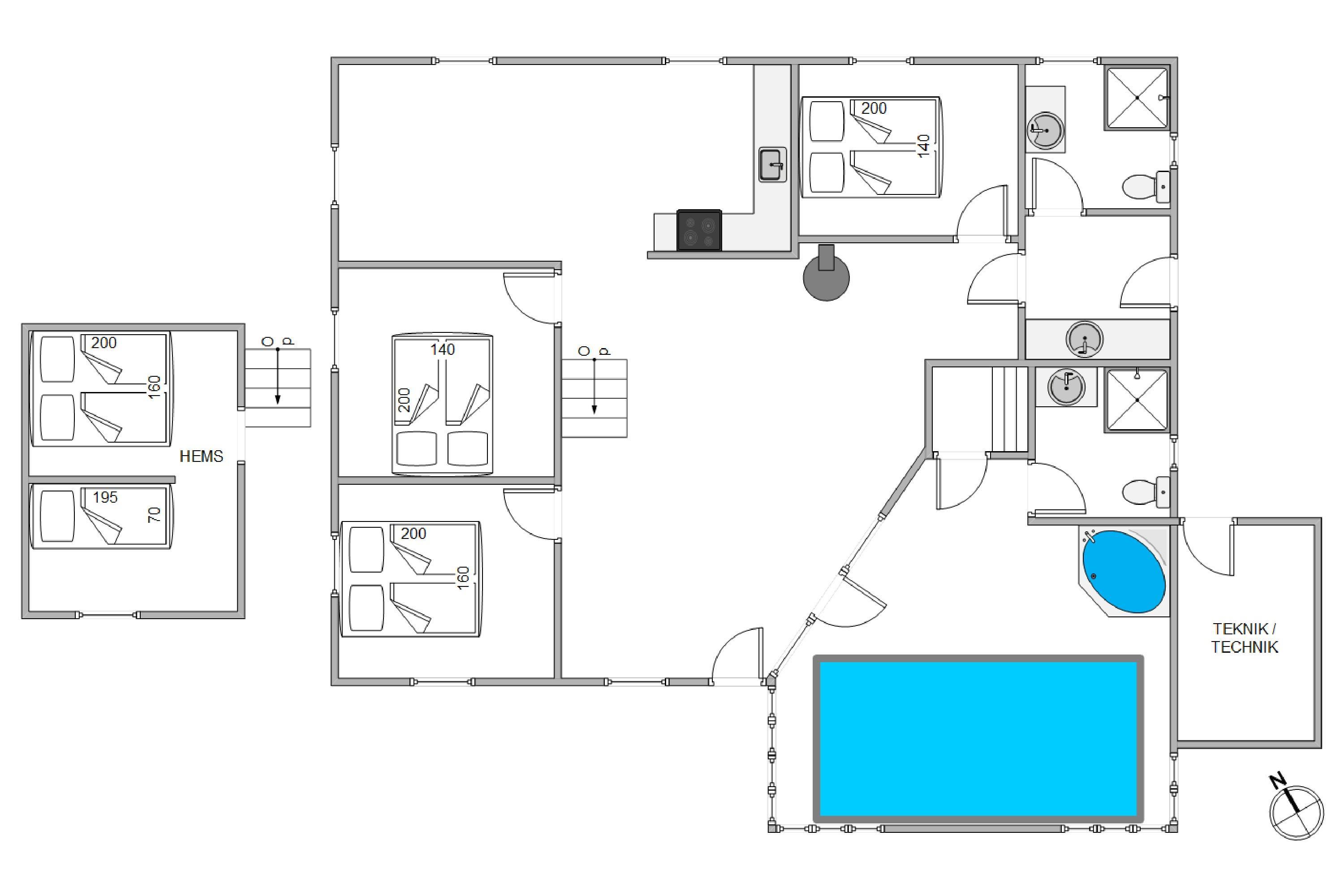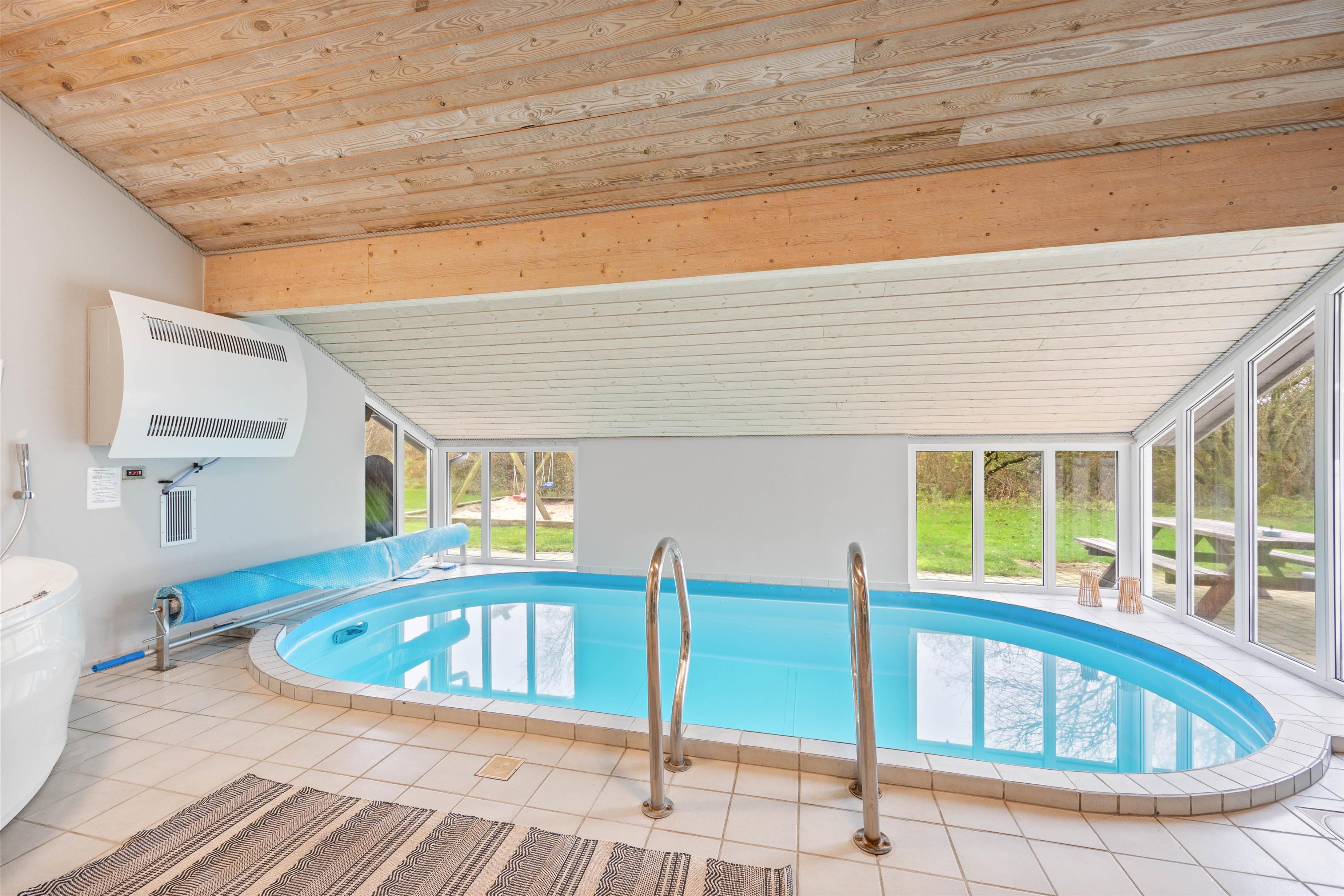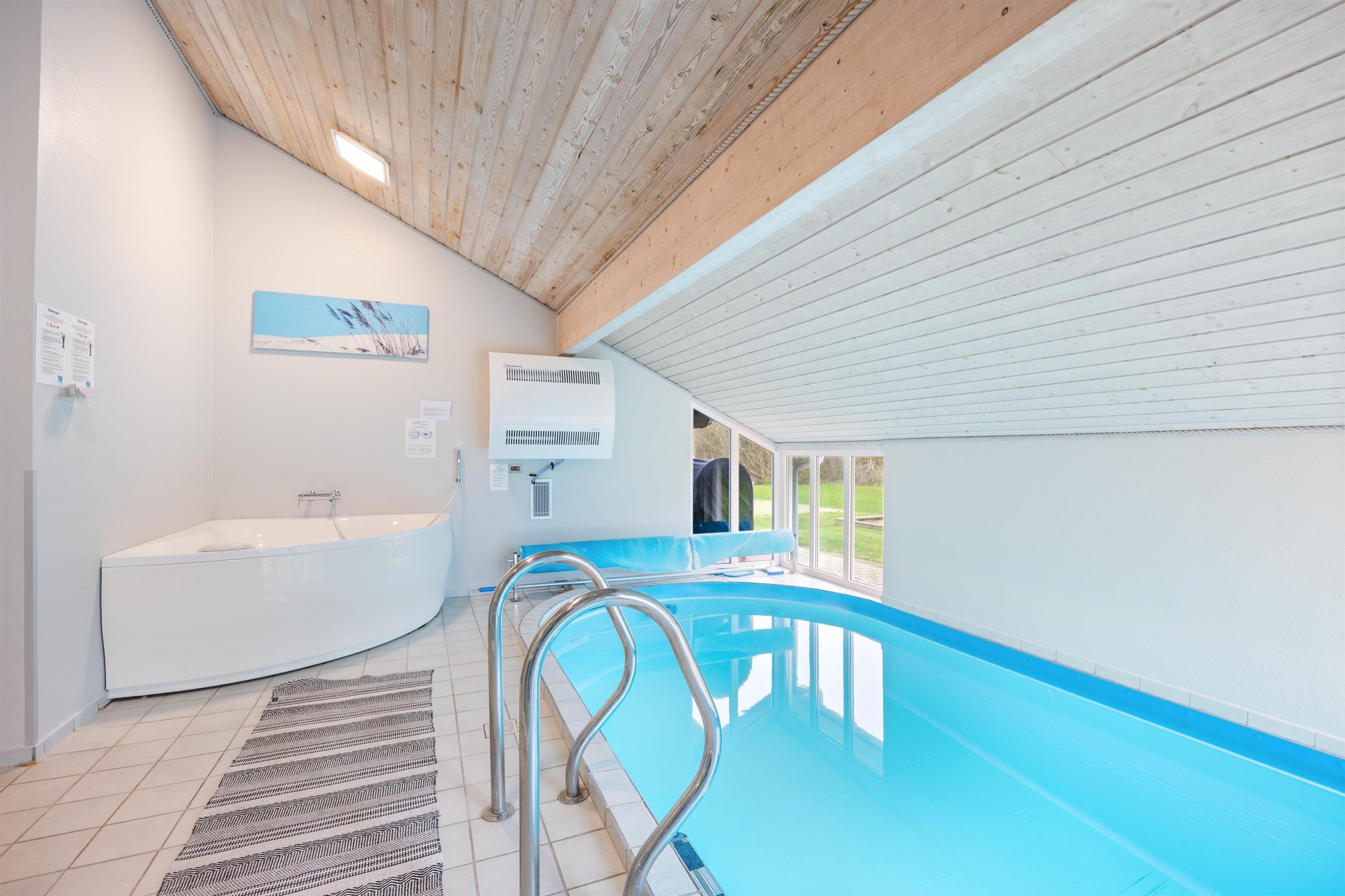 Tag hele famililen med i dette hyggelige, velholdte sommerhus med swimmingpool og god plads til 8 personer på Lodbjerg Hede. Der er 3 værelser med dobbeltseng i stueetagen, og ovenpå er der et værelse med 2 sovepladser. Huset har 2 badeværelser med gulvvarme og bruseniche. Det ene badeværelse er placeret i forbindelse med poolafdelingen, hvor man også finder husets sauna og hjørnespa. Køkkenet er fra 2013, og her er der bl.a. en opvaskemaskine, en mikroovn og en fryser med 40 L. I stuen er der en hyggelig brændeovn, fladskærms-TV med paraboltilslutning, DVD-afspiller, radio m/CD-afspiller og naturligvis internet. Der er desuden et ekstra TV ovenpå, og sommerhuset har også en vaskemaskine og en tørretumbler til rådighed.