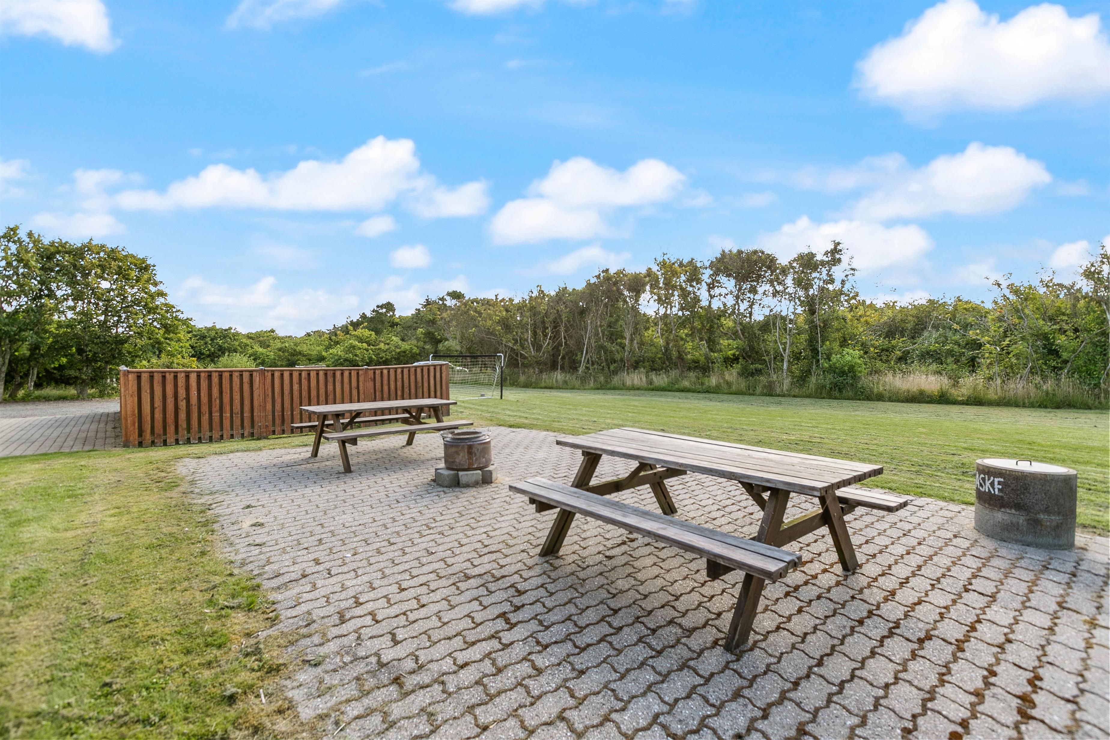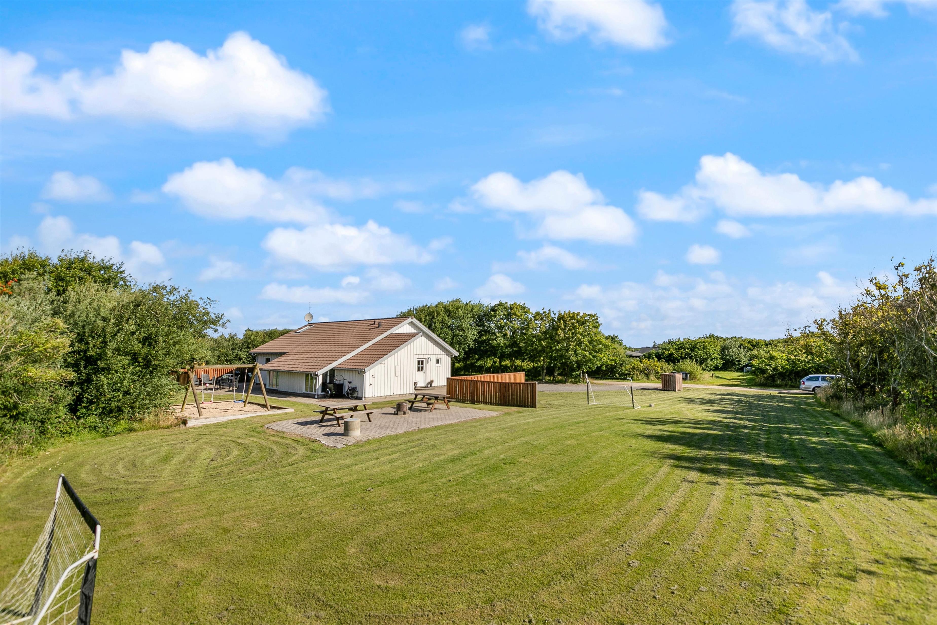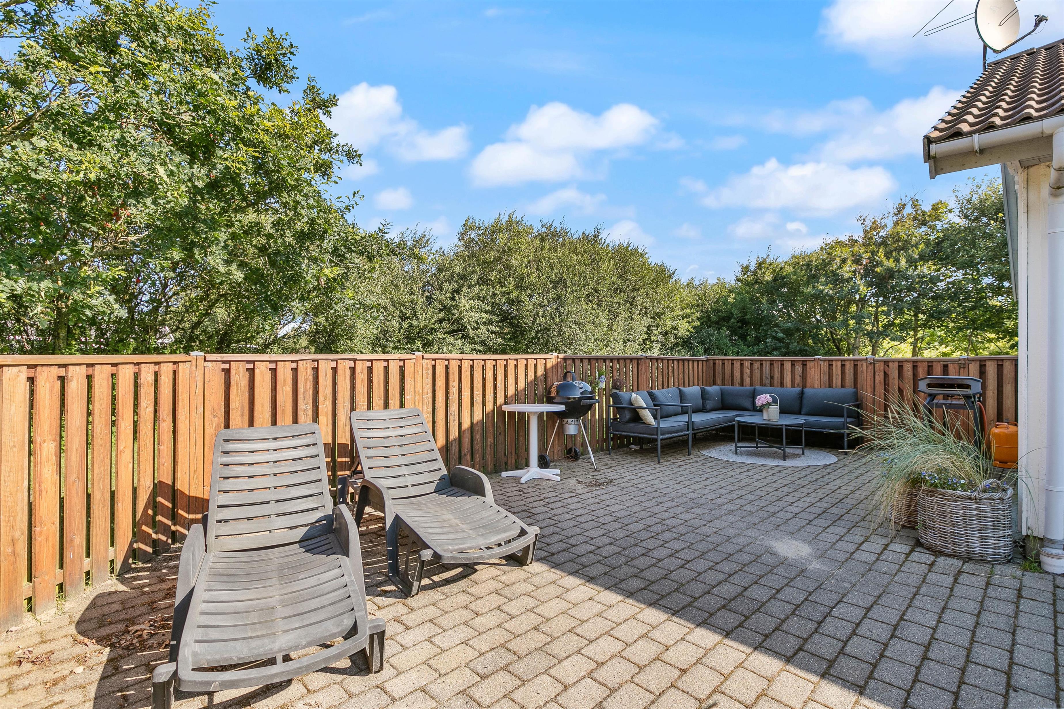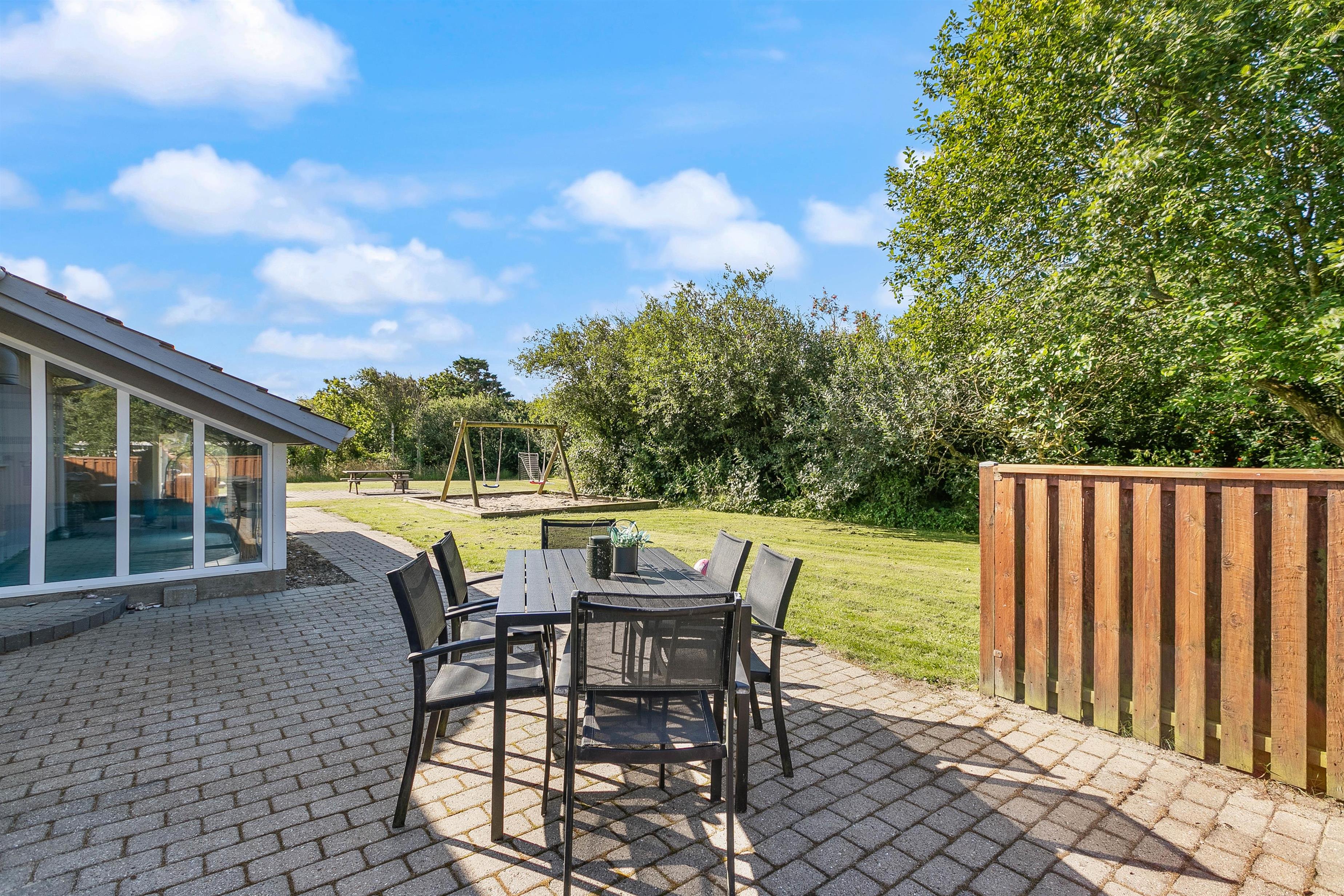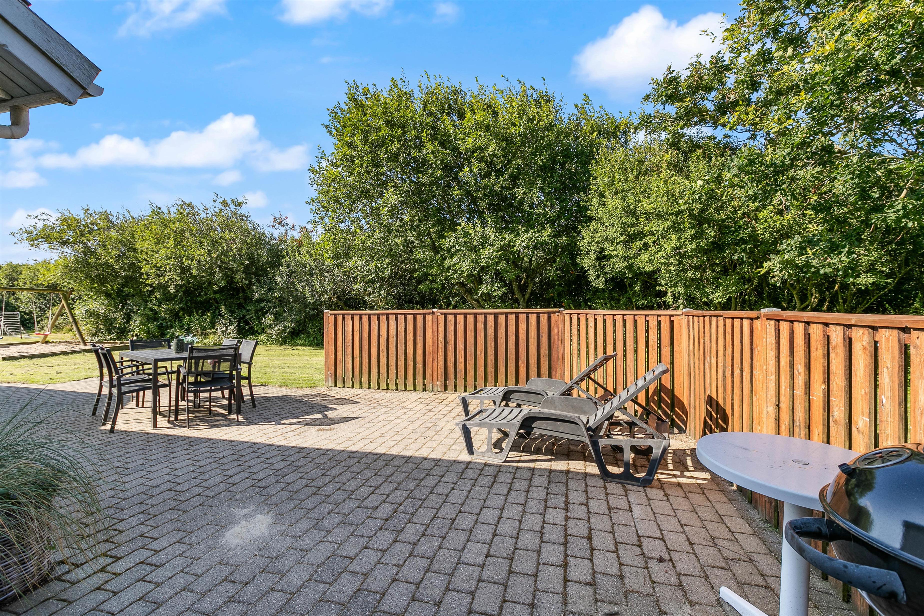 Dette sommerhus er perfekt til familieferier, da det er beliggende på en fredelig plænegrund, som er godt afskærmet af træer næsten hele vejen rundt. Derfor er gode muligheder for leg og boldspil på græsplænen, og de voksne kan nemt følge med i børnenes leg fra terrassen. Der er også et fodboldmål. På grunden er der også et gyngestativ og en sandkasse til de små samt et bålsted, som kan udnyttes til hyggelige aftner med snobrød eller skumfiduser. Terrassen går hele vejen rundt om huset, men er størst mod øst, syd, og mod sydvest, hvor den også er delvist lukket. Så her er det muligt at tilbringe hyggelige dage og grillaftener med familie og venner.