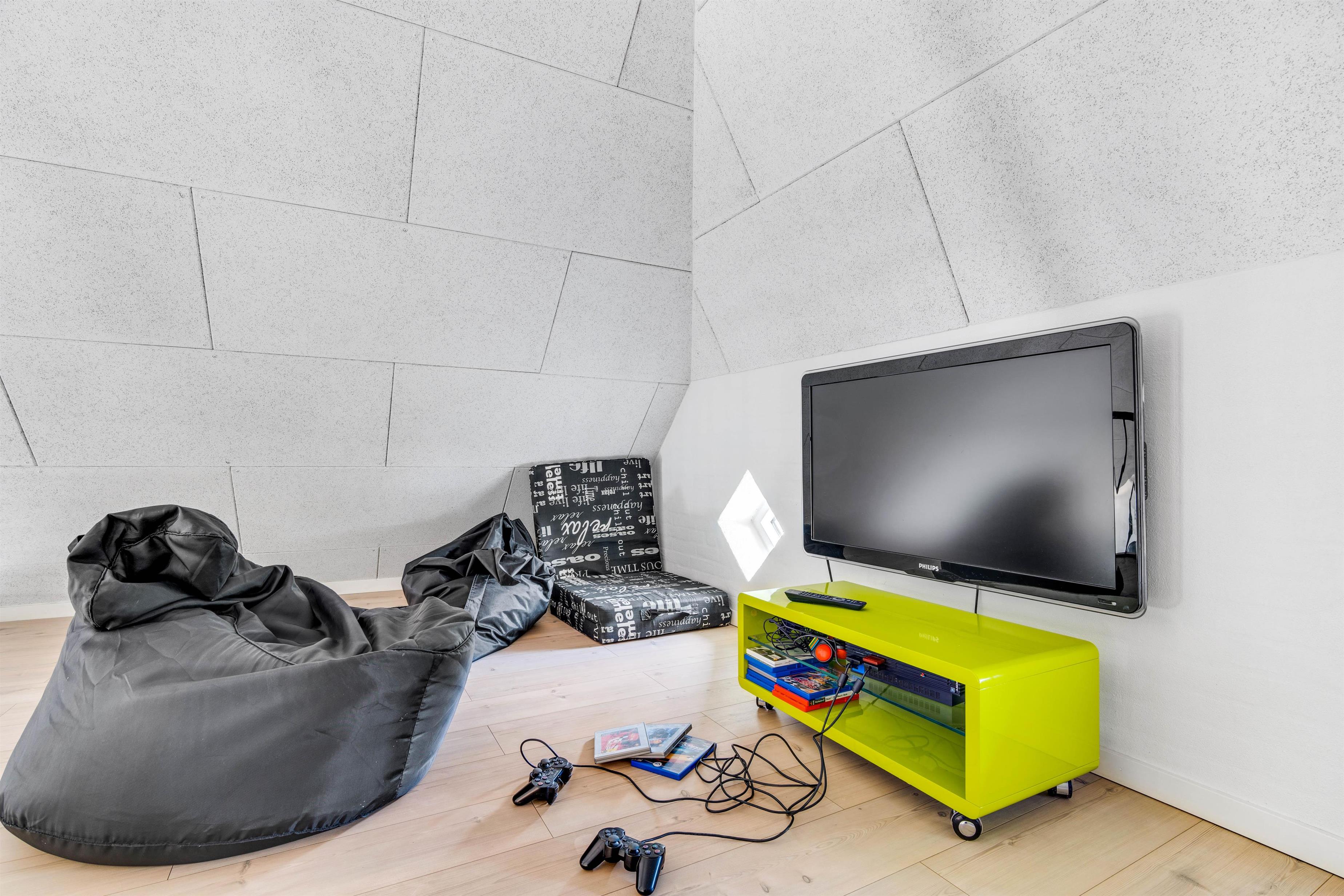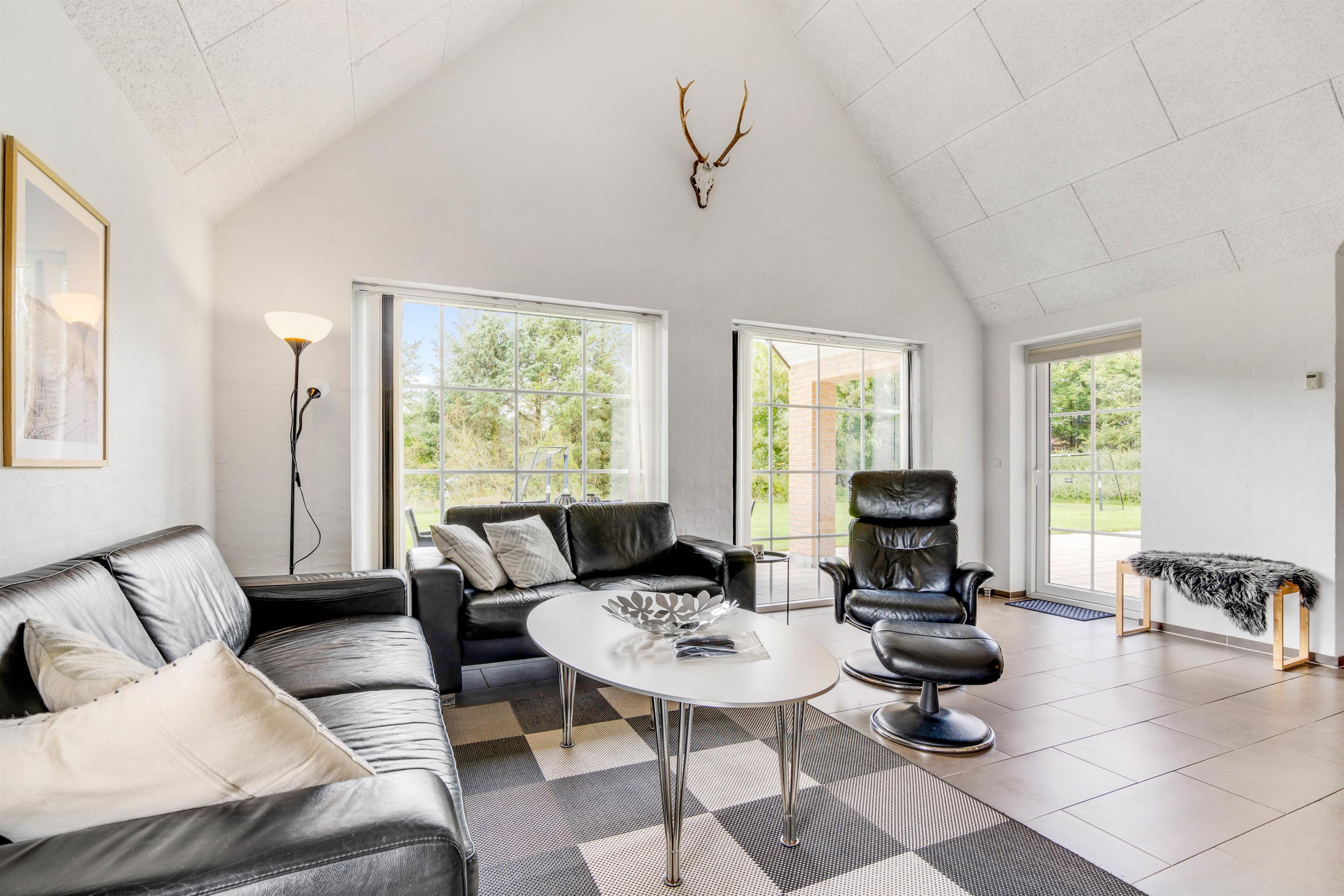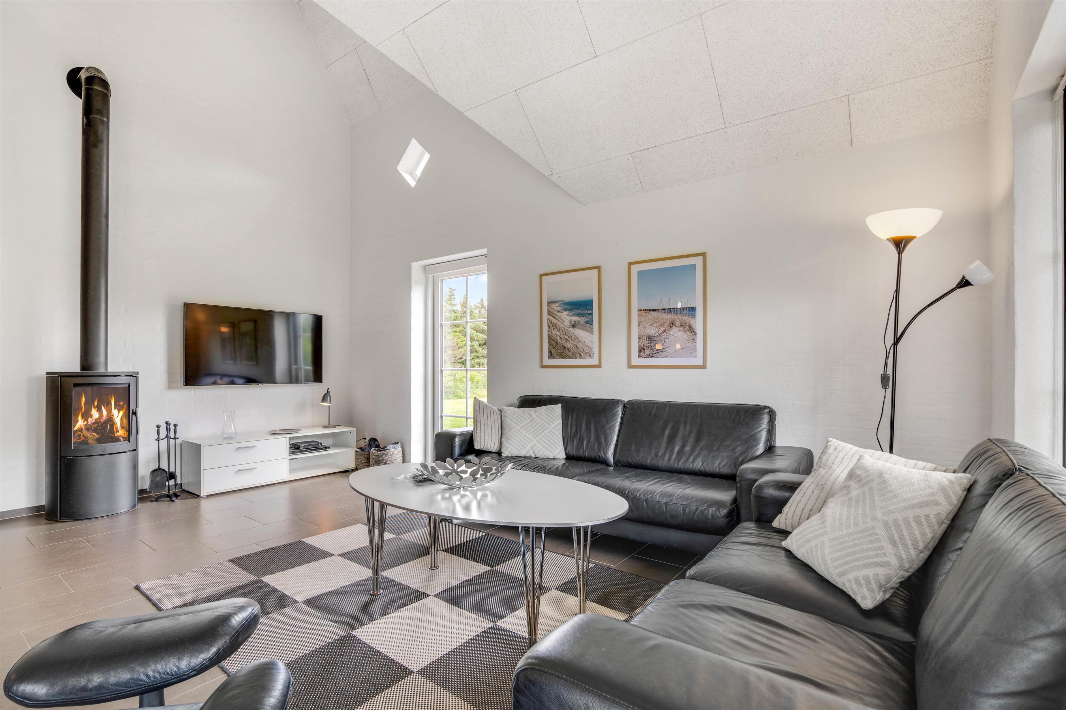 Stuen er smagfuldt indrettet og med dejligt flisegulv. Der er bl.a. et stort fladskærms-TV samt en DVD-afspiller. Her er desuden højt til loftet og lyst, hvilket er med til at skabe en dejlig stemning. Den gode og dejlige stemning kan suppleres med brændeovnen, der med sit knitrende flammehav kan tilføje masser af varme og hygge.