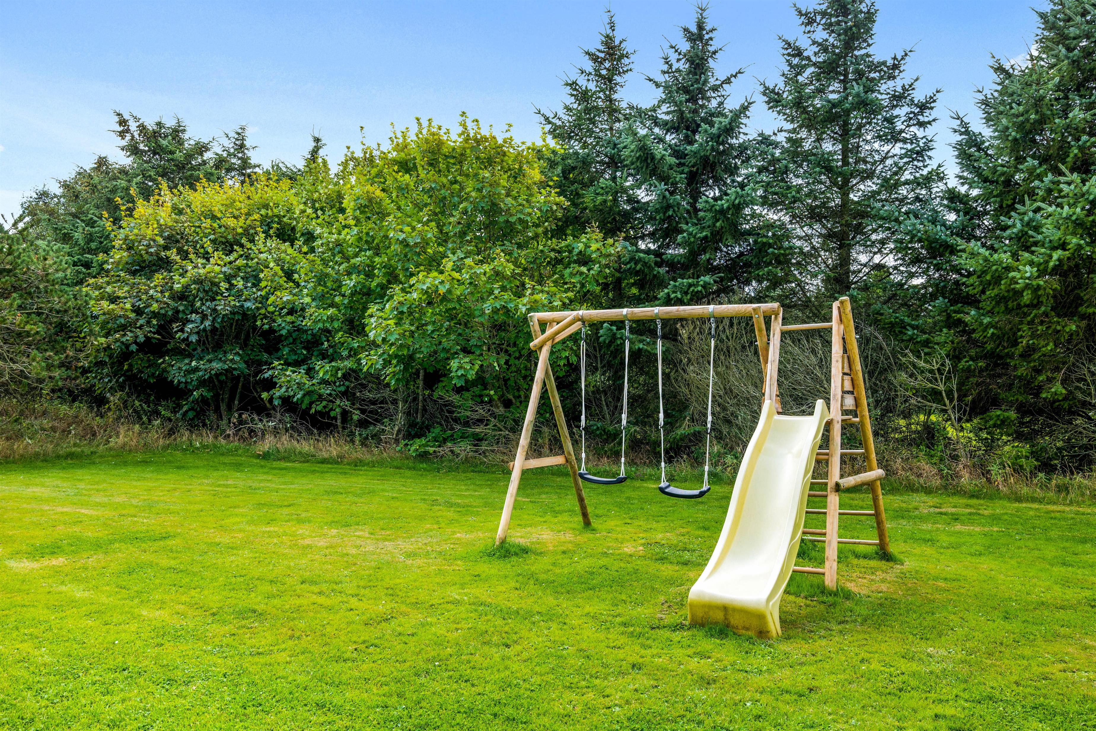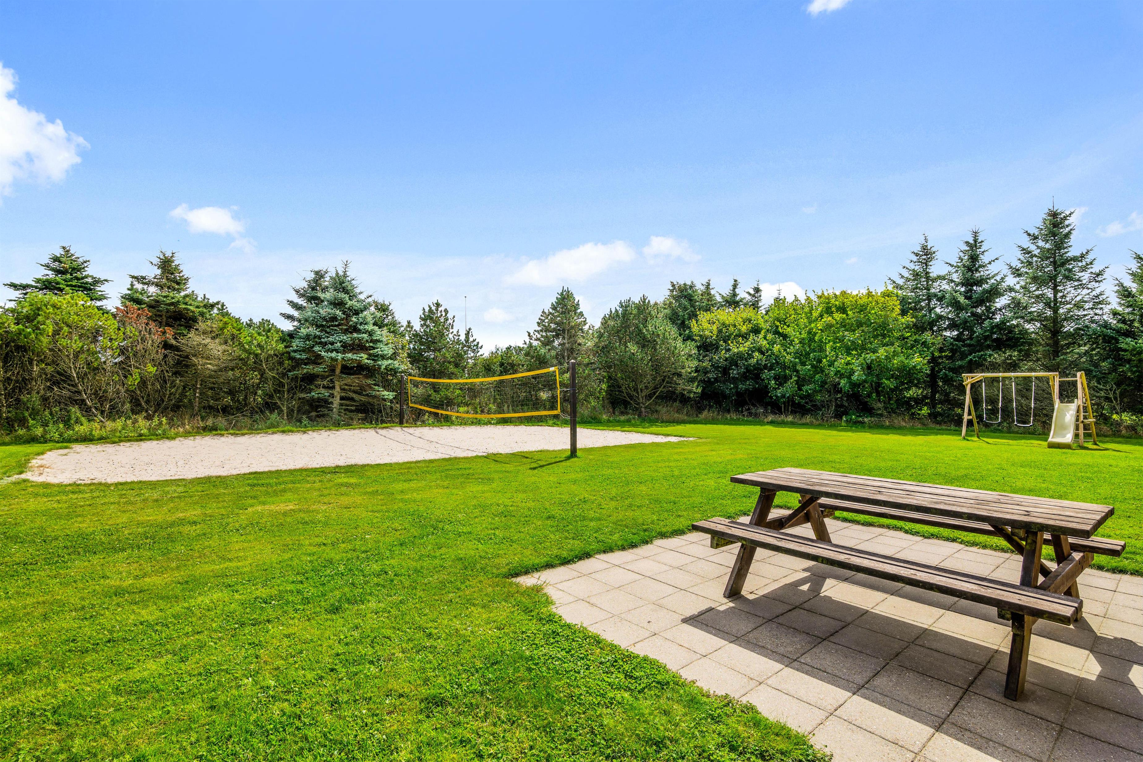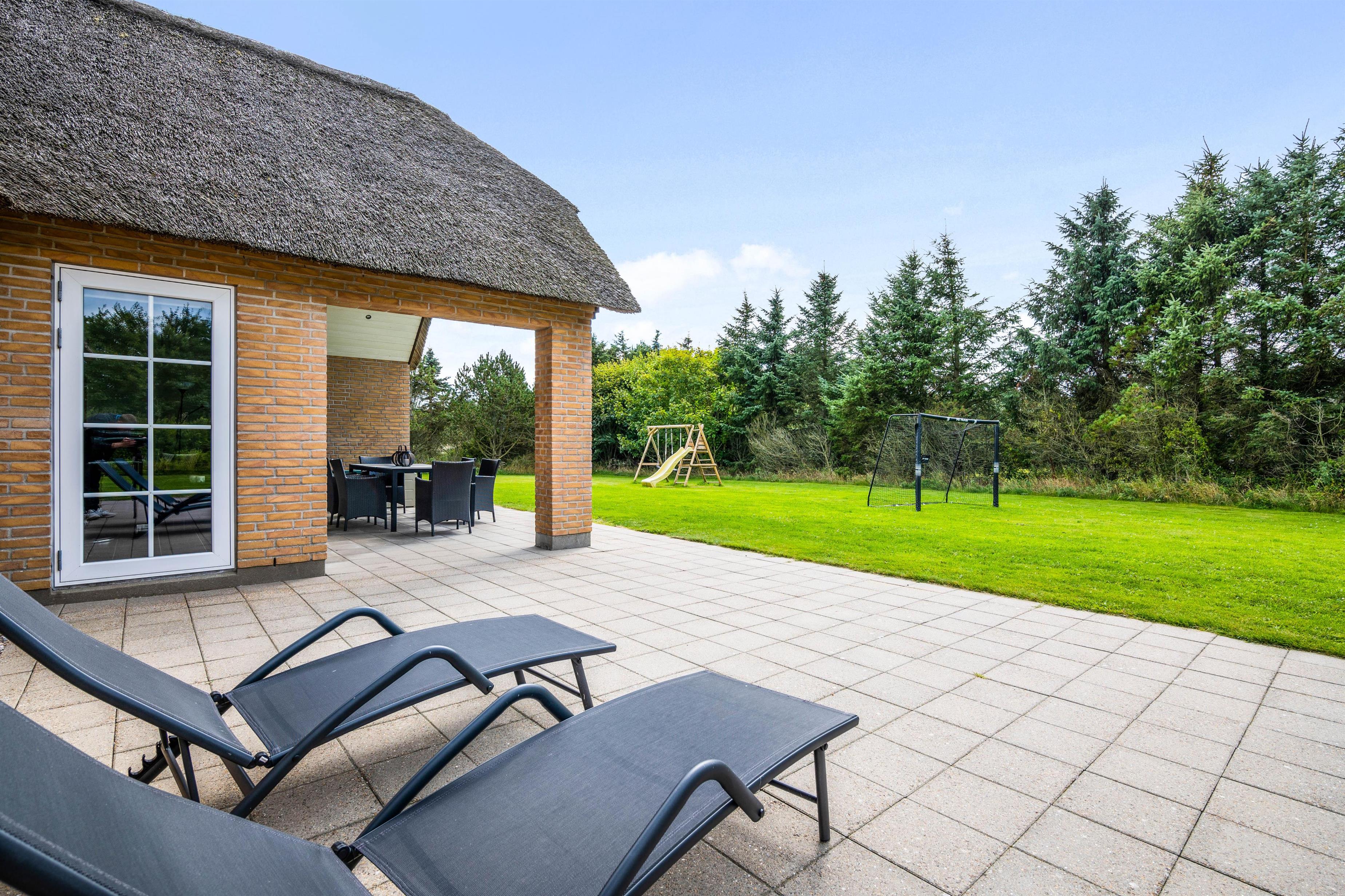 Feriehuset har flere skønne terrasser, hvor der kan findes både sol og læ det meste af dagen. Endvidere er der en 15 m2 overdækket terrasse. Grunden er en kombination af fri natur og græsplæne, som giver gode muligheder for boldspil og leg. For eksempel er der på grunden både gyngestativ, en fodboldbane og en beach volley-bane. Både hus og grund er særdeles børne- og hundevenlig.